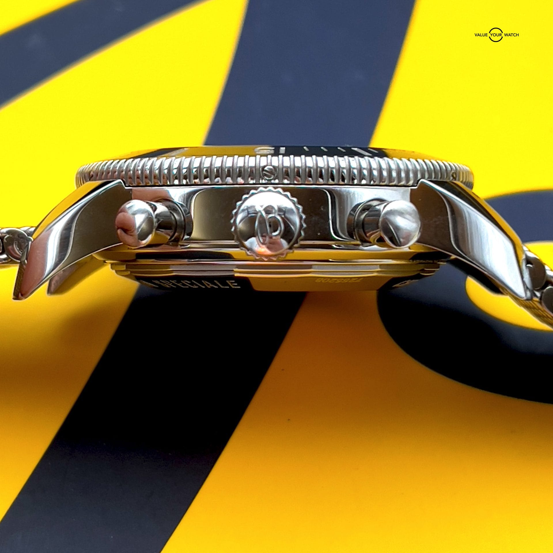 The Superocean Heritage II Chronograph draws inspiration from vintage dive watches, featuring a timeless design with a black dial, oversized luminous hour markers, and hands. The 44mm stainless steel case, coupled with a black ceramic bezel, exudes an elegant and sporty aesthetic. This watch is a testament to Breitling’s commitment to preserving the legacy of iconic dive timepieces.