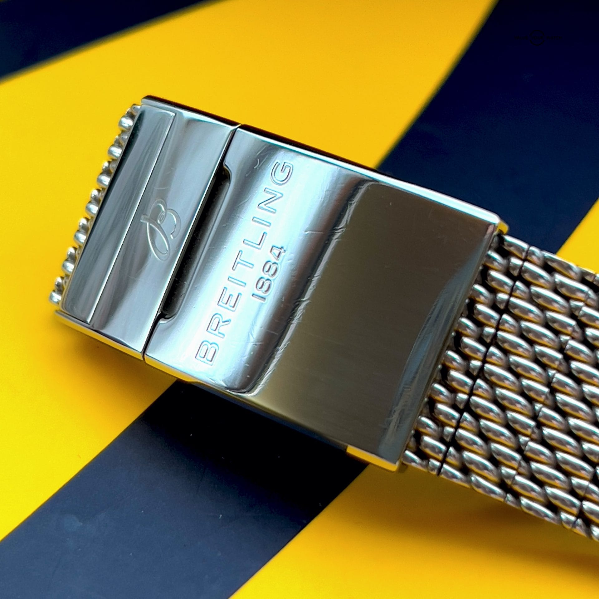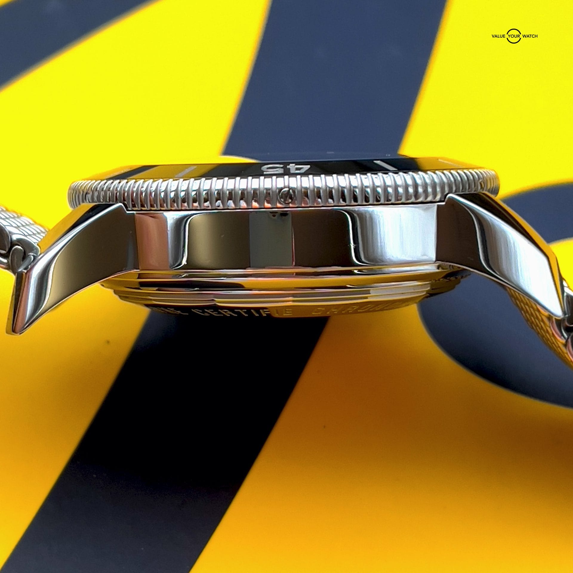 The Breitling Superocean Heritage II Chronograph is one of Breitling’s most popular models. The ceramic bezel is a huge upgrade from the original aluminum design and the steel mesh bracelet is as comfortable as it is sleek. This model is 44mm, and will fit up to an 8.25″ wrist with all of the links installed
