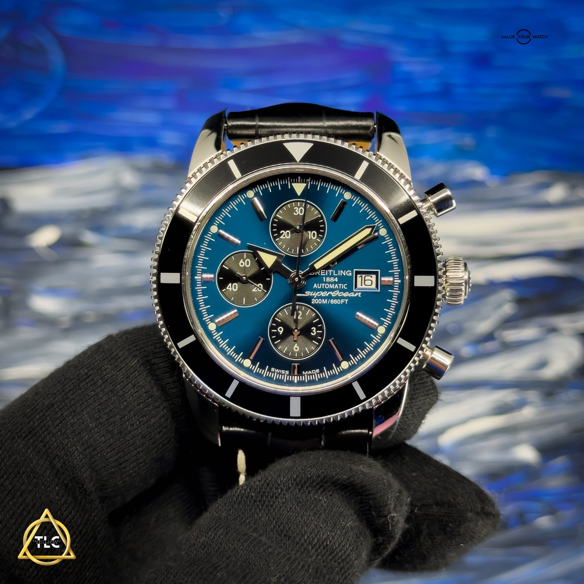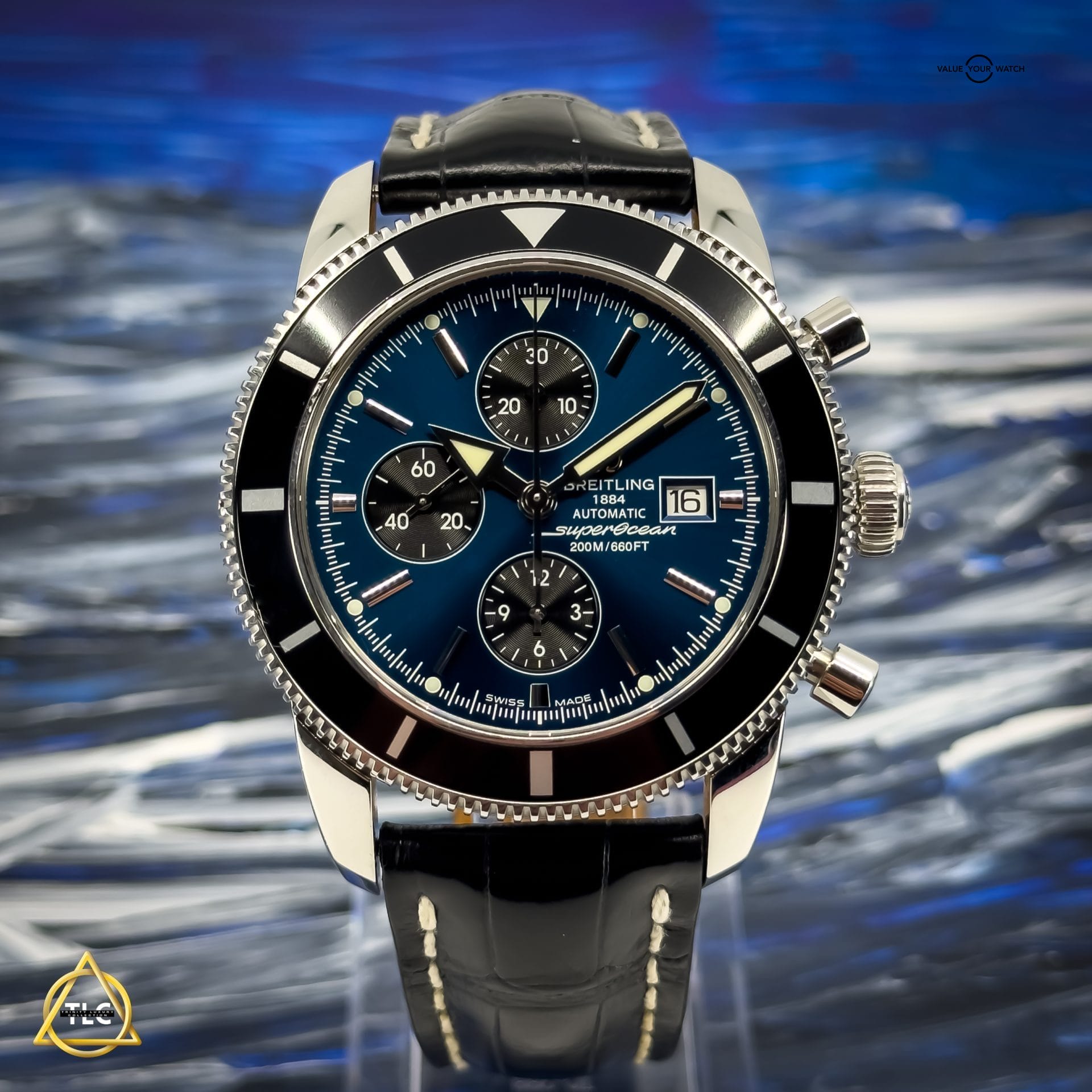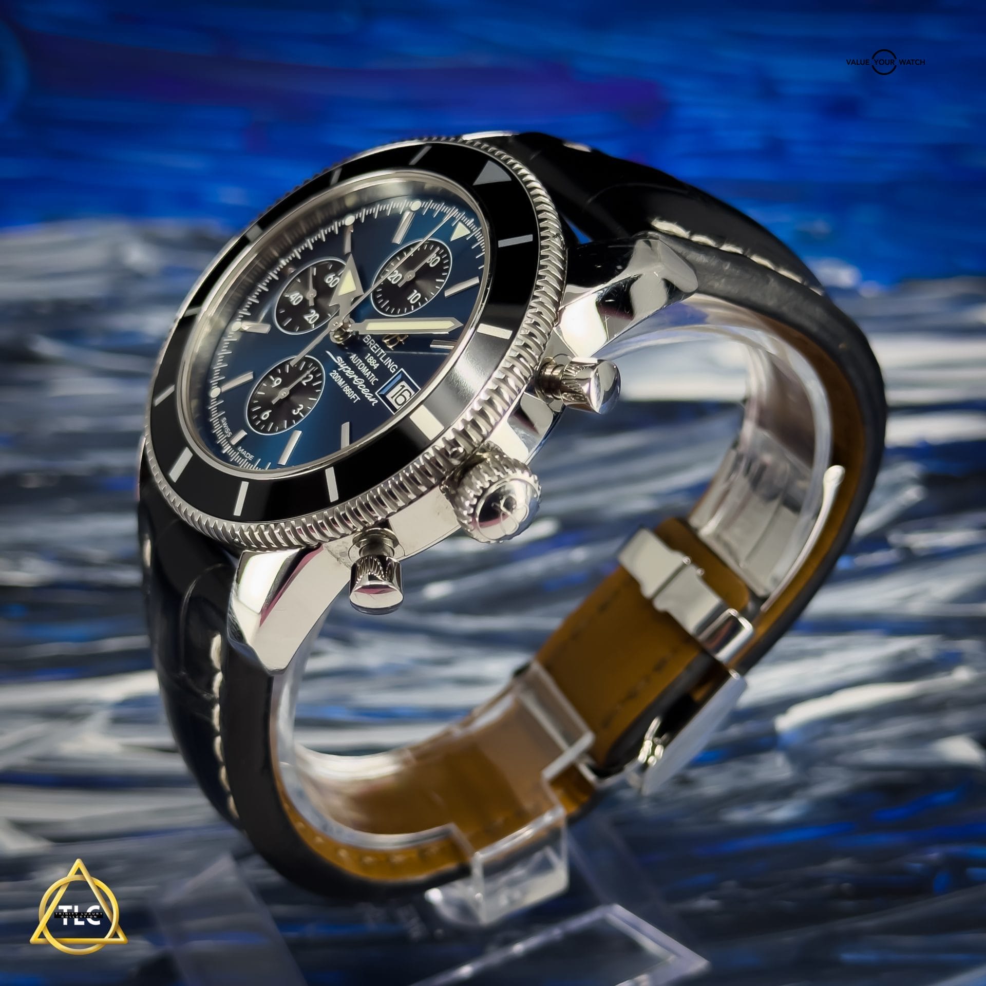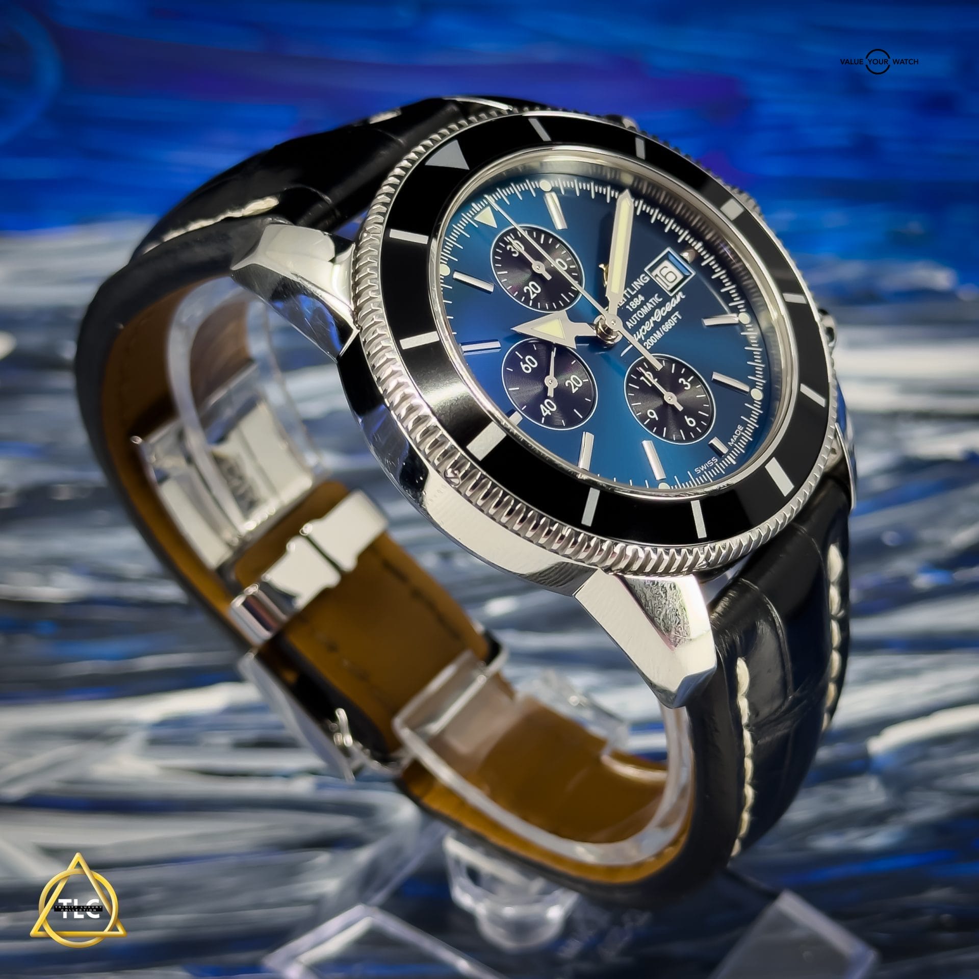 This Breitling Superocean watch is a rare find with a beautiful blue dial and silver case. It features a mechanical (automatic) movement, chronograph function, and a 46 mm case size. The watch comes with its original box and papers, making it a great addition to any watch collection. The black leather band complements the blue dial and black bezel color. This analog watch is perfect for any occasion and is a must-have for watch enthusiasts.