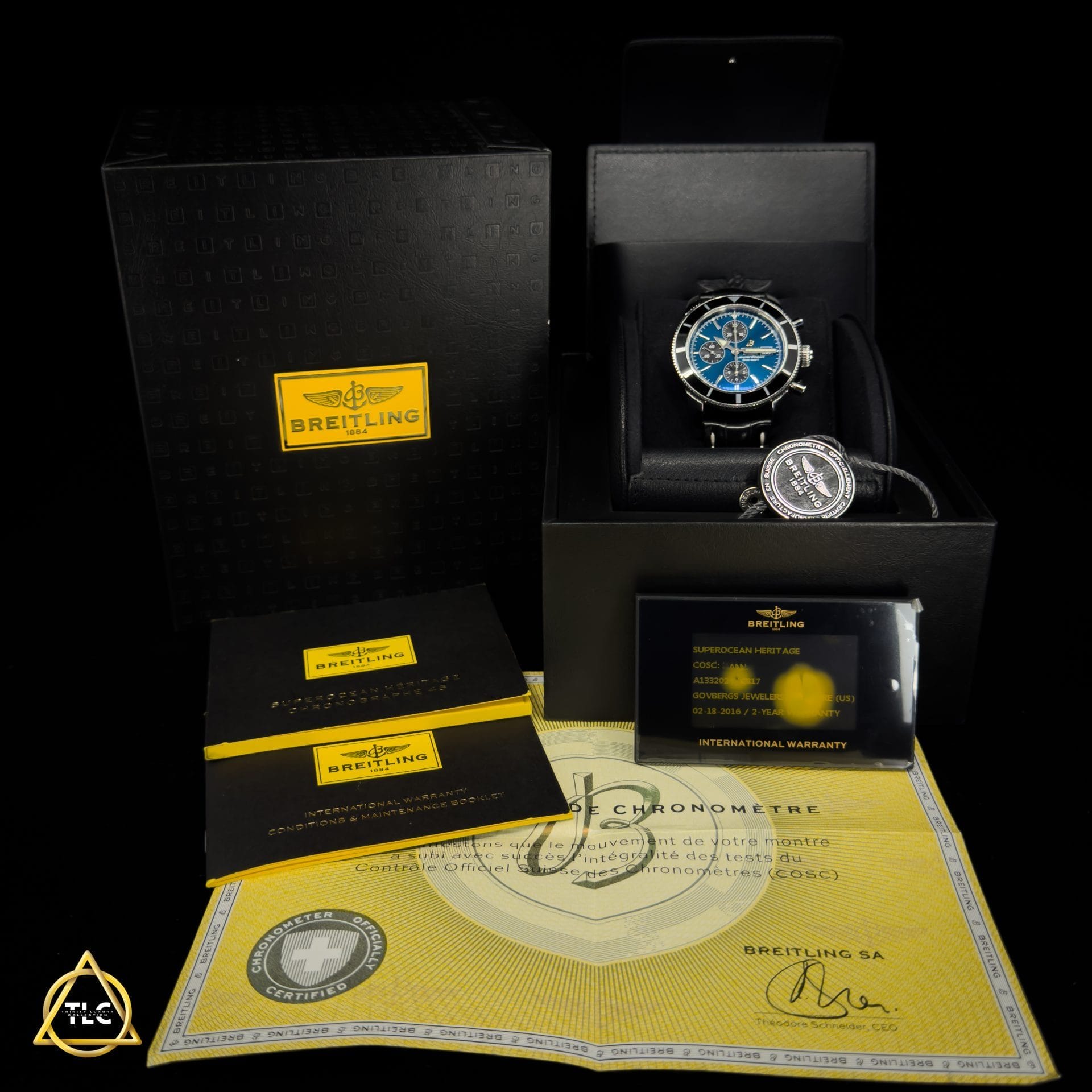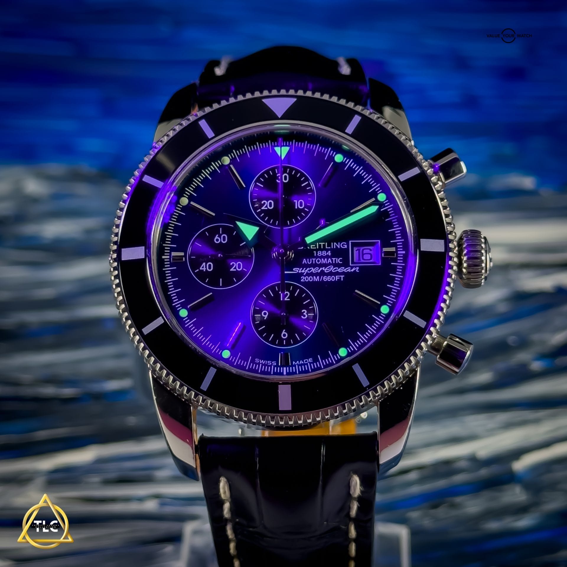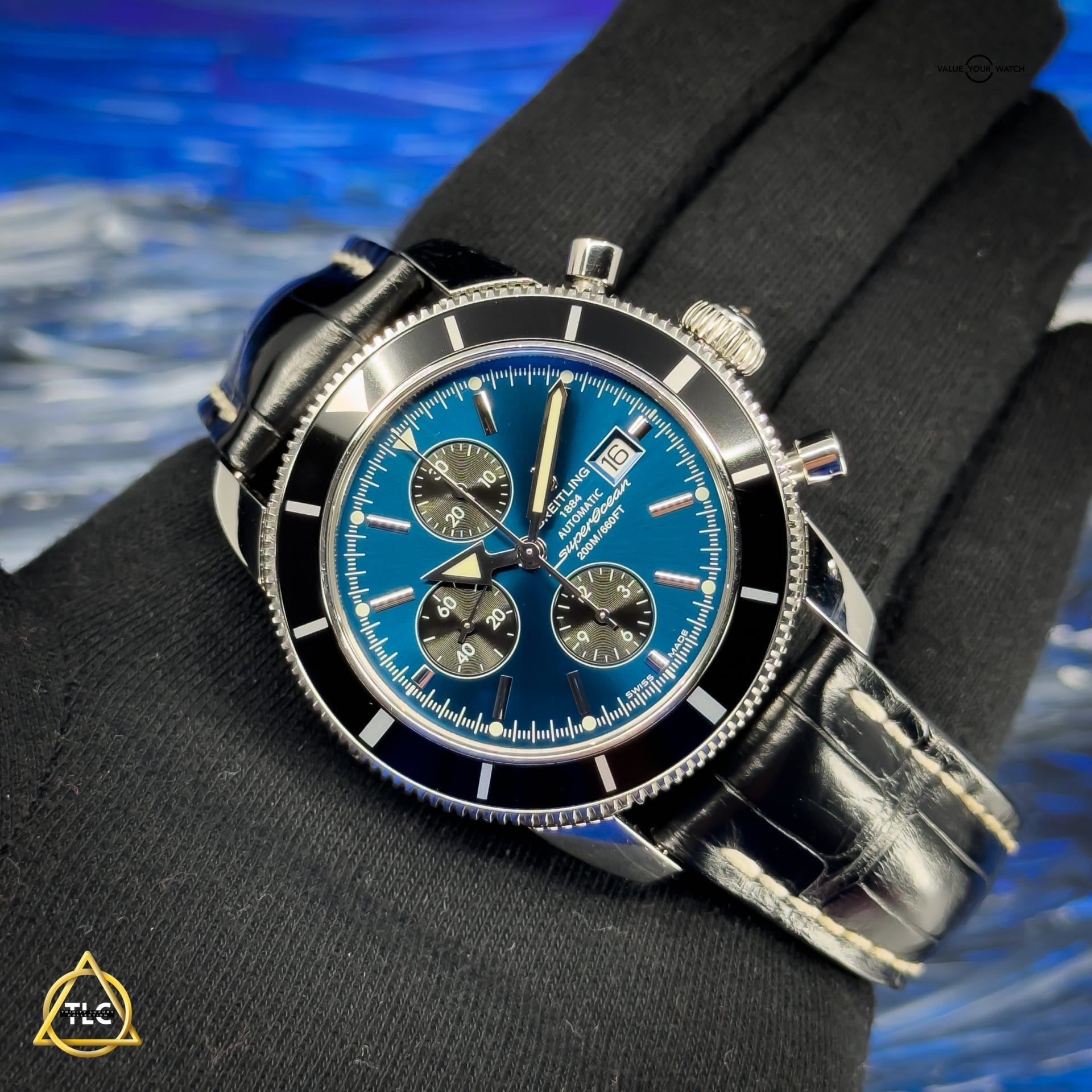 This Breitling Superocean watch is a rare find with a beautiful blue dial and silver case. It features a mechanical (automatic) movement, chronograph function, and a 46 mm case size. The watch comes with its original box and papers, making it a great addition to any watch collection. The black leather band complements the blue dial and black bezel color. This analog watch is perfect for any occasion and is a must-have for watch enthusiasts.