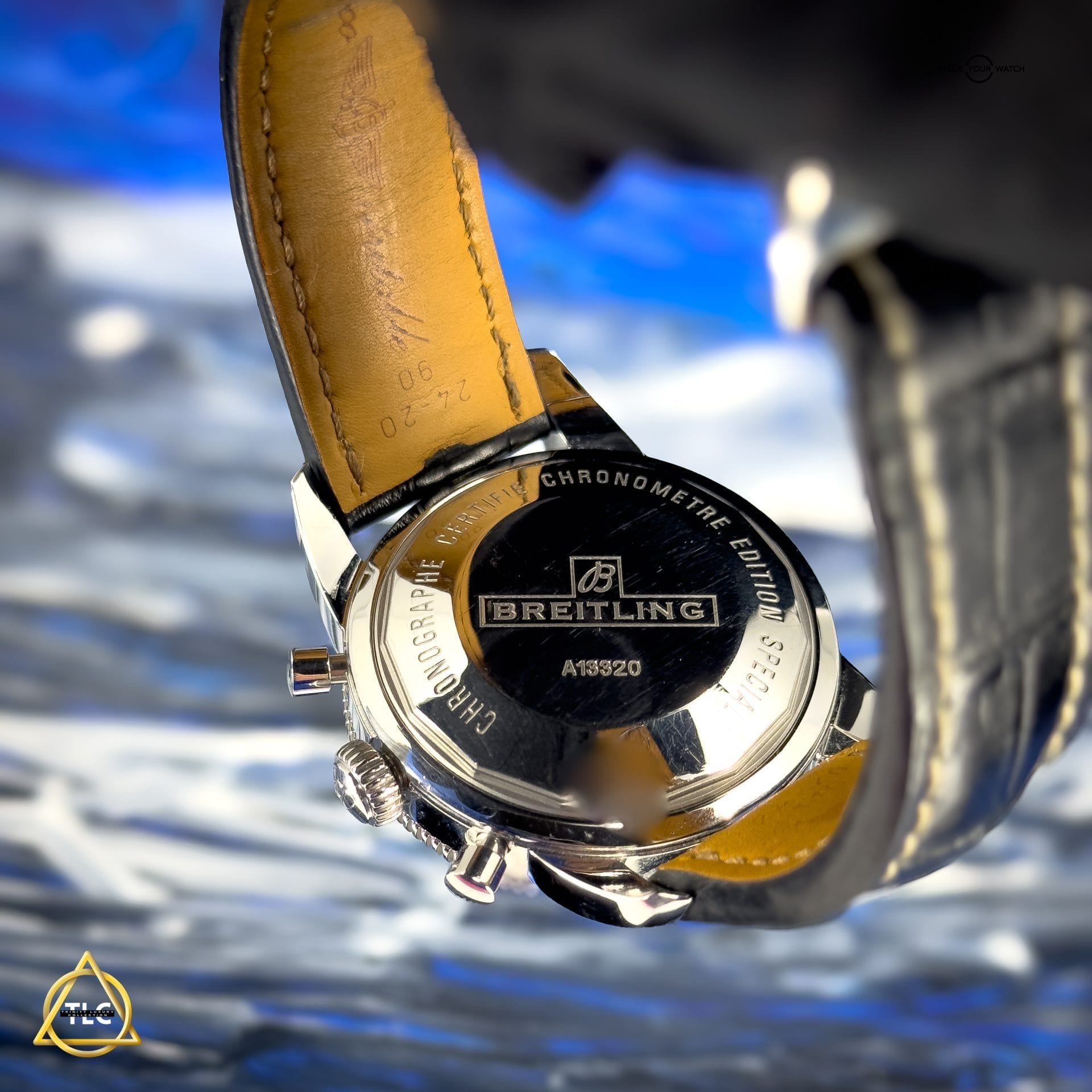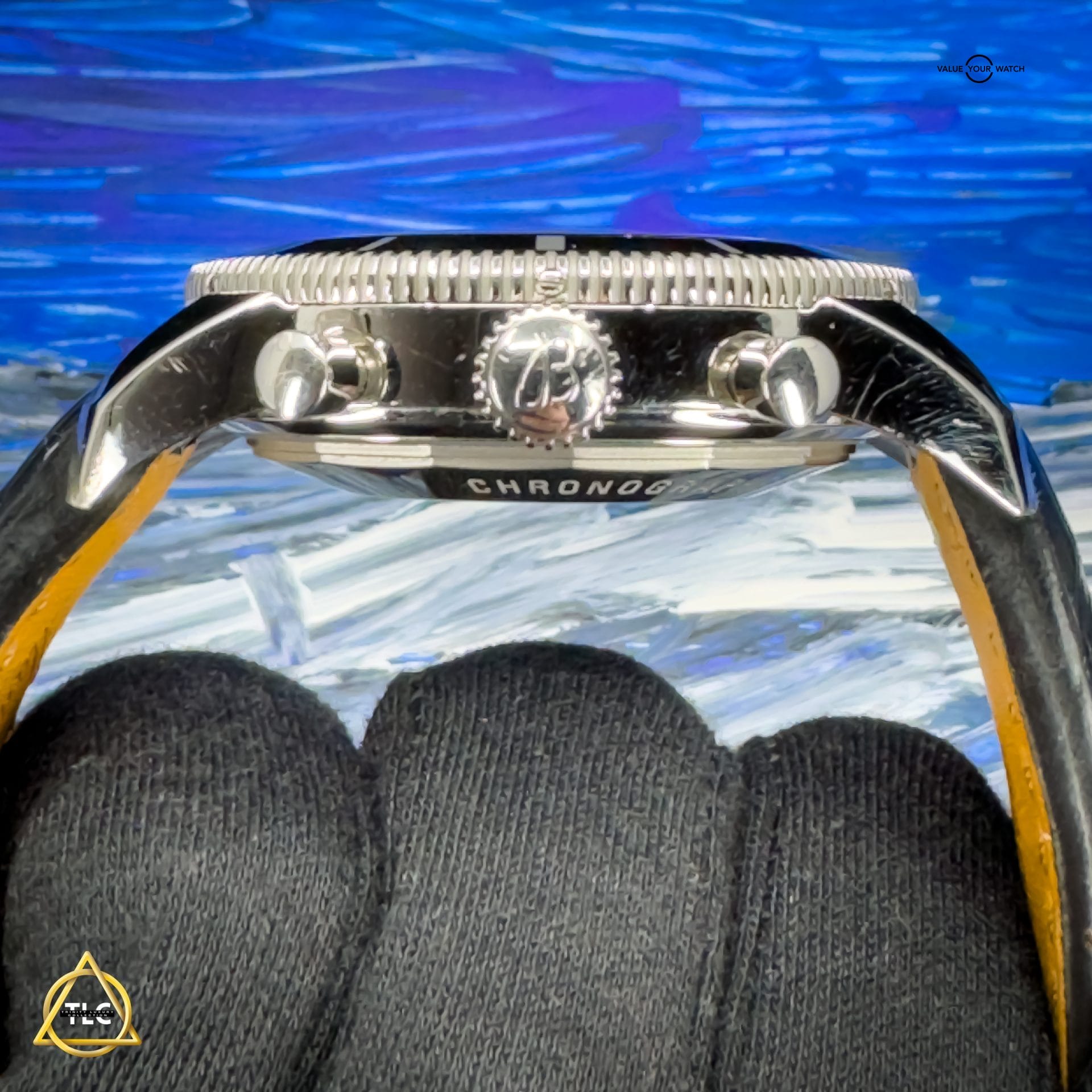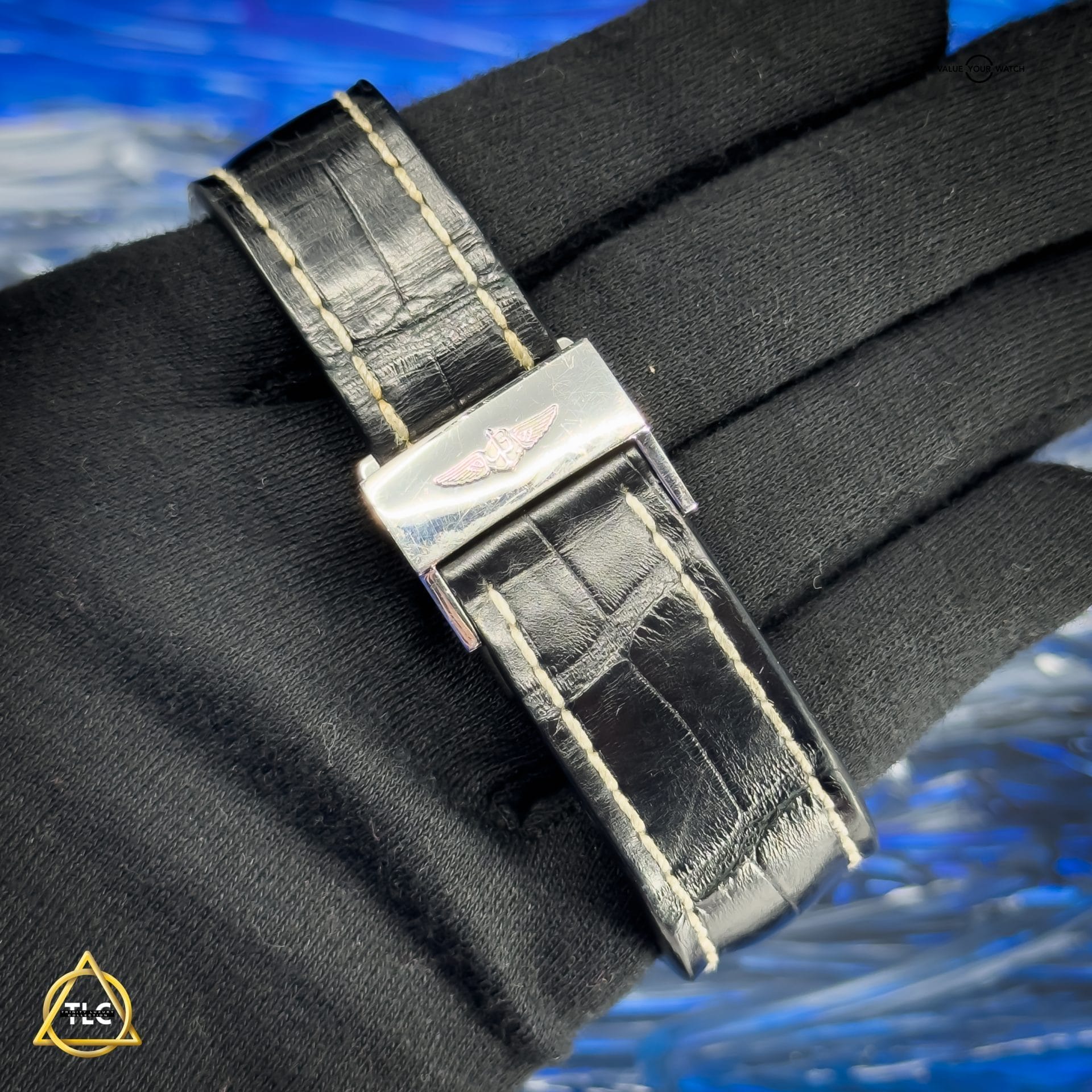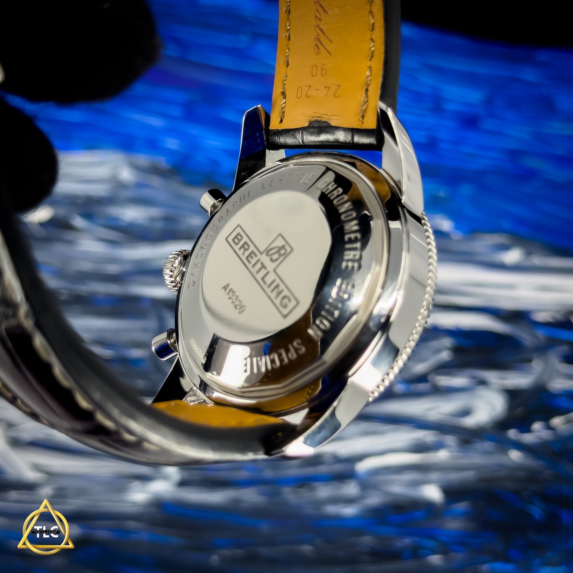 This Breitling Superocean watch is a rare find with a beautiful blue dial and silver case. It features a mechanical (automatic) movement, chronograph function, and a 46 mm case size. The watch comes with its original box and papers, making it a great addition to any watch collection. The black leather band complements the blue dial and black bezel color. This analog watch is perfect for any occasion and is a must-have for watch enthusiasts.