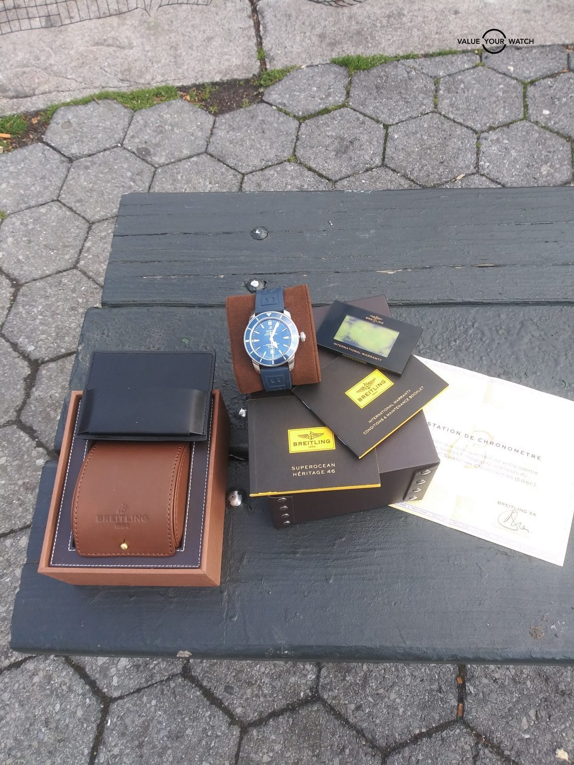 Introducing the favorable sought after Breitling Super Ocean Heritage 46mm with Blue Bezel and Blue Dial.