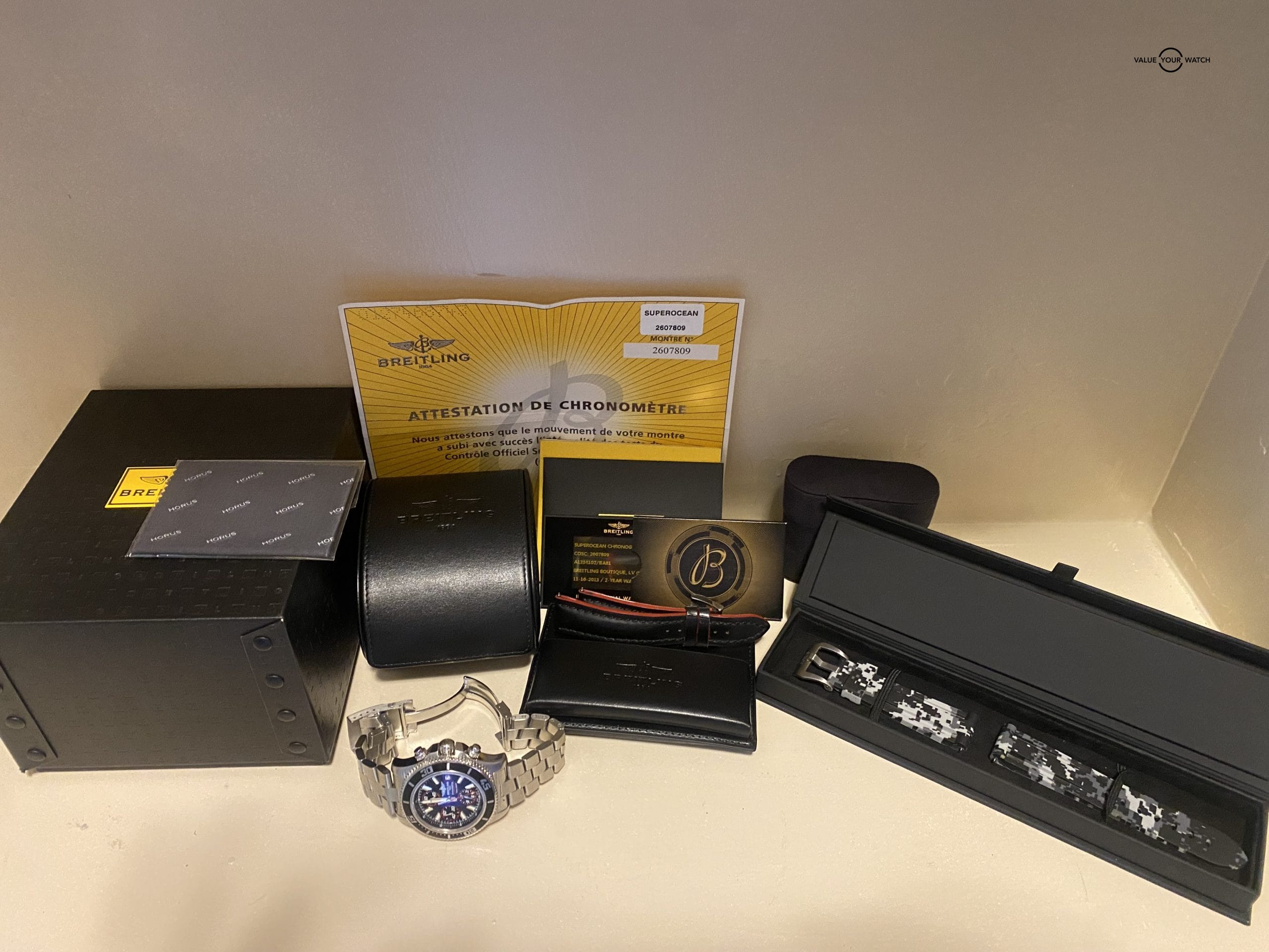 Complete Set : Original Box, Papers, Books, leather strap, travel case, & a Bonus-A brand new snow camo Horus strap.