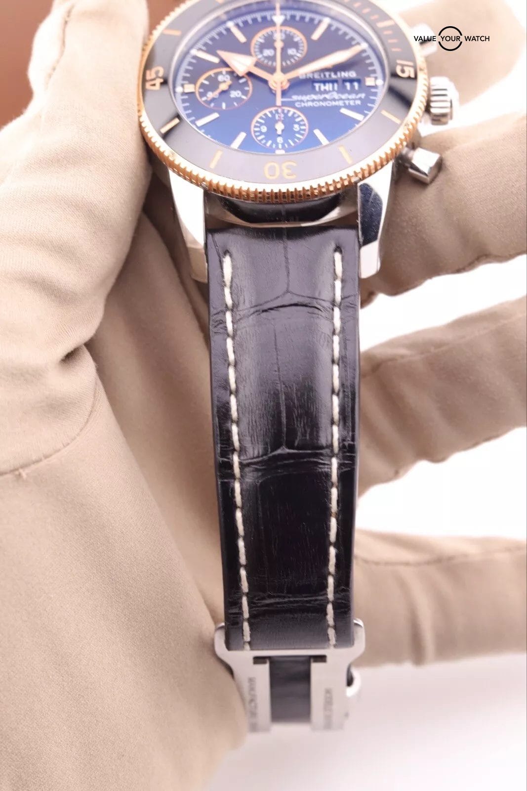 Condition: Watch is in great condition overall. The sapphire crystal is clean with no scratches or chips. The black ceramic bezel is in perfect condition. The dial is black with rose gold accents. The case has some light scratches around the lug areas. The leather strap is in good condition with no cracks or tears. The clasp has a couple light scratches. Has all box and papers from 2019.