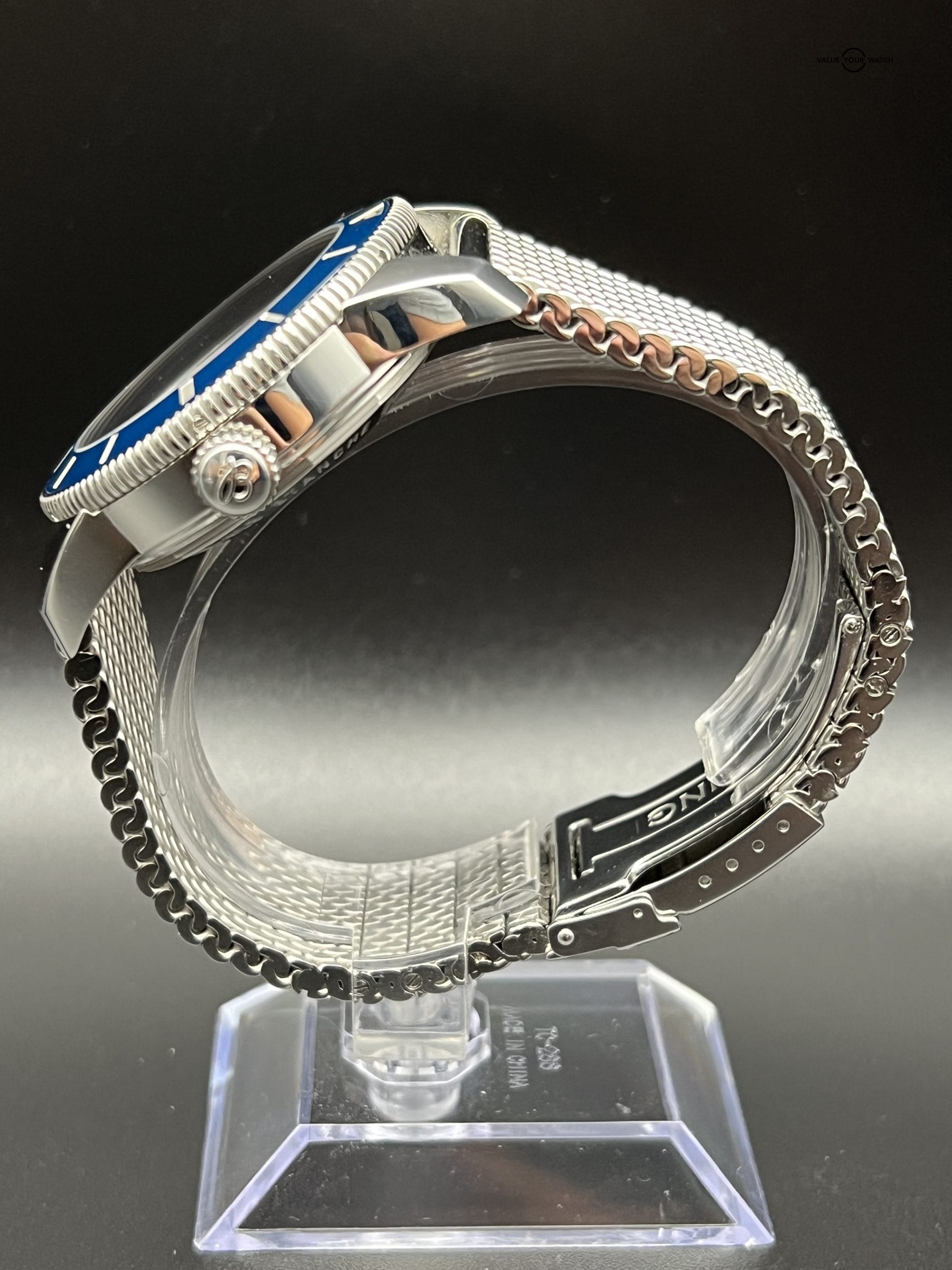 The watch is available today as a complete set in arguably the most desired setting; blue dial and bezel, 42mm case size, and strapped on stainless steel mesh. Original MSRP $5,250.