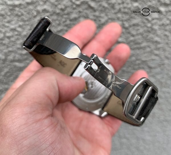 This Cartier features a 1904-PS MC movement with 27 jewels and an approximate 48 hour power reserve! The watch comes on an original Cartier crocodile strap with a stainless steel deployment clasp. With adjustments to accommodate any size wrist, this strap does not need to be cut to size.