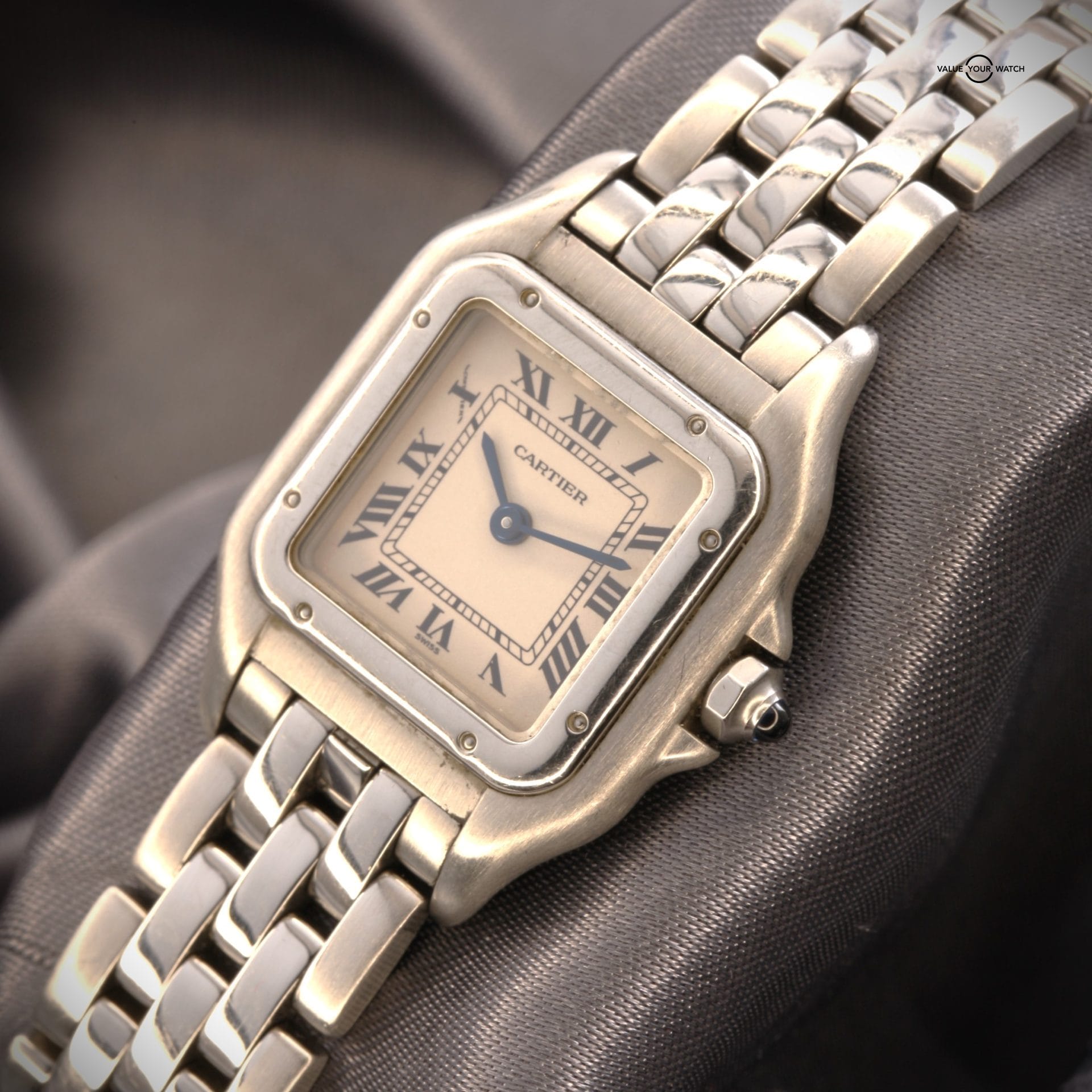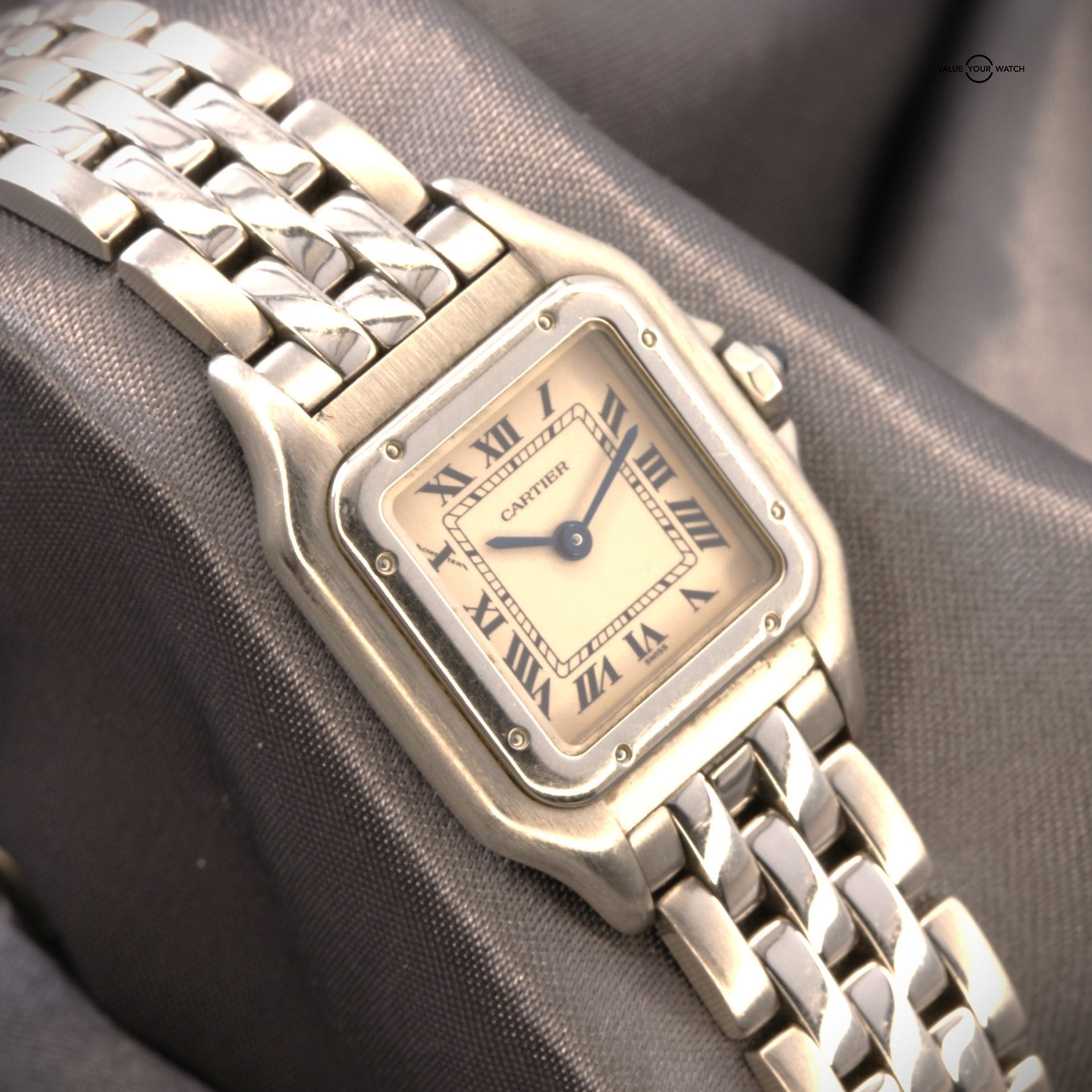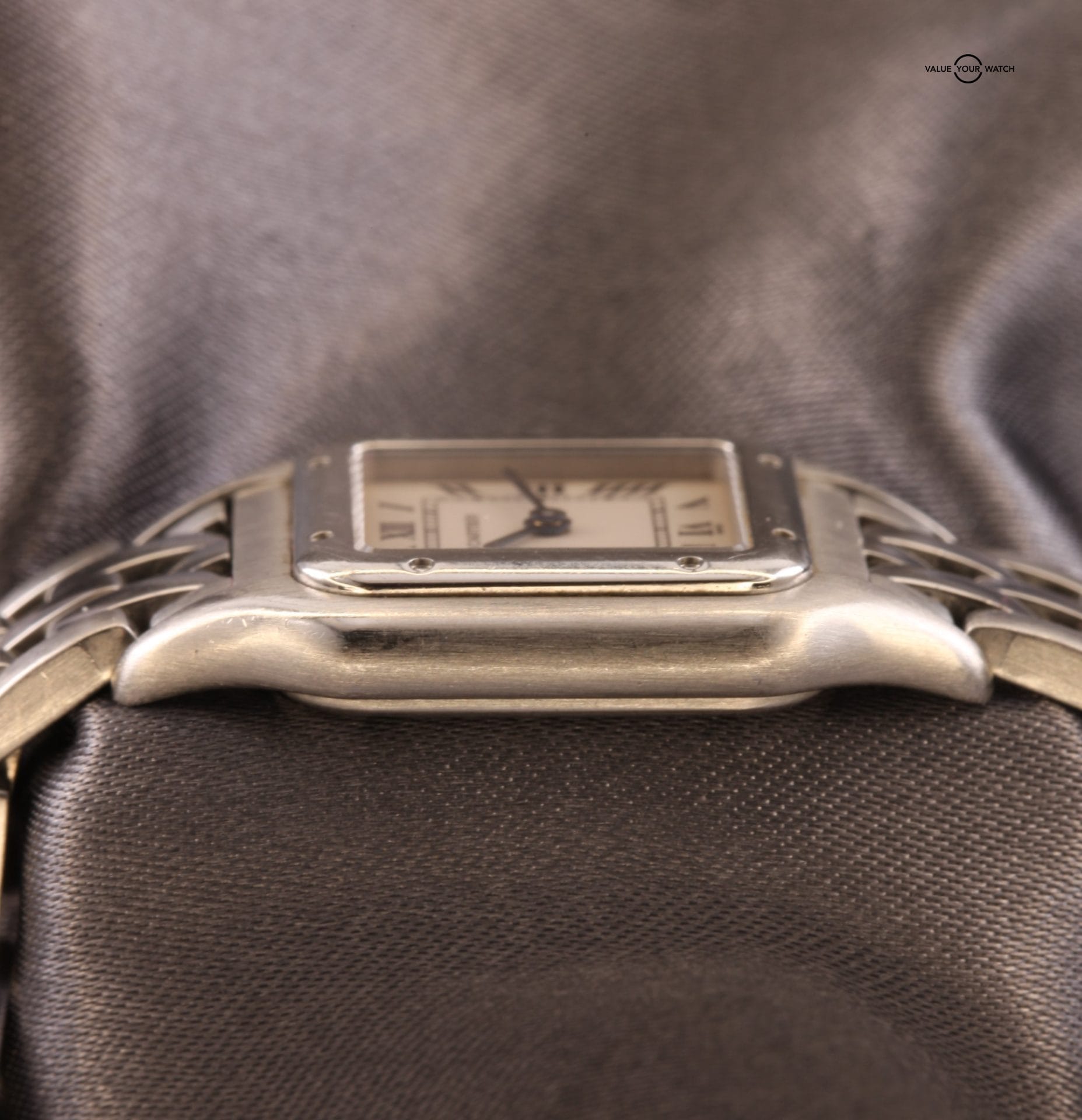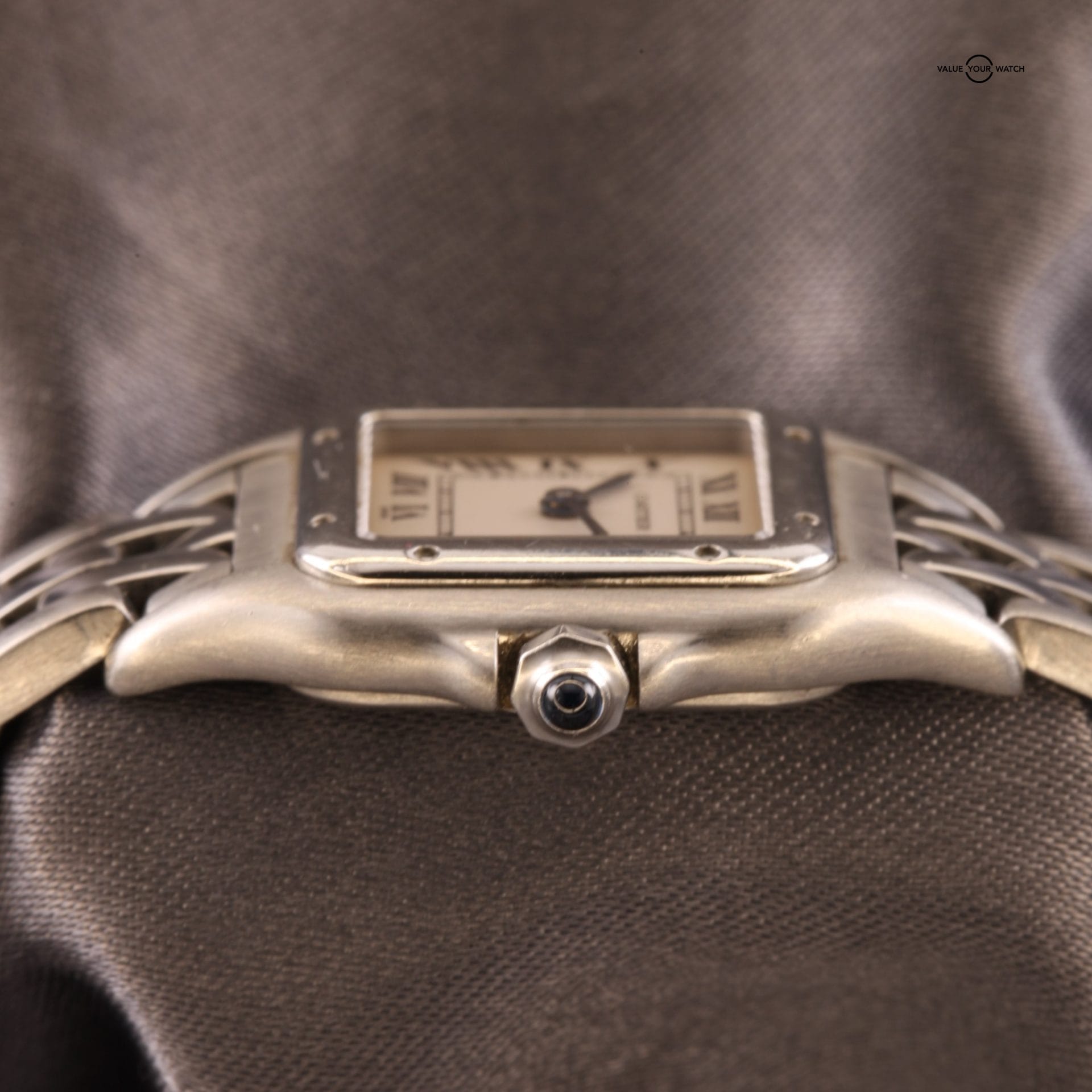 Presented for your consideration is this classy and elegant Panthere. The ivory dial with roman numeral hour markers gives it a unique vintage characteristic that is well known to the model. Its link bracelet and curved caseback allows it to sit comfortably and snuggly on the wrist for a custom feel. The result is a classic timepiece that exudes elegance and sophistication.