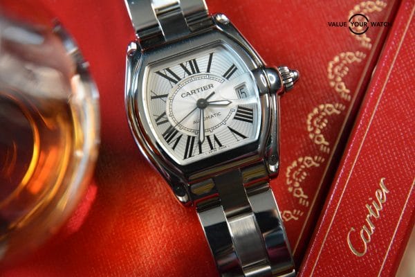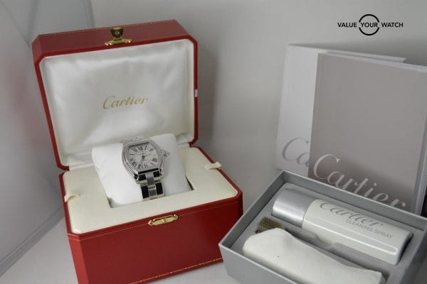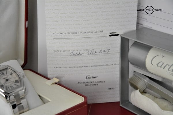 This Cartier Roadster (Large) in stainless steel, features the highly sought after “Silver dial with Roman Numerals and Date”.