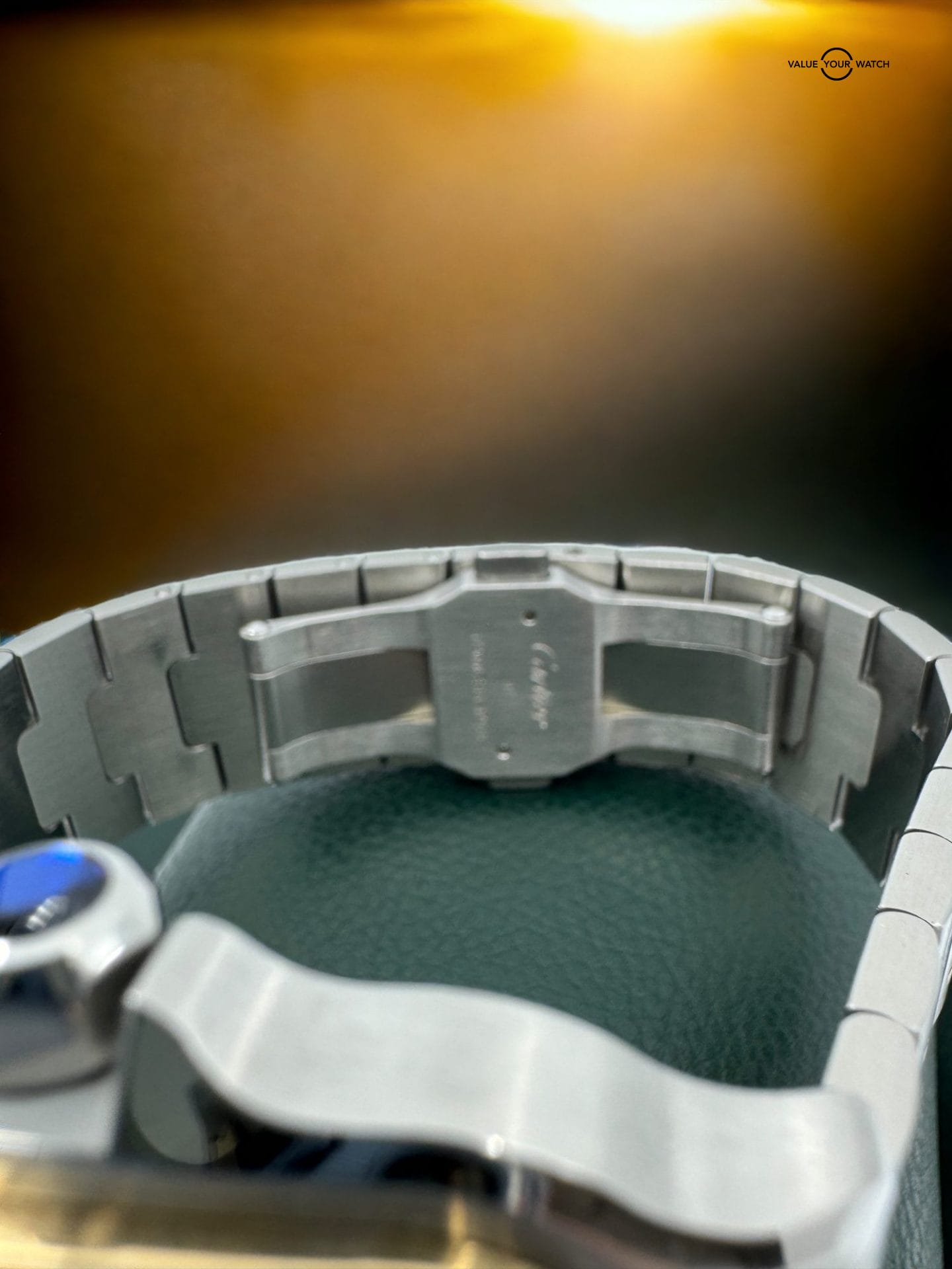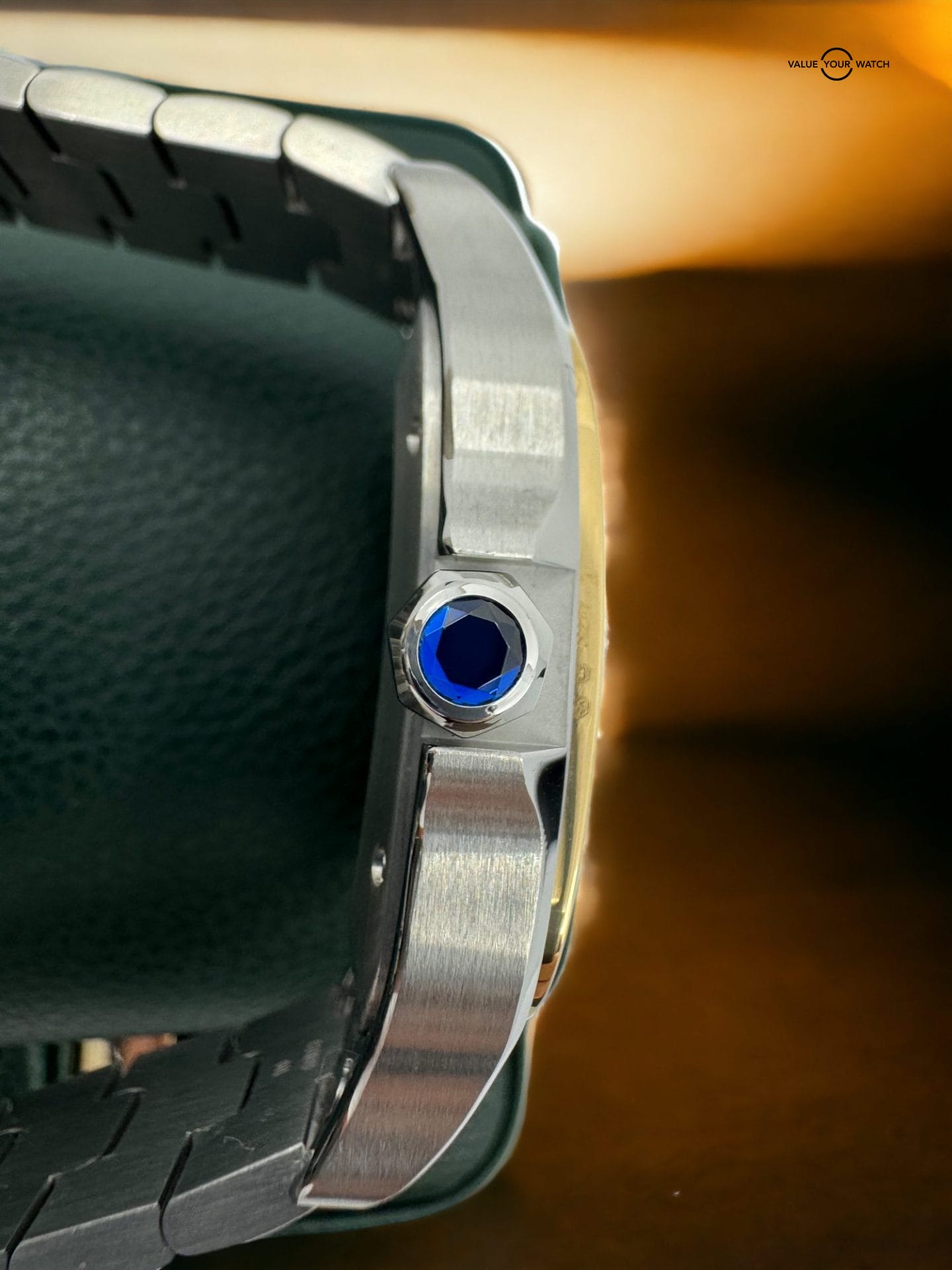 This Santos De Cartier timepiece features their in house 1847 MC automatic winding mechanical movement with a steel case and yellow gold bezel. Blue steel hands and a beautiful 7 sided crown with blue synthetic spinel.