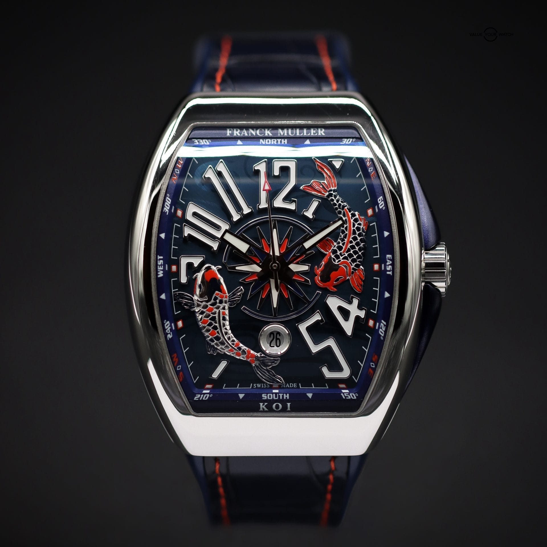 Behold the epitome of elegance and precision crafted in the form of the FM Vanguard Koi Generation II Limited Edition. It boasts a 44 stainless steel tonneau case that marries strength with sophistication. Adorning the azure backdrop of its dial, a mesmerizing symphony of time unfolds, accentuated by a subtle date aperture at the 6 o’clock mark, inviting you to delve into moments past and future. Shielding this masterpiece is a scratch-resistant sapphire crystal.