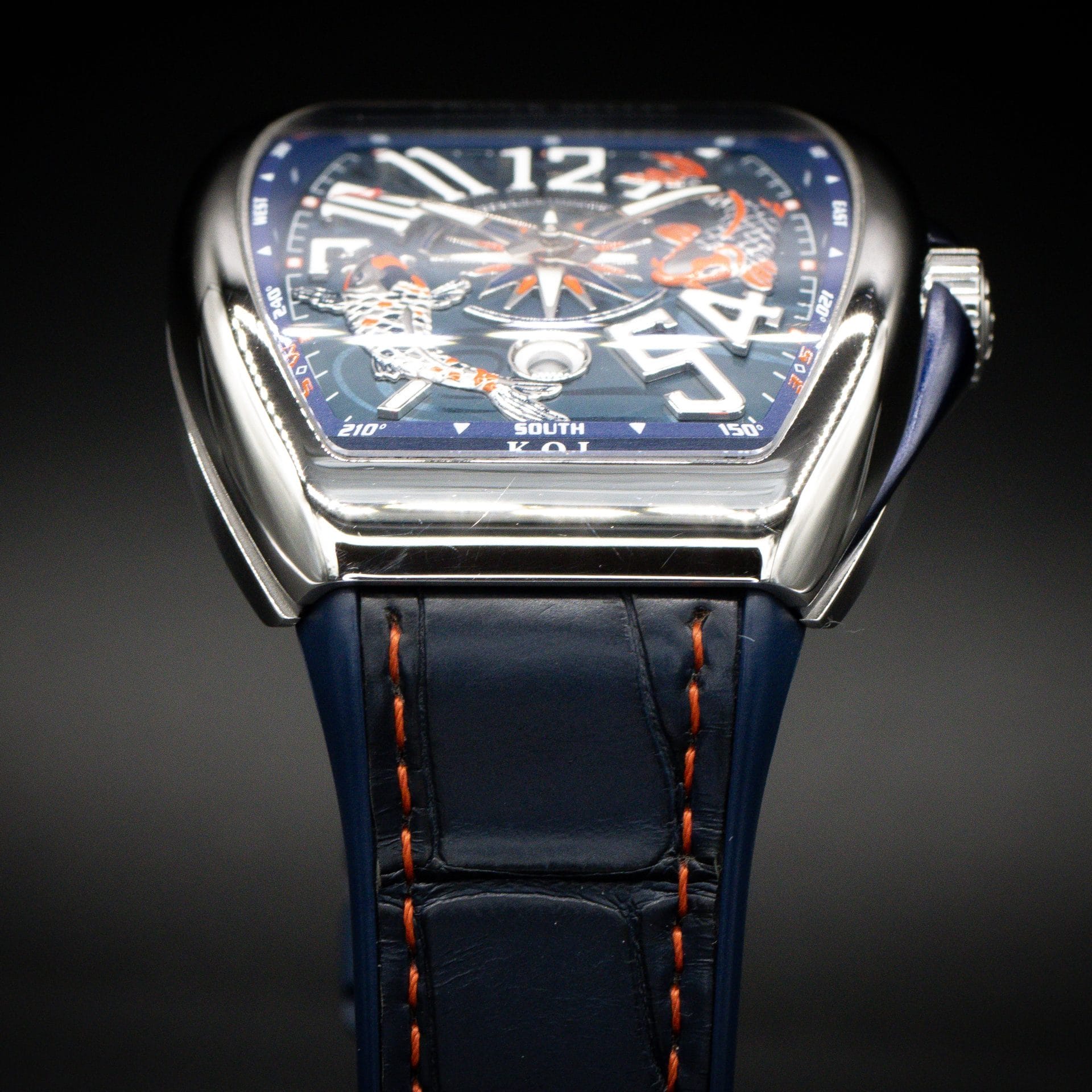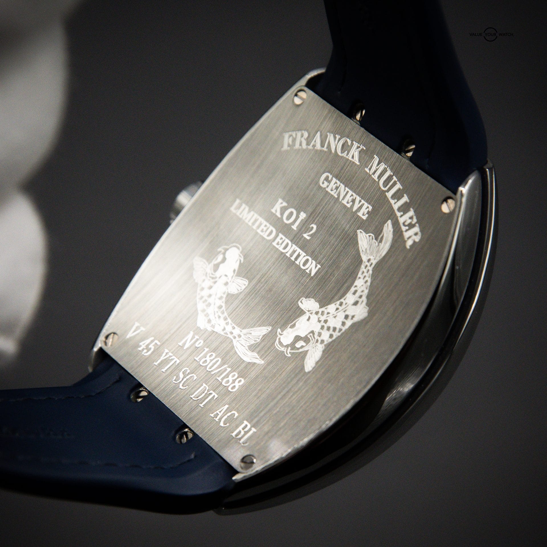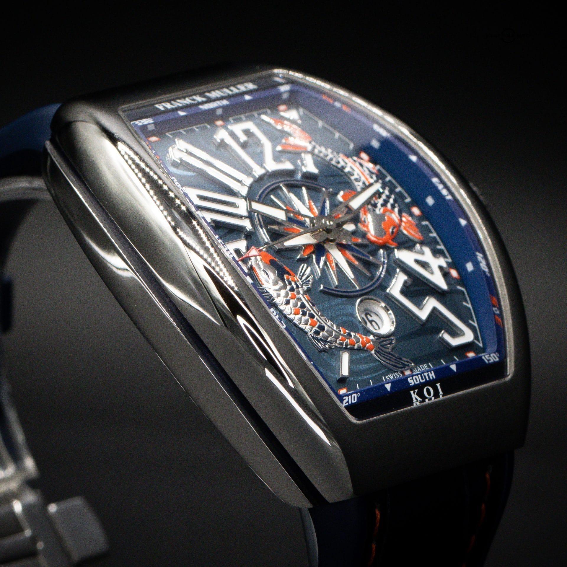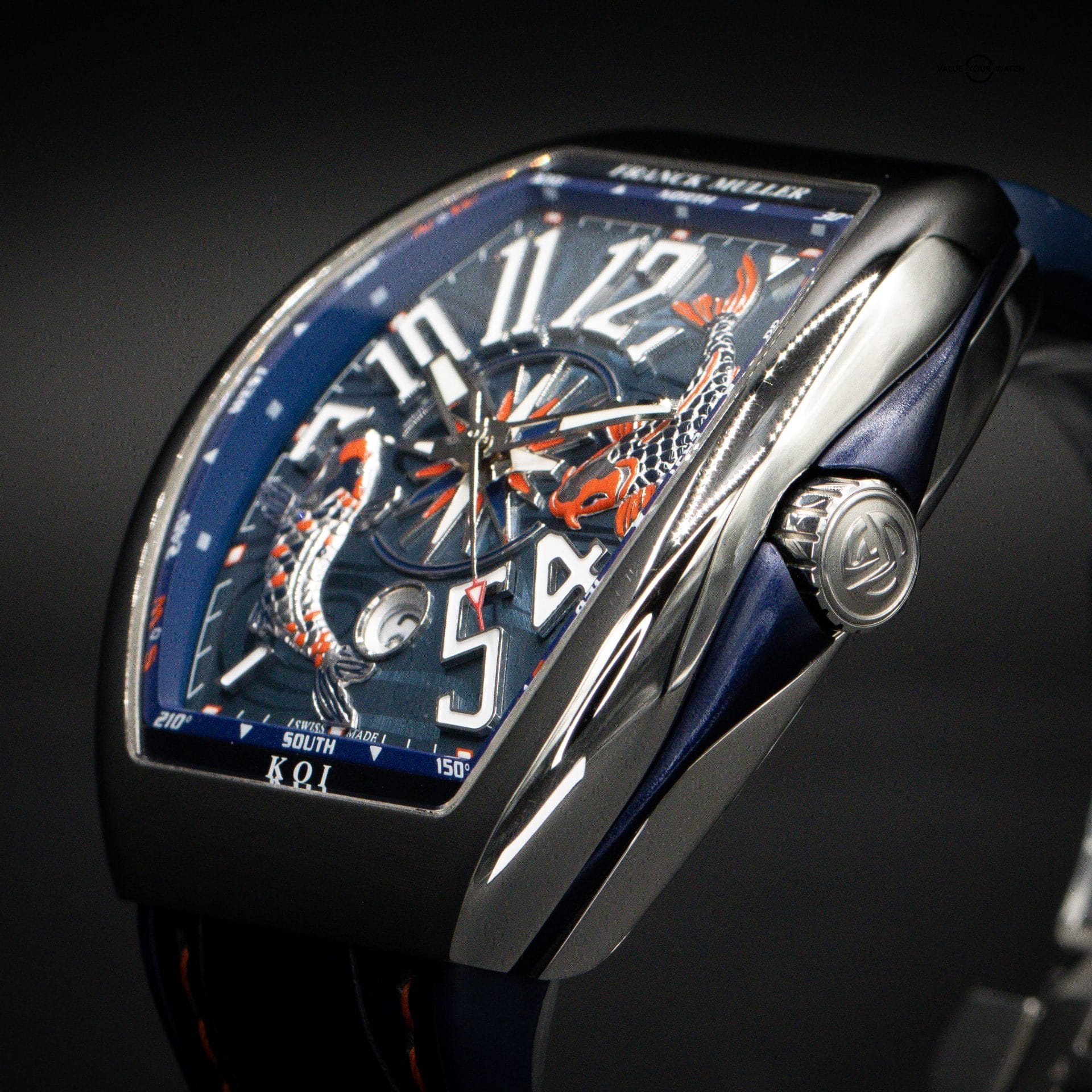 Behold the epitome of elegance and precision crafted in the form of the FM Vanguard Koi Generation II Limited Edition. It boasts a 44 stainless steel tonneau case that marries strength with sophistication. Adorning the azure backdrop of its dial, a mesmerizing symphony of time unfolds, accentuated by a subtle date aperture at the 6 o’clock mark, inviting you to delve into moments past and future. Shielding this masterpiece is a scratch-resistant sapphire crystal.