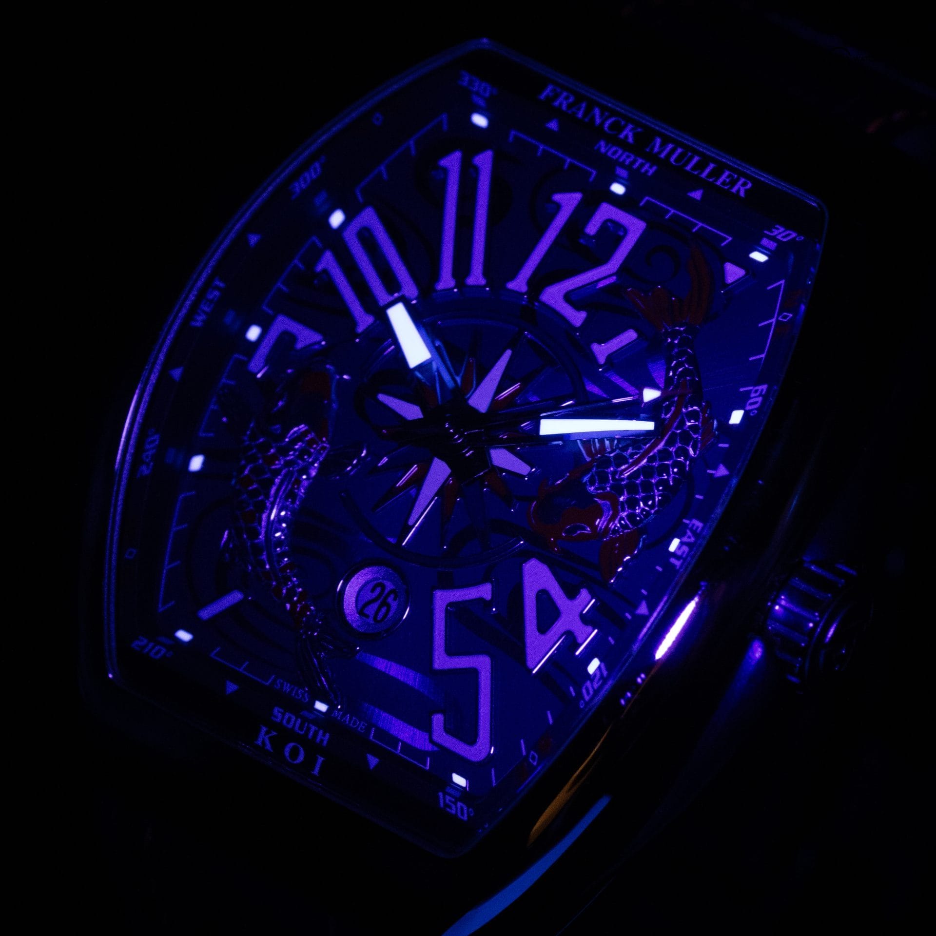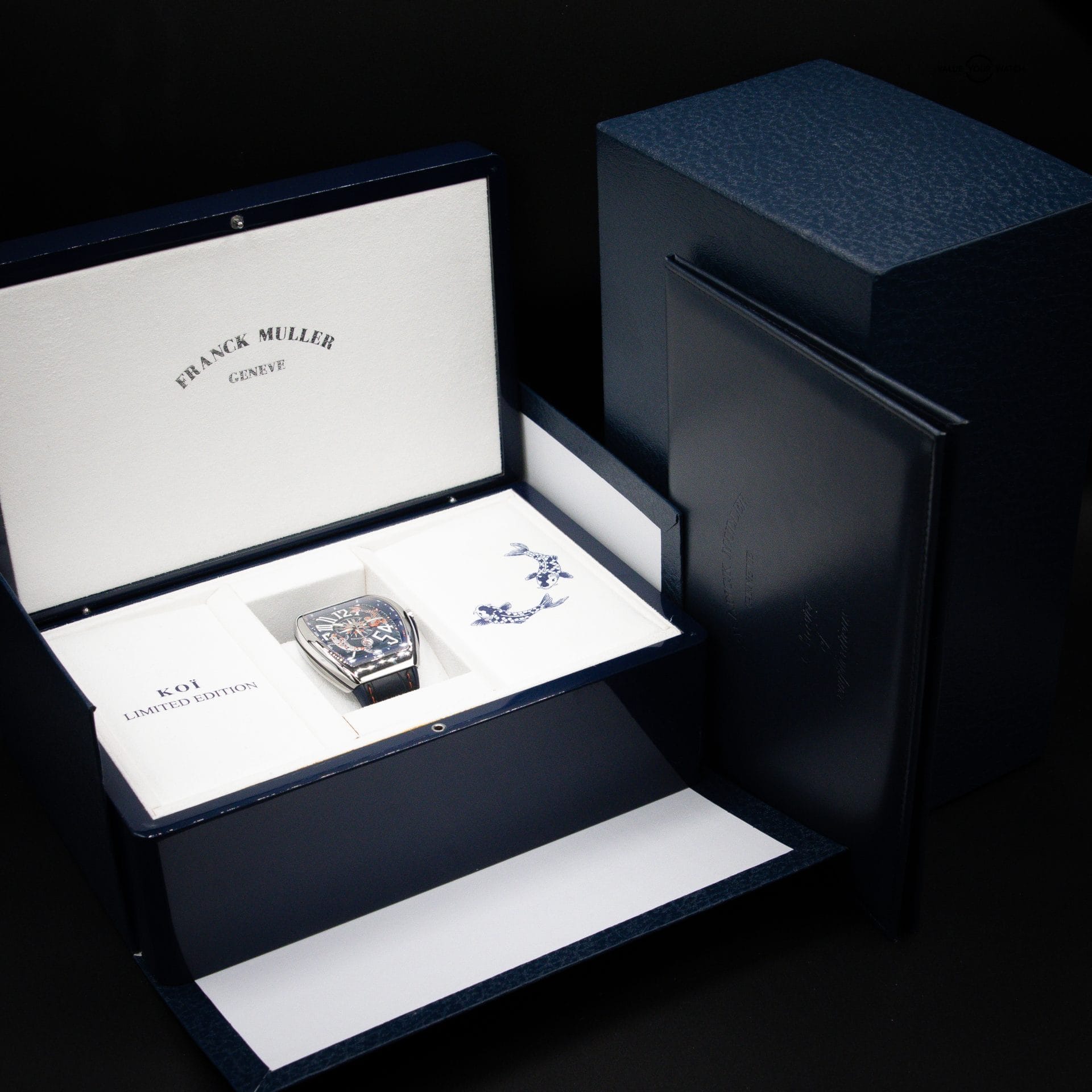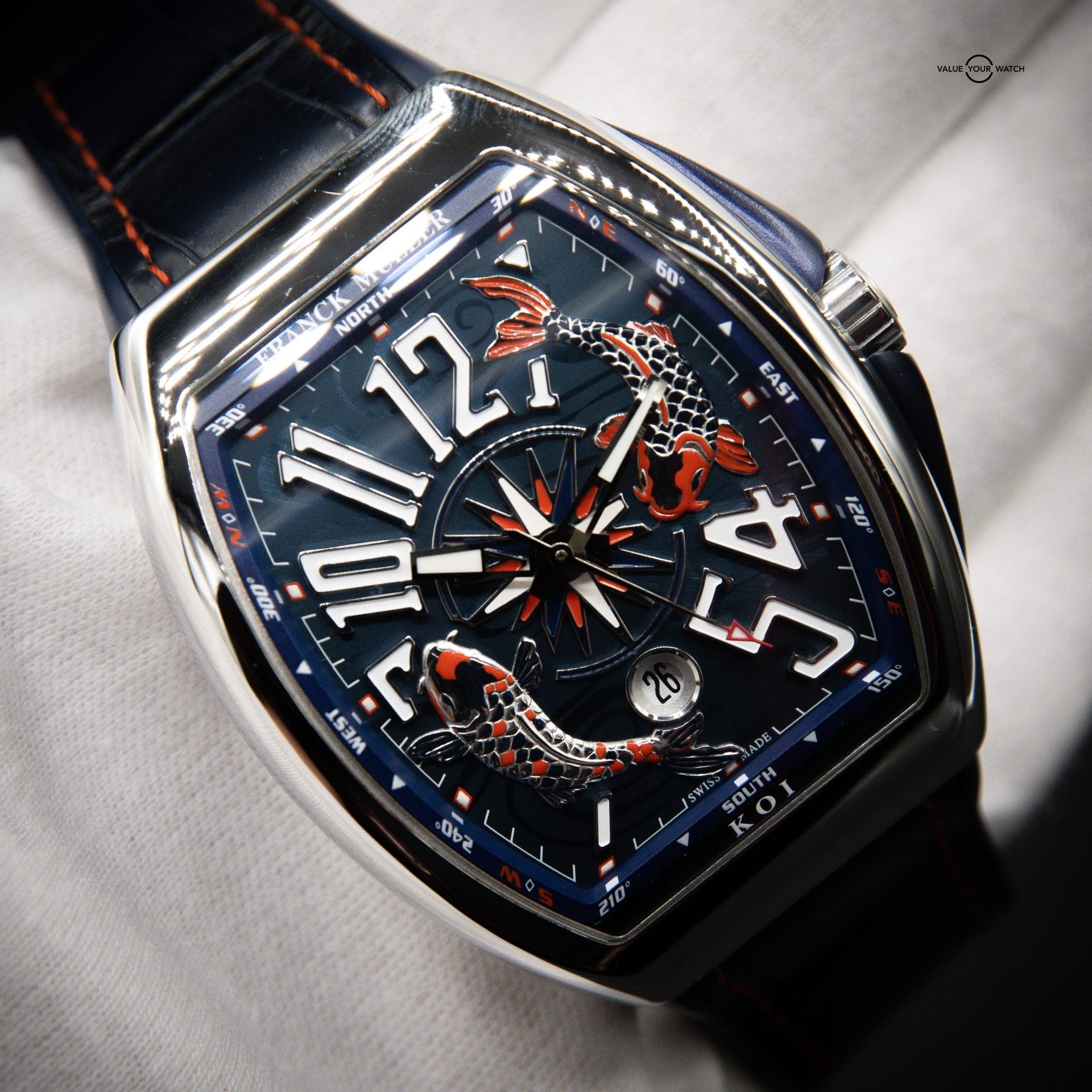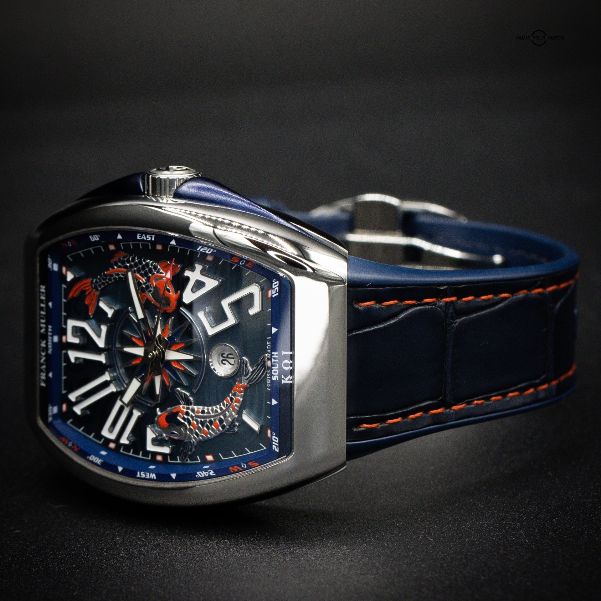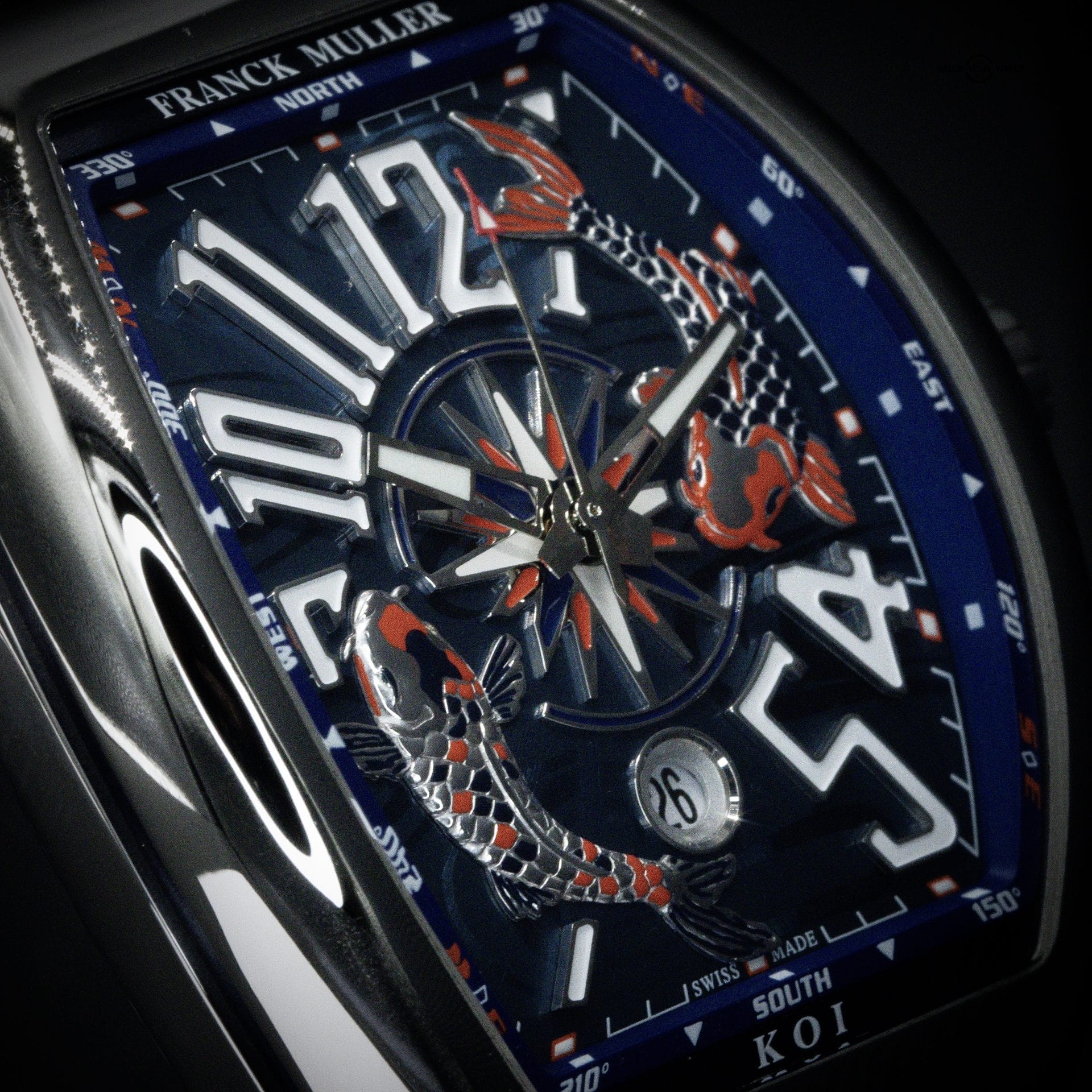 Behold the epitome of elegance and precision crafted in the form of the FM Vanguard Koi Generation II Limited Edition. It boasts a 44 stainless steel tonneau case that marries strength with sophistication. Adorning the azure backdrop of its dial, a mesmerizing symphony of time unfolds, accentuated by a subtle date aperture at the 6 o’clock mark, inviting you to delve into moments past and future. Shielding this masterpiece is a scratch-resistant sapphire crystal.