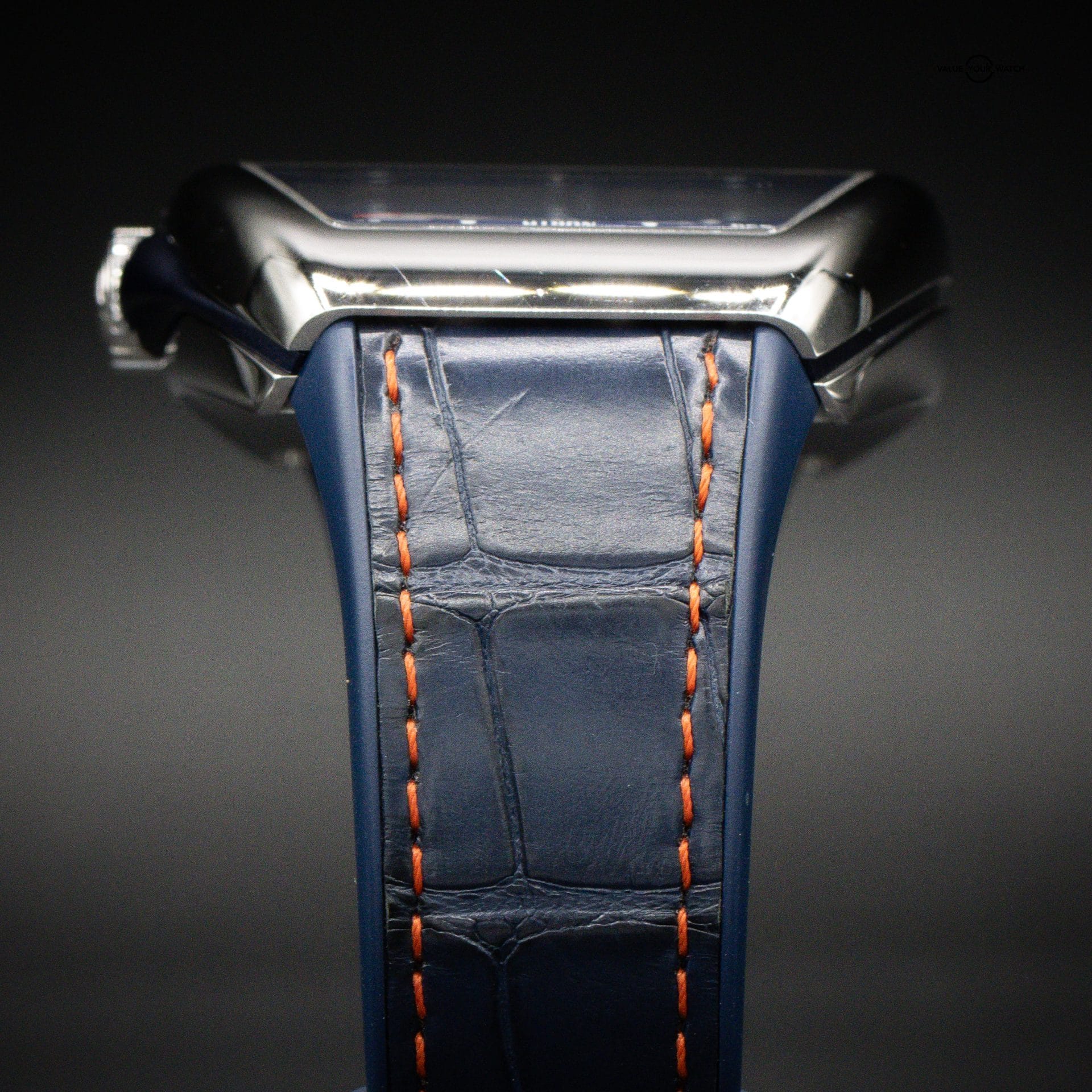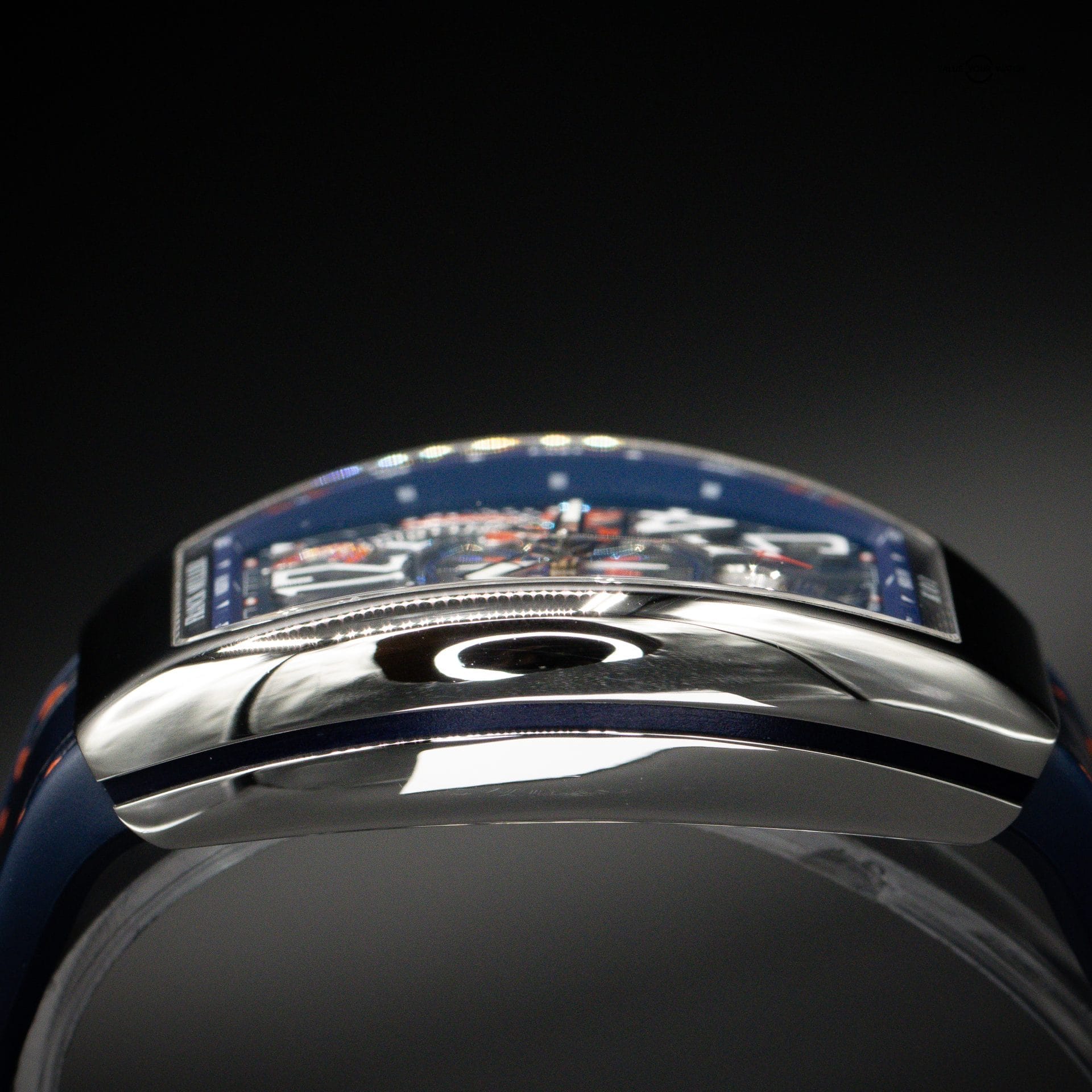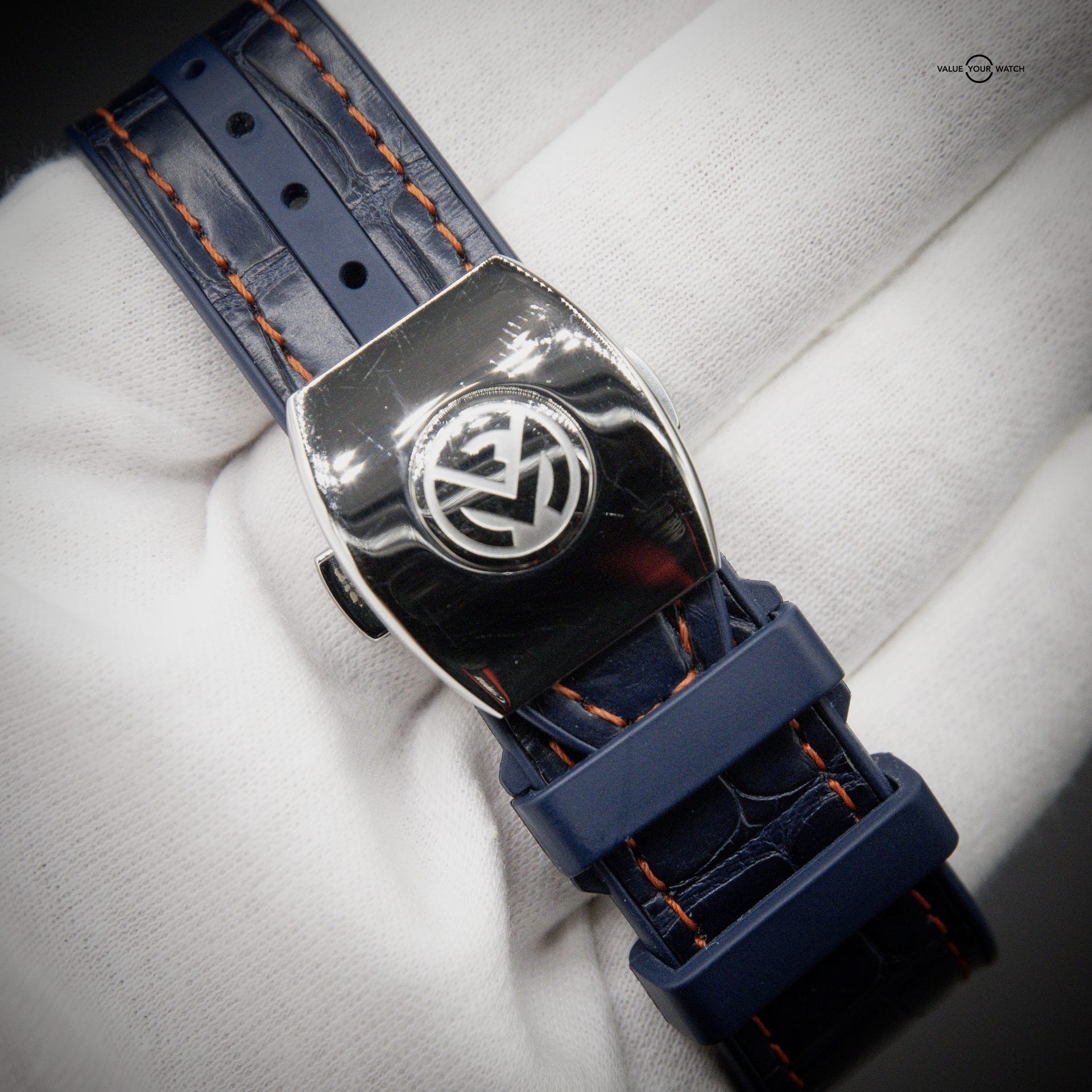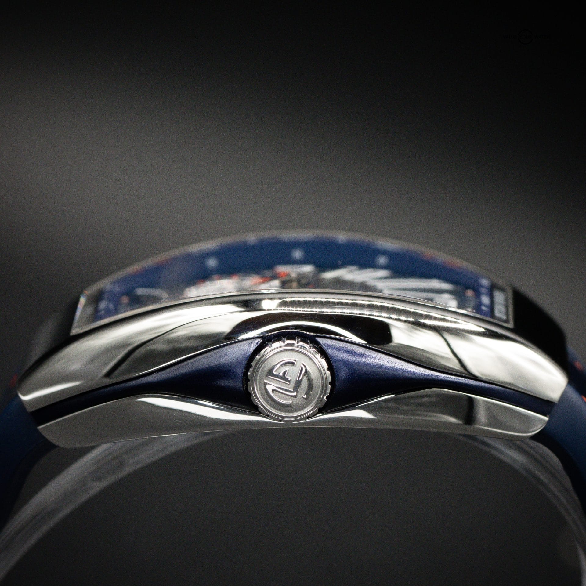 Behold the epitome of elegance and precision crafted in the form of the FM Vanguard Koi Generation II Limited Edition. It boasts a 44 stainless steel tonneau case that marries strength with sophistication. Adorning the azure backdrop of its dial, a mesmerizing symphony of time unfolds, accentuated by a subtle date aperture at the 6 o’clock mark, inviting you to delve into moments past and future. Shielding this masterpiece is a scratch-resistant sapphire crystal.