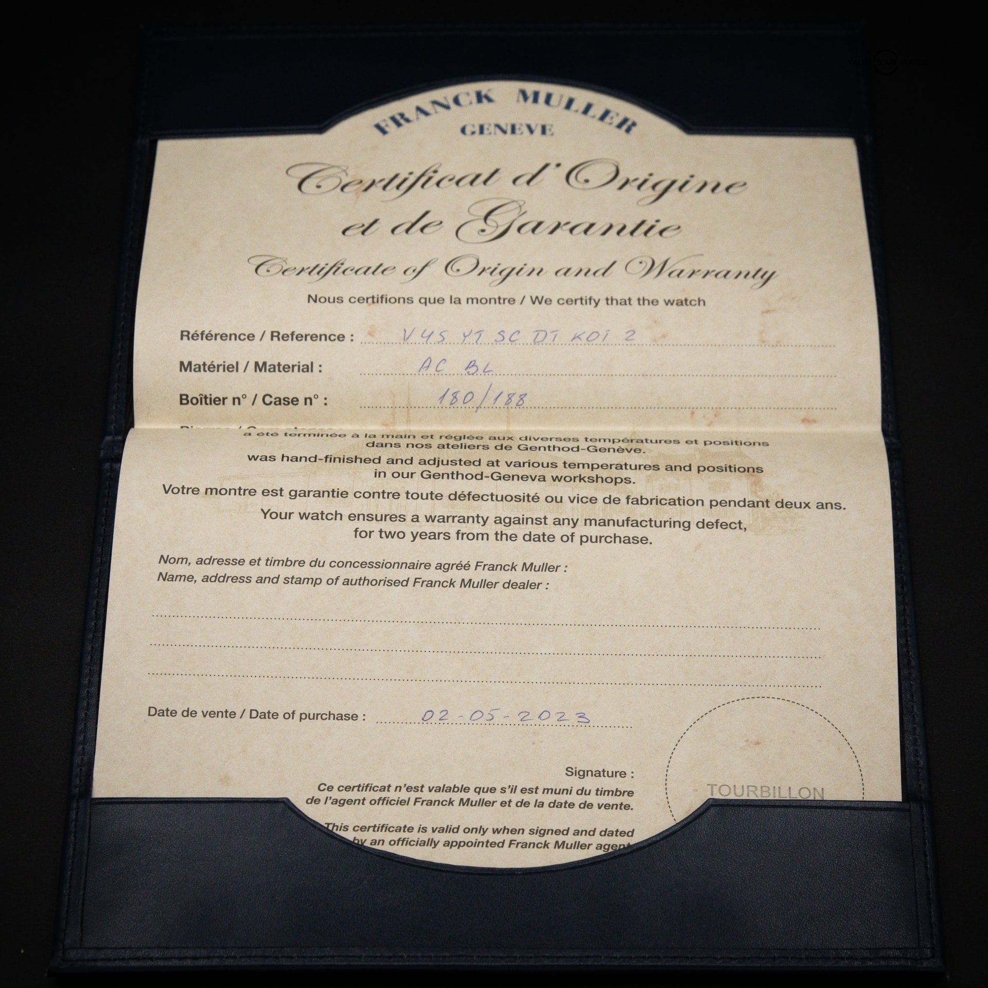 This timepiece is in excellent condition, showing only negligible signs of wear on the clasp. It comes as a complete set that includes both inner and outer boxes and warranty certificate dated May 2nd, 2023.