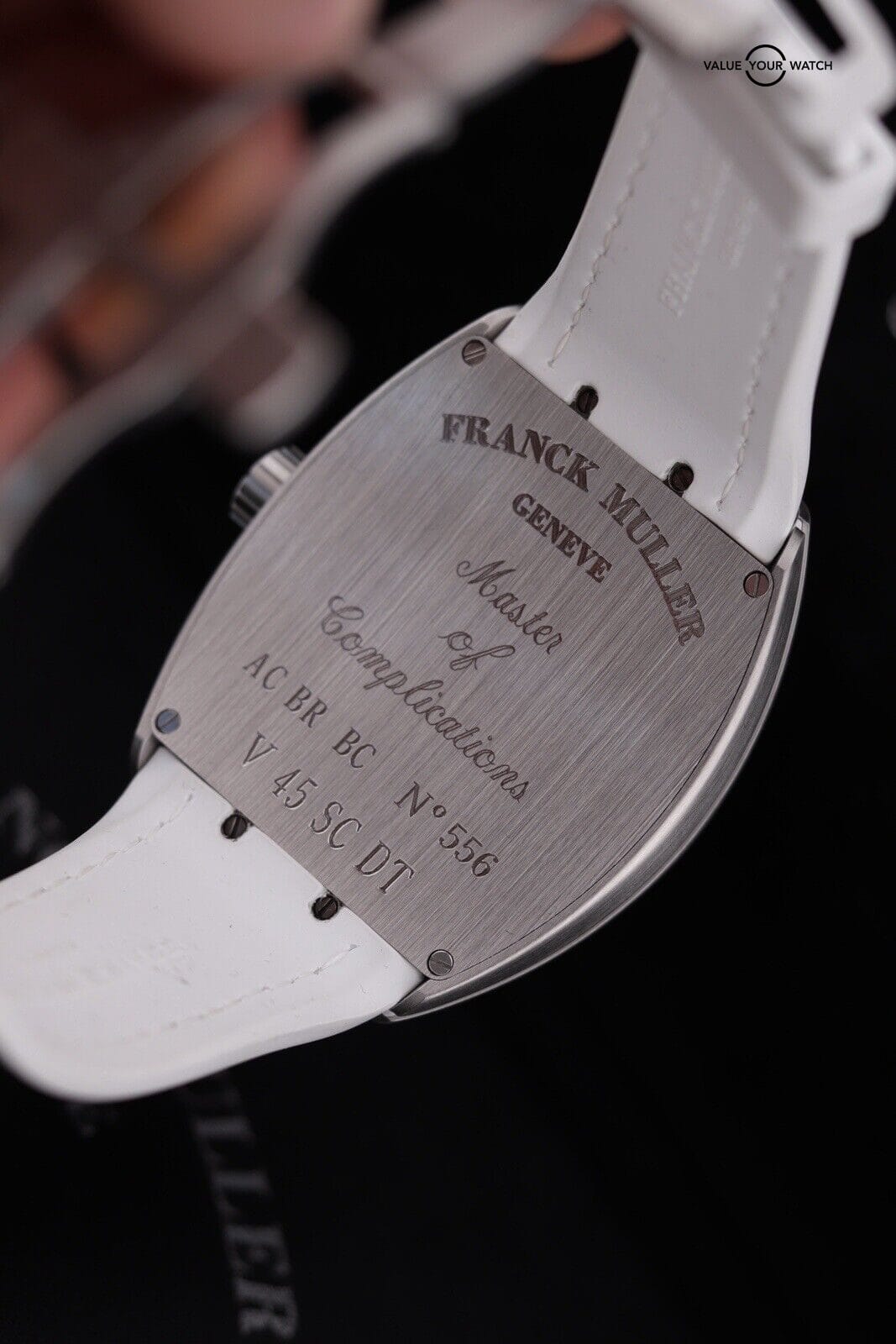 When purchasing a Franck Muller Vanguard V45SCDT online, ensure the authenticity of the watch by dealing with reputable sellers or authorized dealers. Request detailed images of the watch, including the case back and movement, to verify its authenticity.