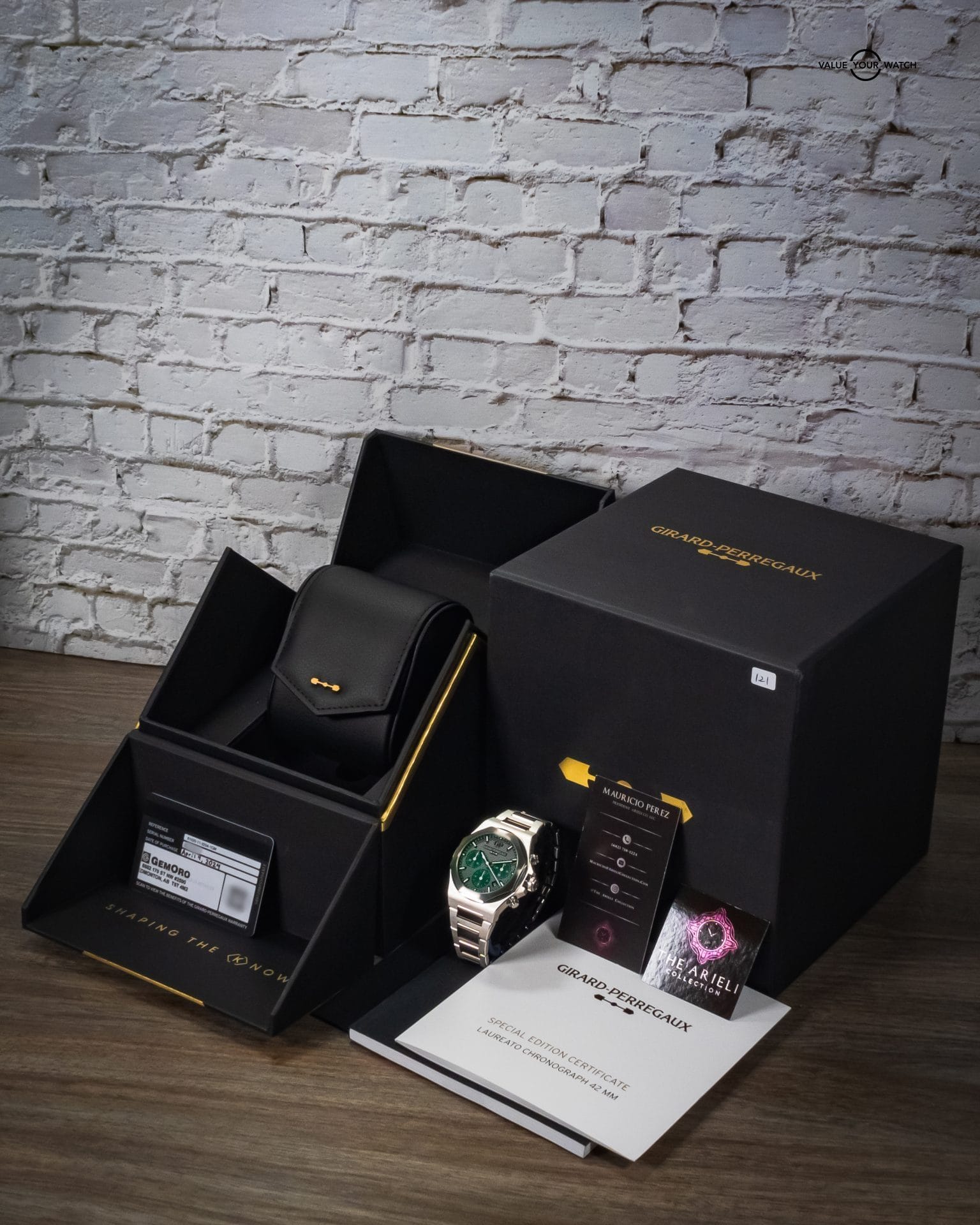 Hey watch enthusiasts, Mauricio from The Arieli Collection here! Thrilled to unveil this stunning, unworn Girard-Perregaux Laureato Chronograph. This is a true collector’s piece, limited to only 100 pieces worldwide! Reference number is: 81020-11-3254-1GM
