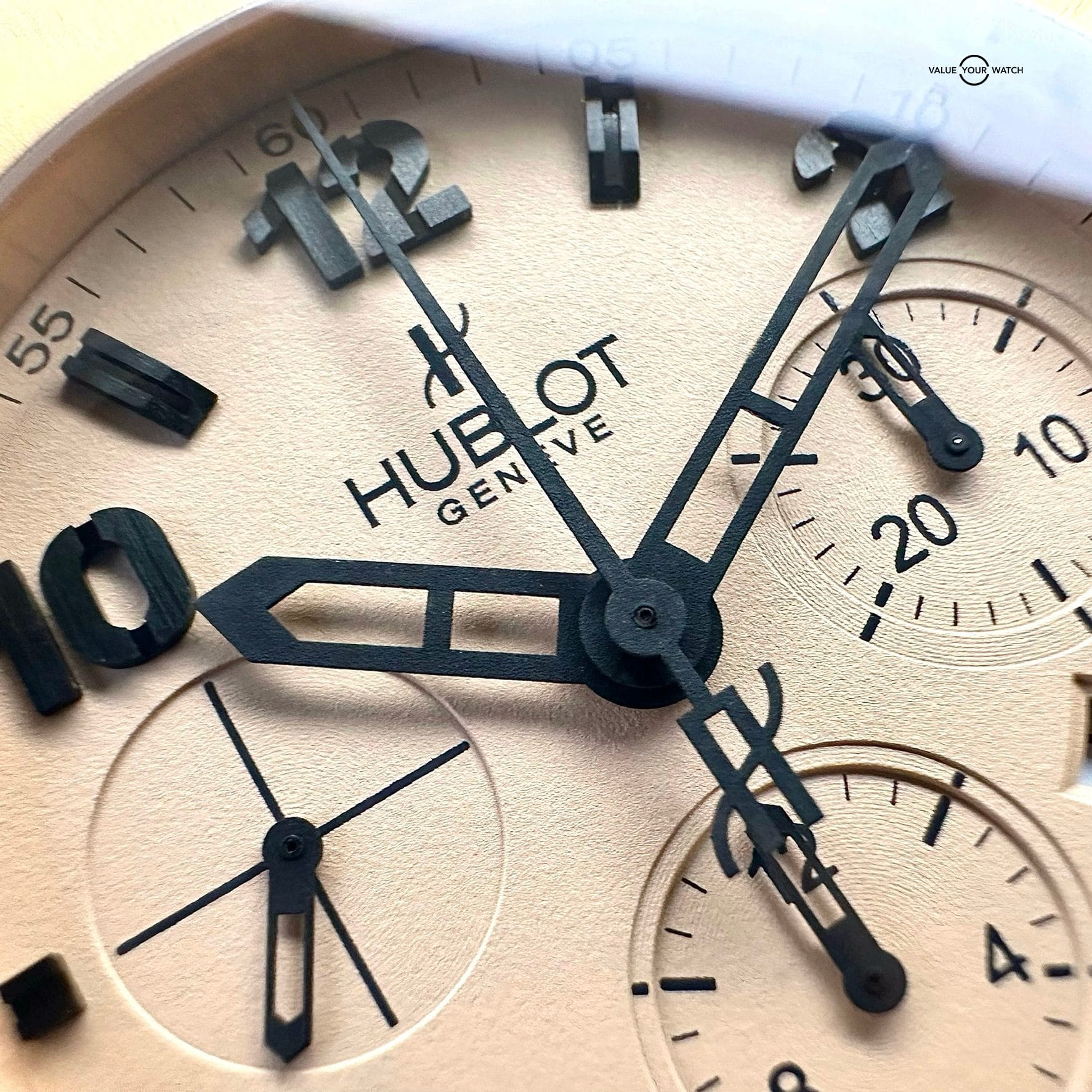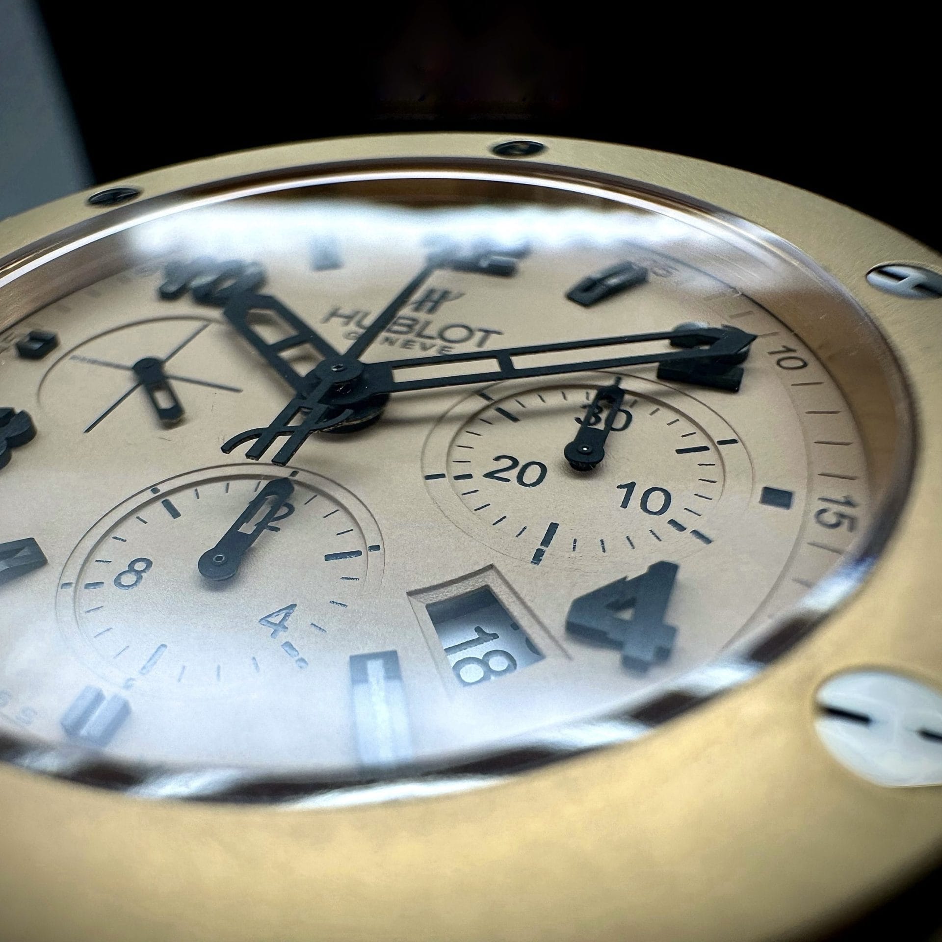 Up for sale I have a very unique matte gold Big Bang. The heft of this one is so gratifying. You never forget you’re wearing a precious metal. The matte salmon dial goes brilliantly with the textured matte rose gold case, and is extremely legible with its black hands and hour markers to match the black rubber strap.