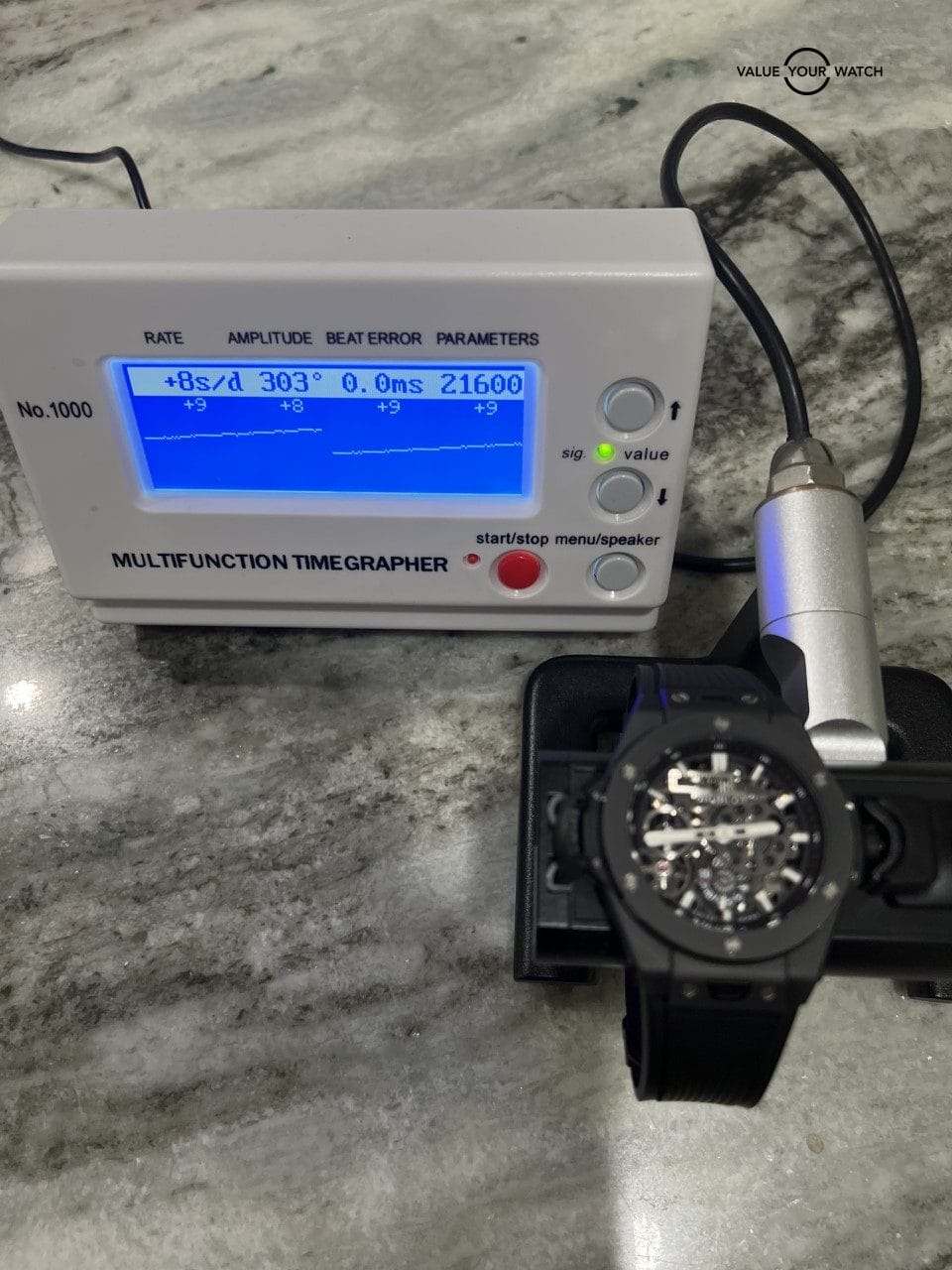 – Special Comments: One of the best models Hublot has to offer. The name of Meca-10 refers to what makes this watch so special, it is fully mechanical with a stunning 10 day power reserve. You can basically leave this watch on your stand for a week and half and still have power and accurate time when you decide to wear it again. The Case and the bezel are titanium and black ceramic which makes it very light weight and very comfortable on the wrist. Dial is fully skeletonized where you can literally see through it, but very easy to read due to its white gold lumed indices and hands. Warranty card was dated 2020, so watch is pretty much recent. Timegrapher results were very good so there is no need for service anytime soon.