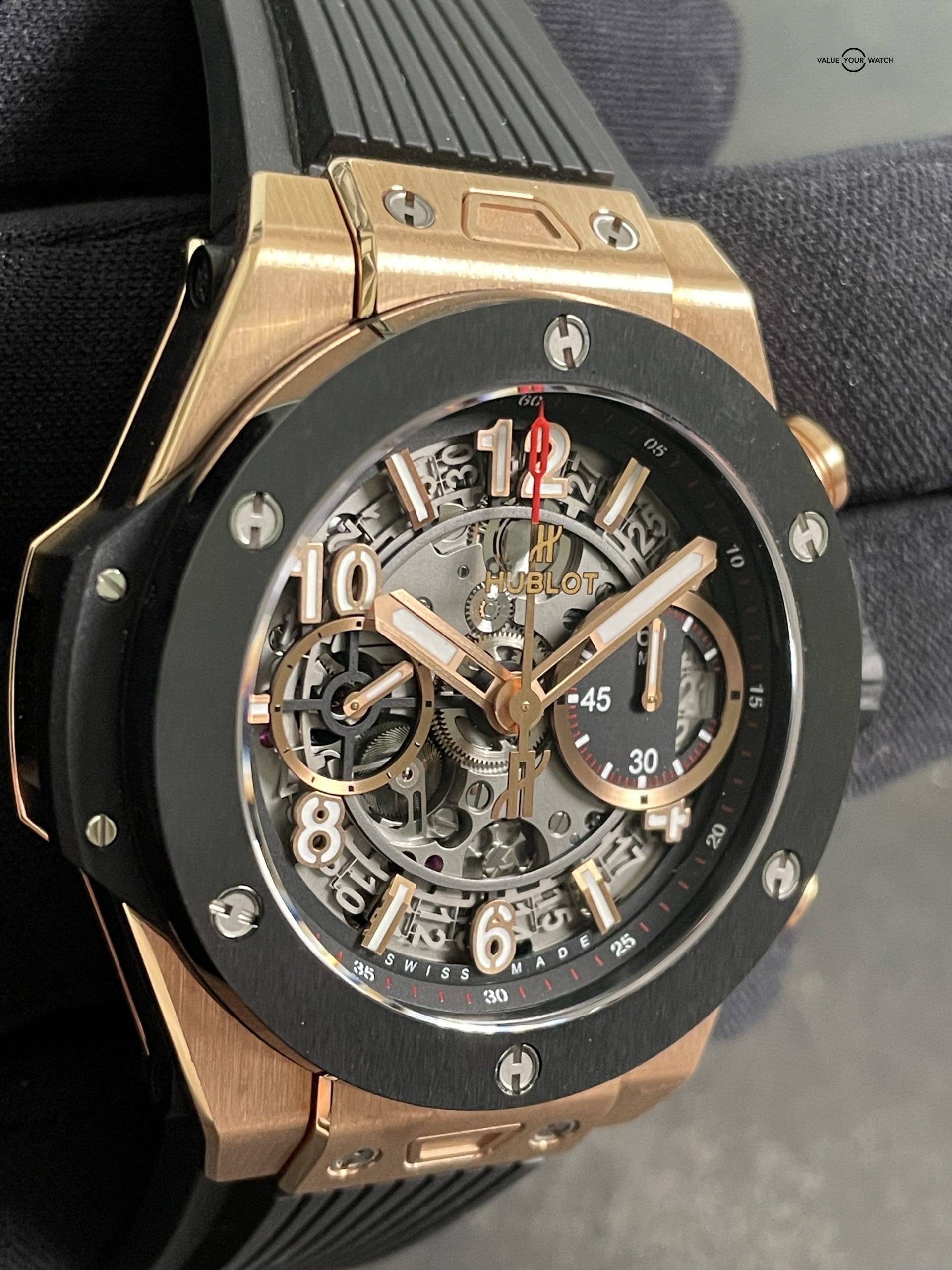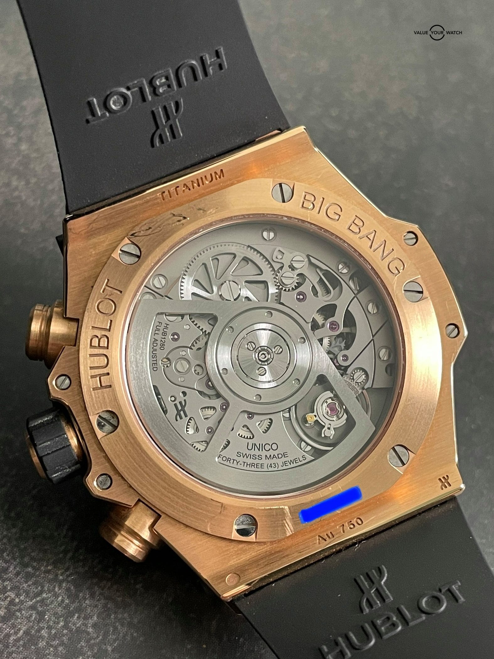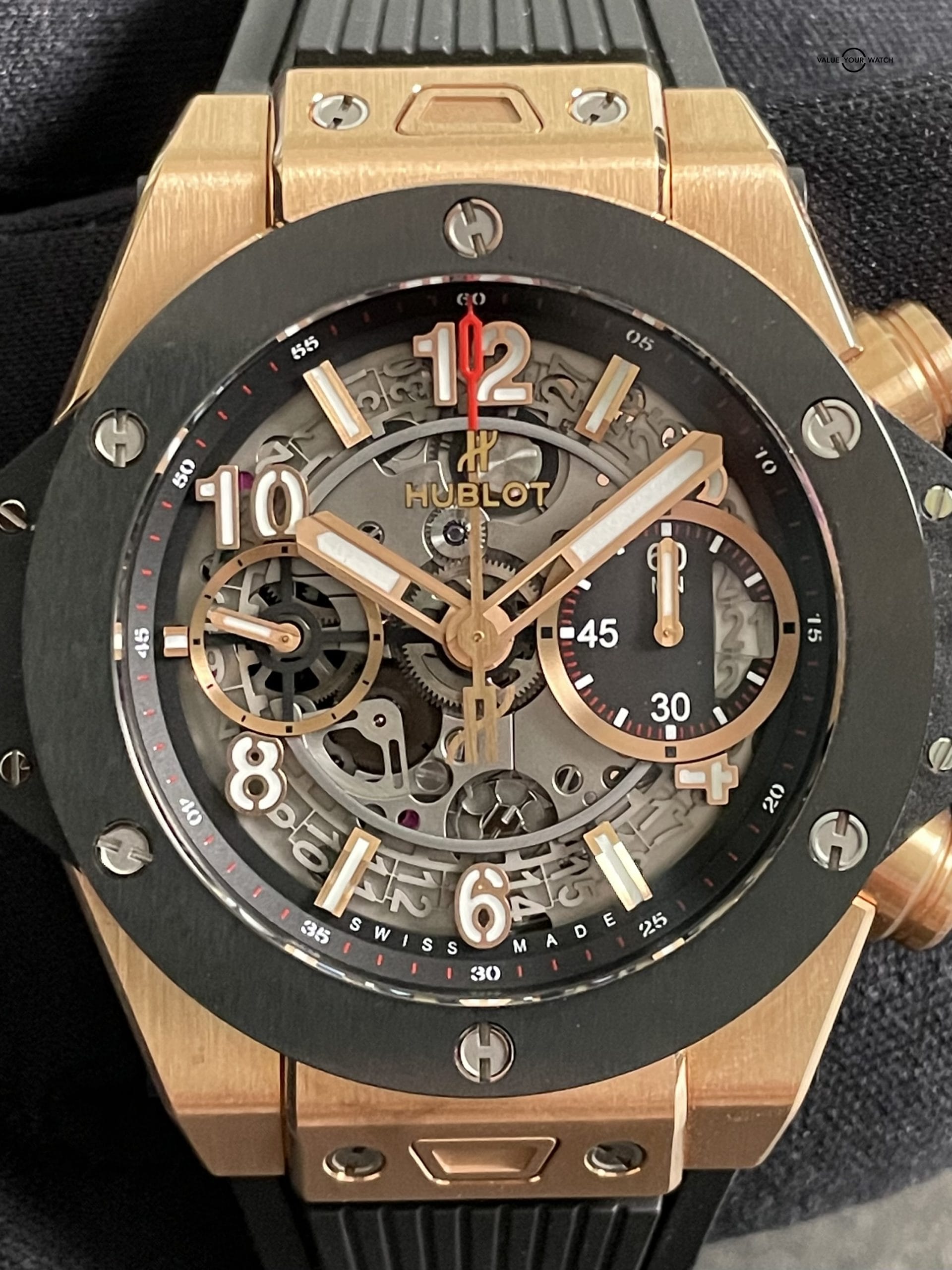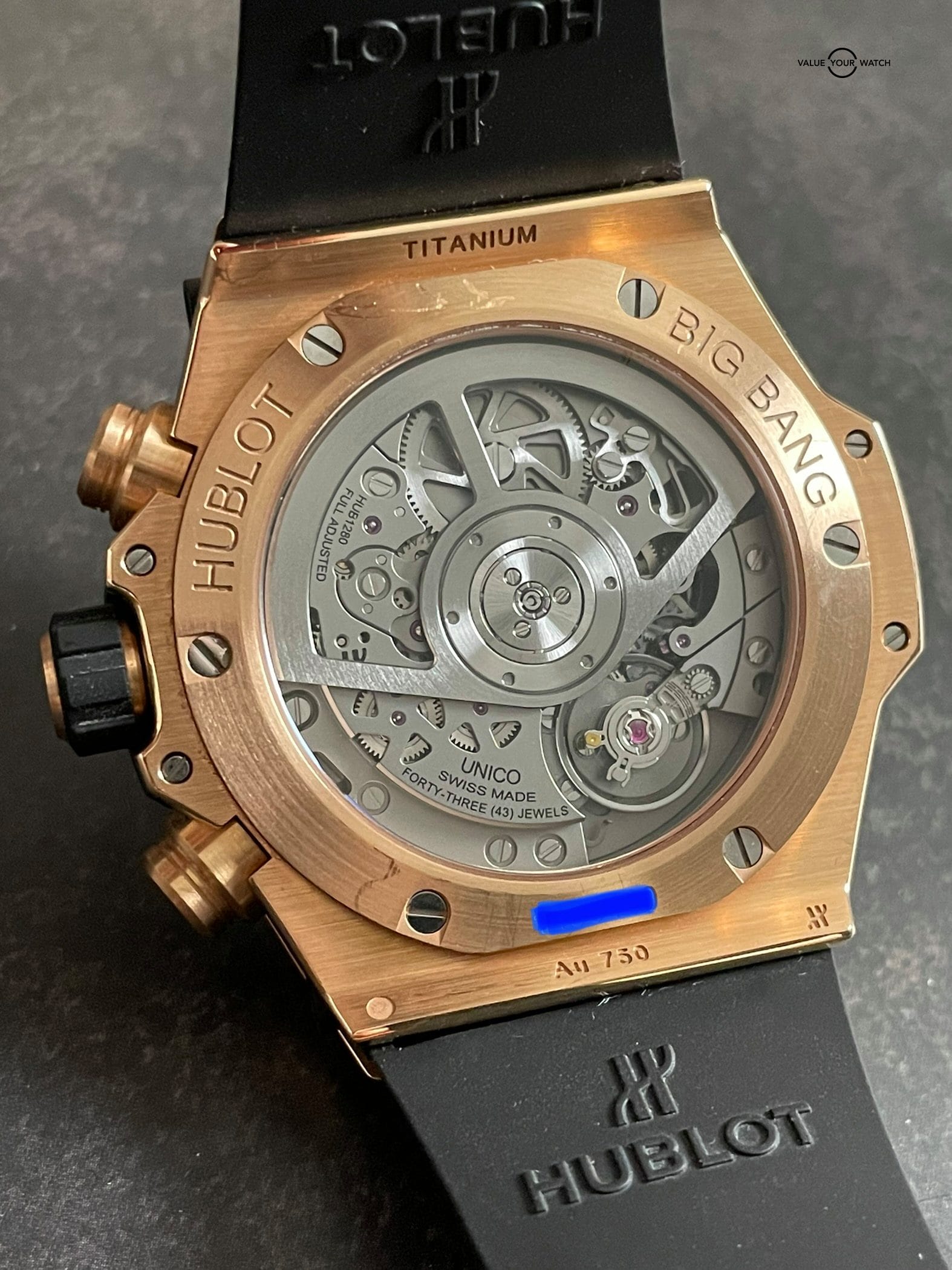 This watch was originally purchased at retail for $33,600 in March of 2020 from the Hublot AD and is in great shape. Included are the original Hublot outer box, Hublot “portal” style inner box, Hublot International Warranty card and extra red rubber Hublot strap. It is in complete working order and keeping great time. The case, crystal and strap are in great shape with minimal signs of wear. The clasp shows some light signs of wear at the edges of the black PVD coating. This is an incredible way to get into a gold Unico for a fraction of the retail price!