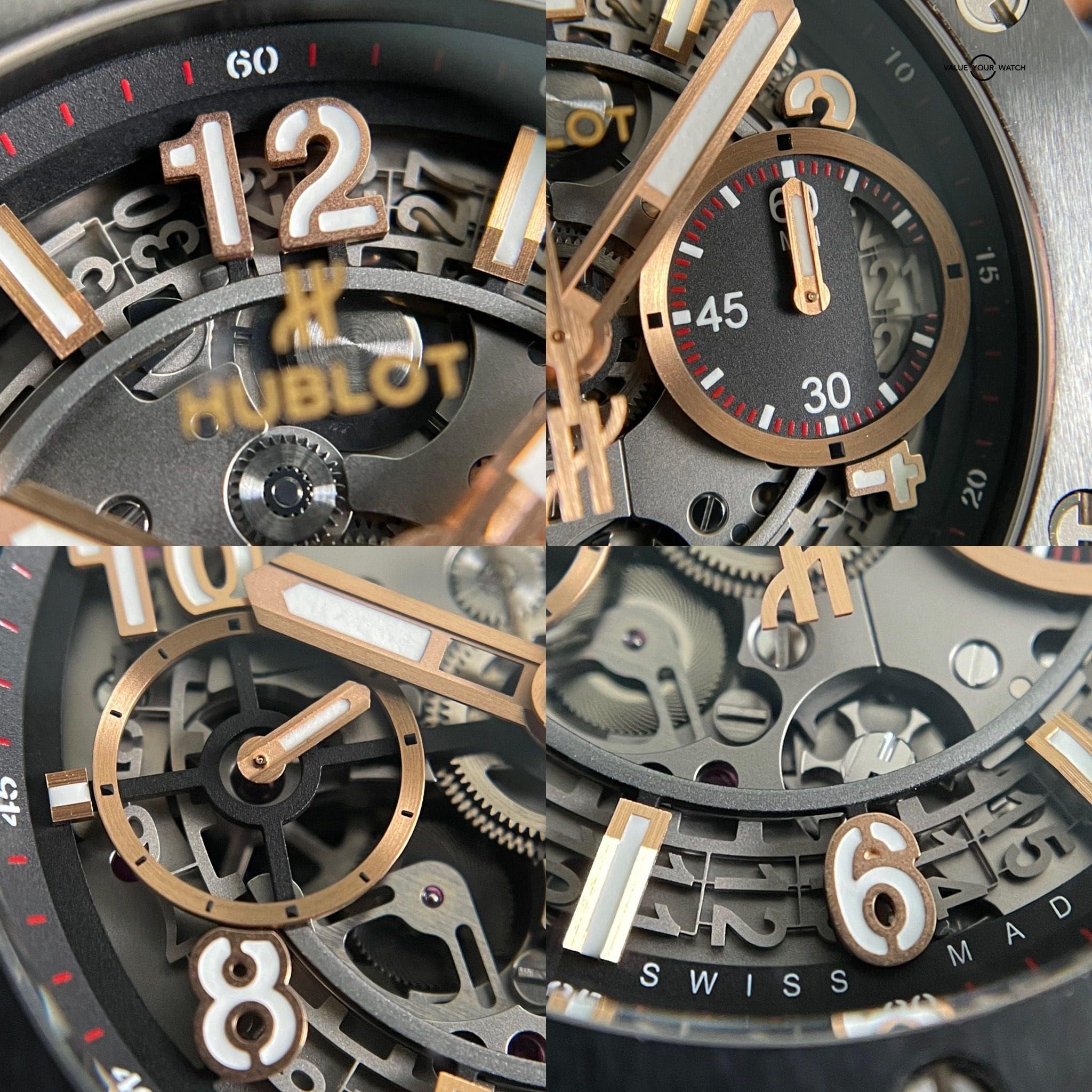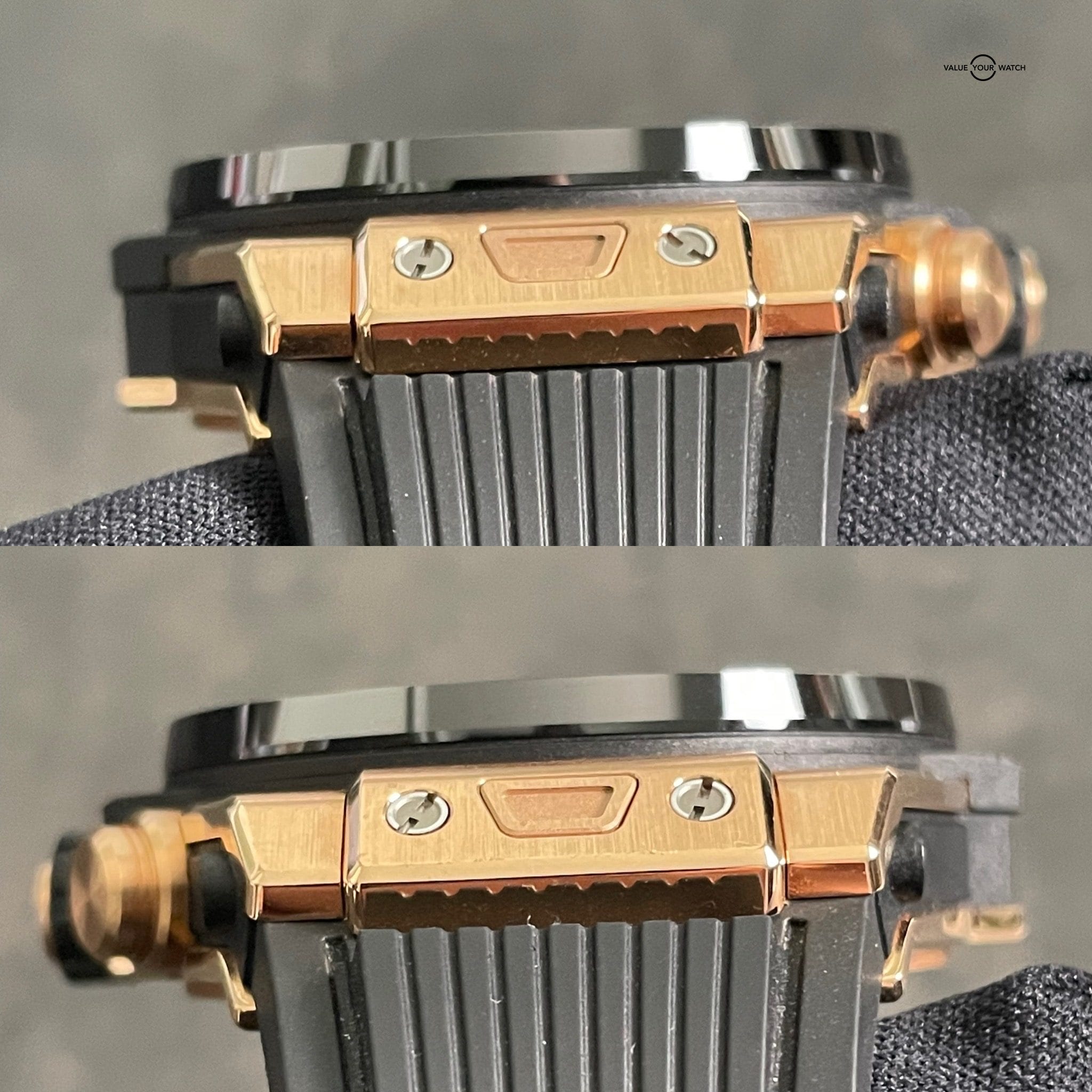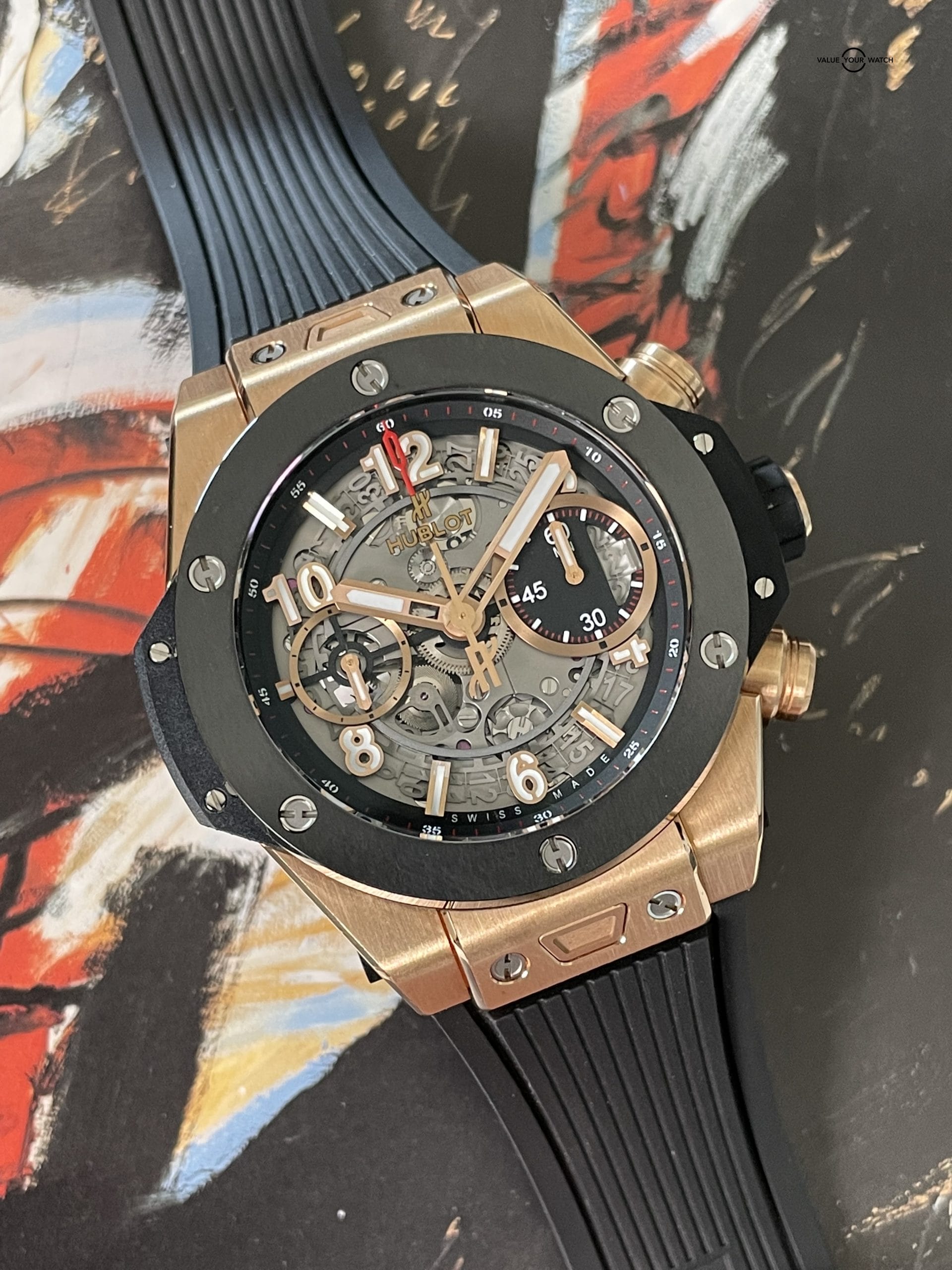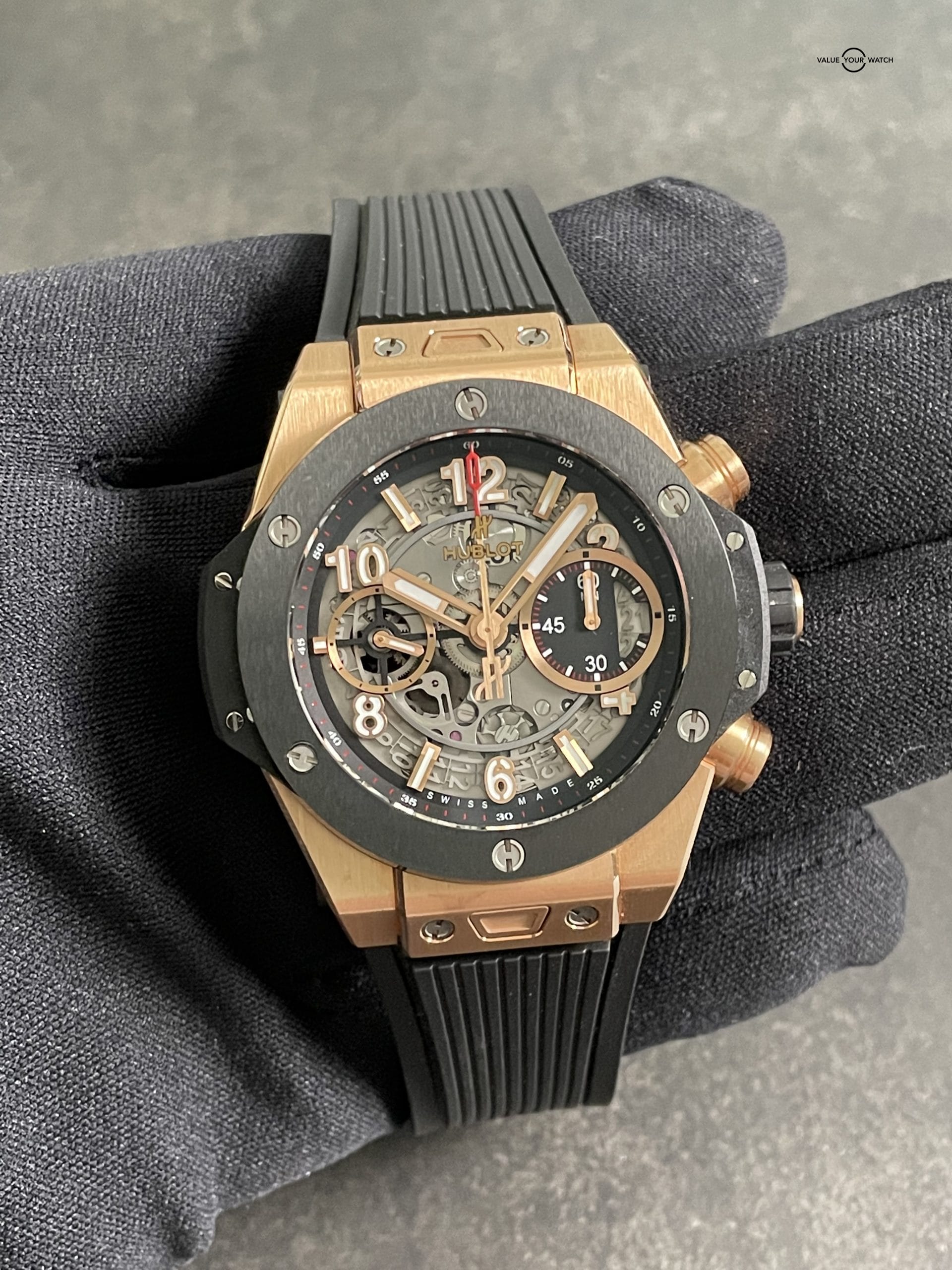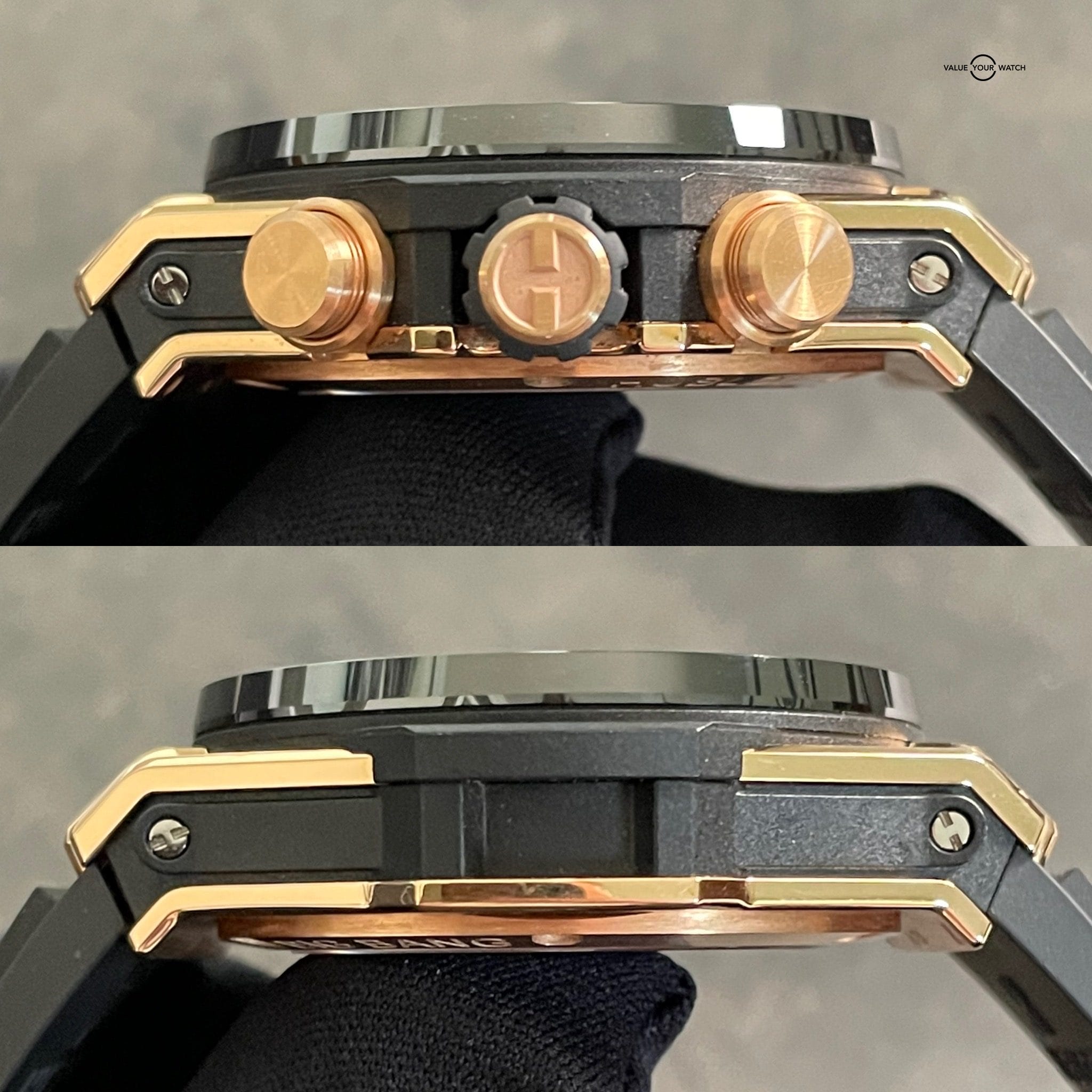 This watch was originally purchased at retail for $33,600 in March of 2020 from the Hublot AD and is in great shape. Included are the original Hublot outer box, Hublot “portal” style inner box, Hublot International Warranty card and extra red rubber Hublot strap. It is in complete working order and keeping great time. The case, crystal and strap are in great shape with minimal signs of wear. The clasp shows some light signs of wear at the edges of the black PVD coating. This is an incredible way to get into a gold Unico for a fraction of the retail price!