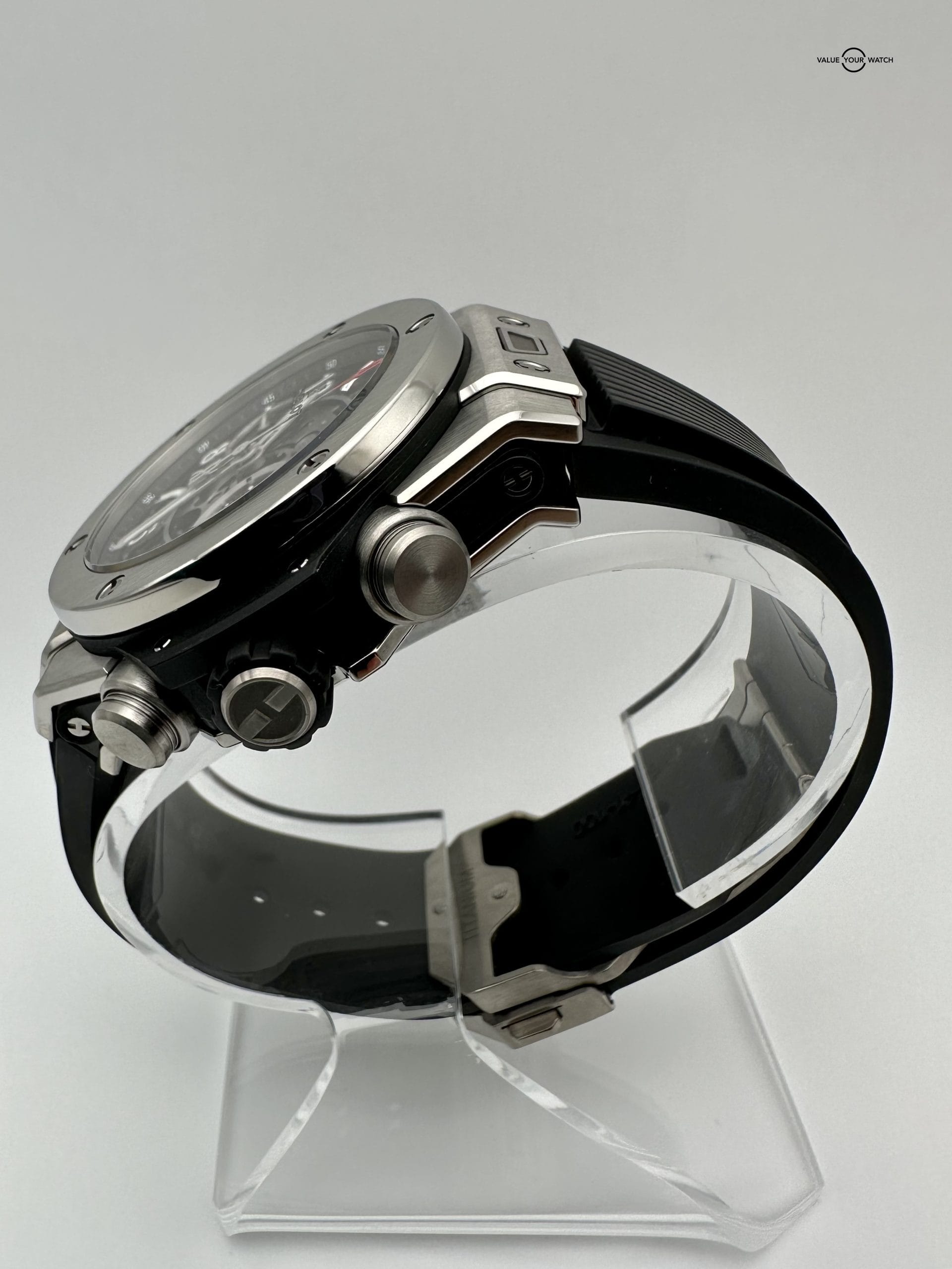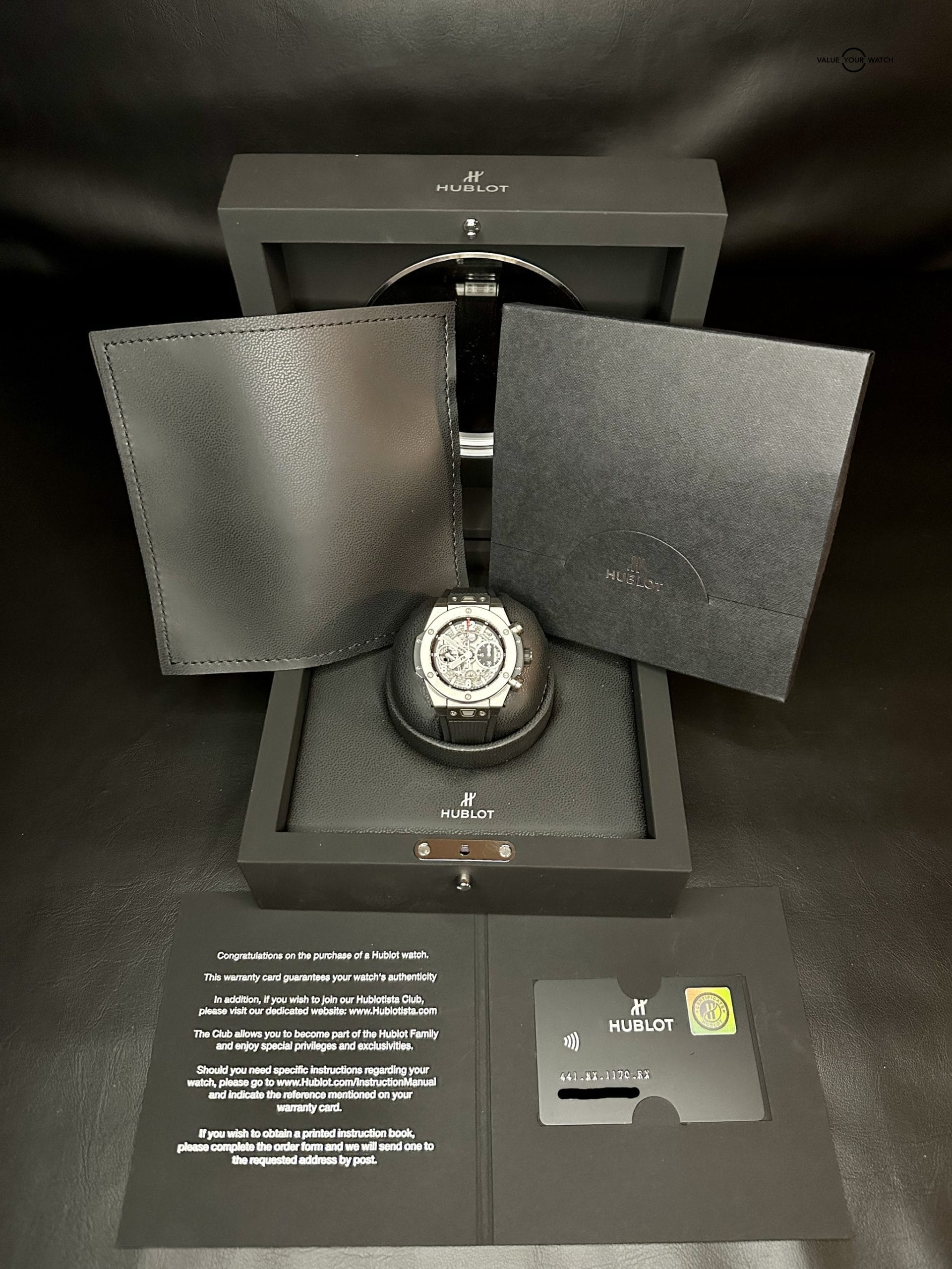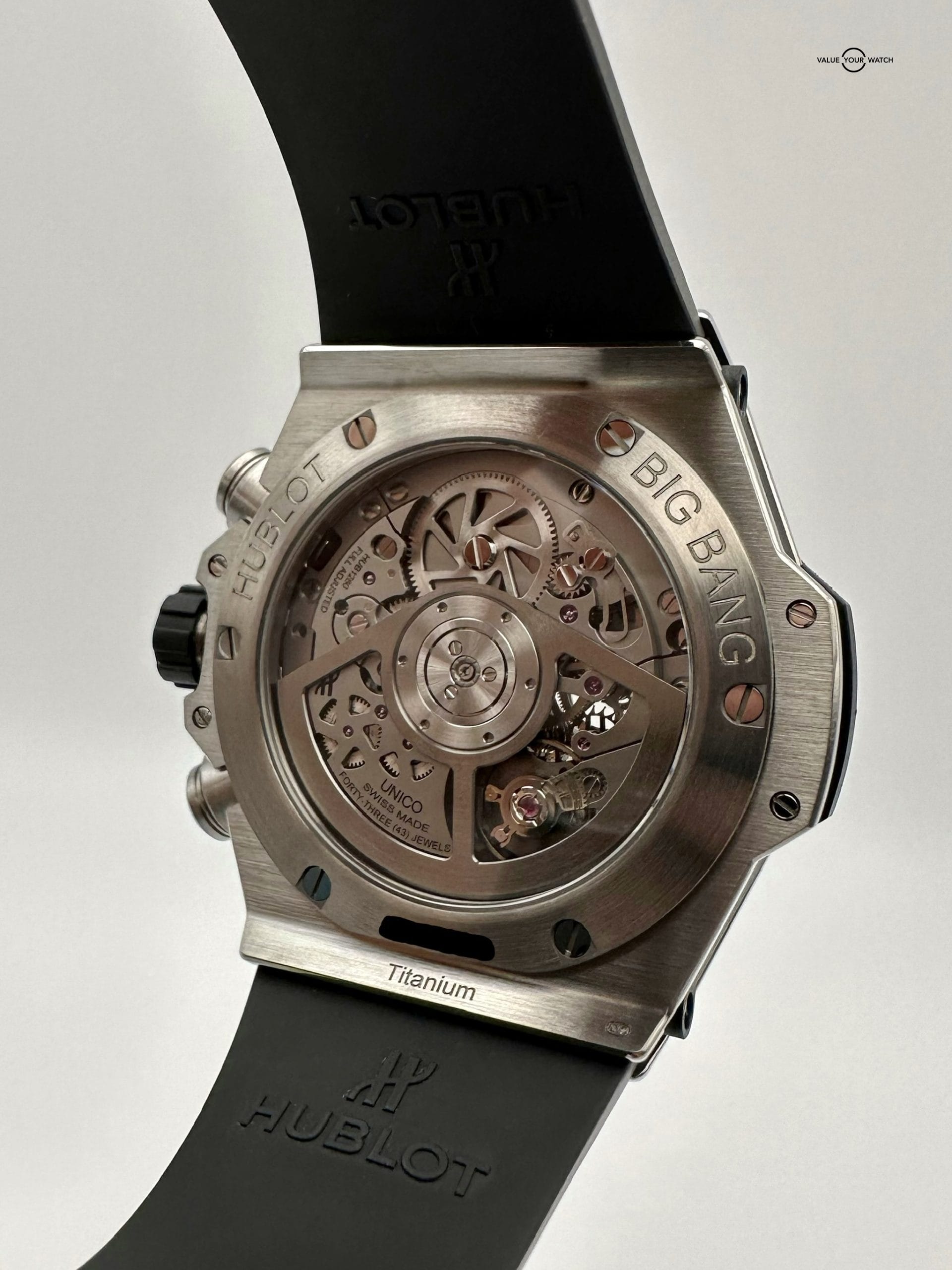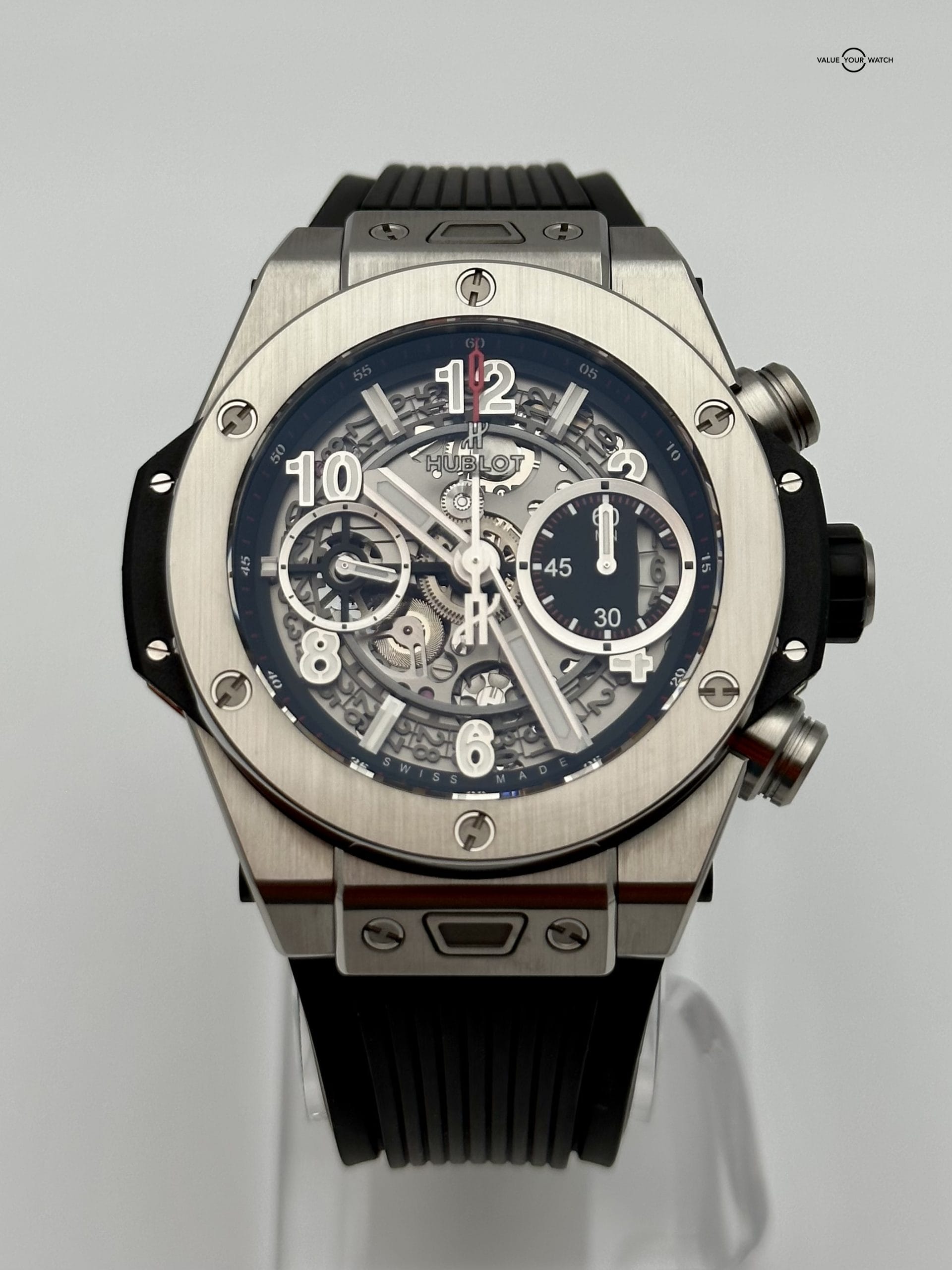 Hublot Big Bang Unico Titanium 42mm self-winding automatic watch, featuring a 42mm titanium case surrounding a Unico 2 caliber movement, skeletonized dial on a black-lined rubber strap with a titanium deployment buckle. Functions include hours, minutes, small seconds, date, chronograph and a 72-hour power reserve.