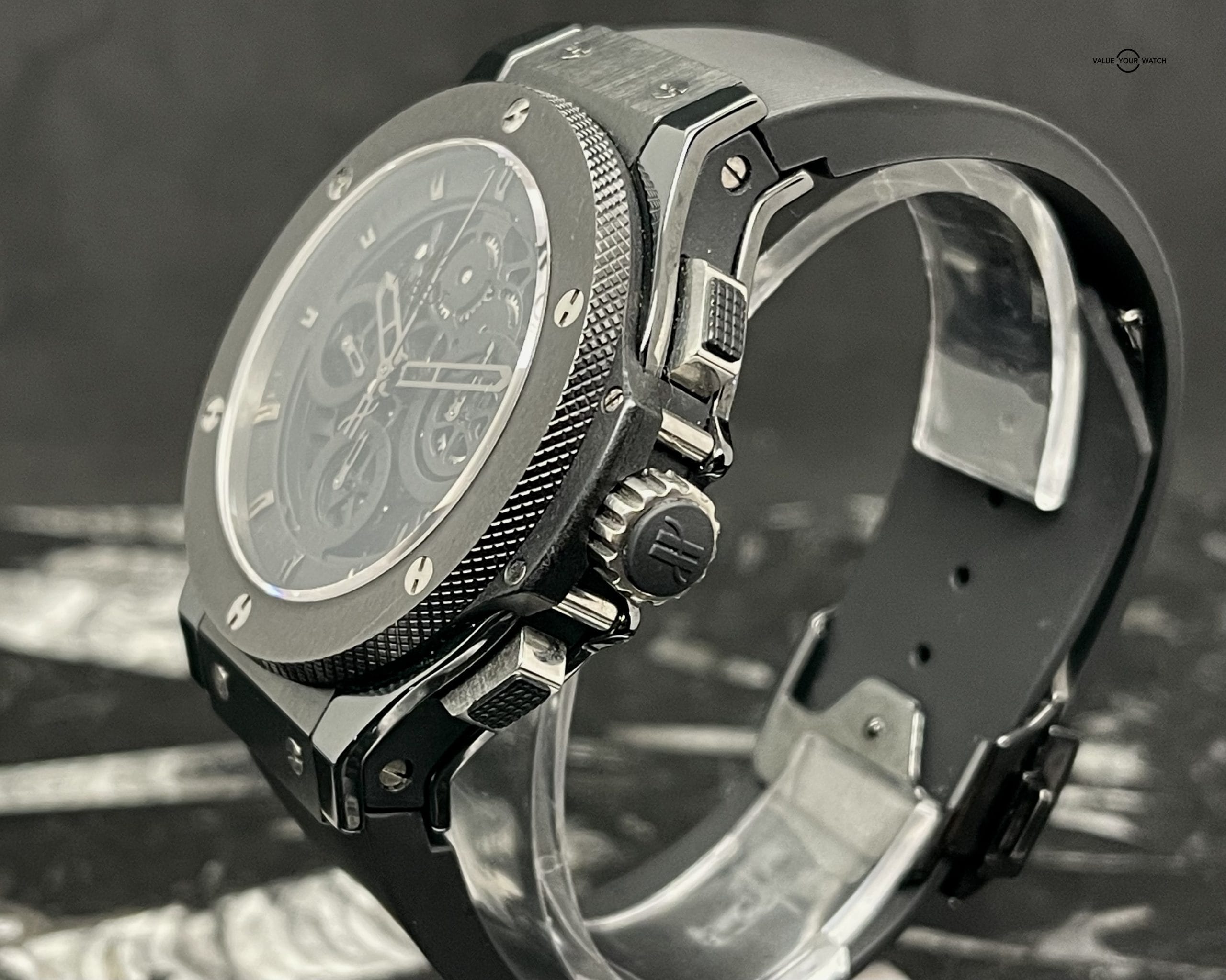 A very unique blacked out skeleton Hublot limited to only 500 worldwide! Photos do not do this watch justice. This watch comes with the inner and outer box plus filled warranty card. The rubber band is in great shape, the PVD coating on the clasp shows some wear, and there are a couple micro nicks in the crystal around 12 o’clock but is otherwise void of scratches. The original retail price of this watch was over $22,000. Get this beautiful pre-owned time piece before it’s gone!