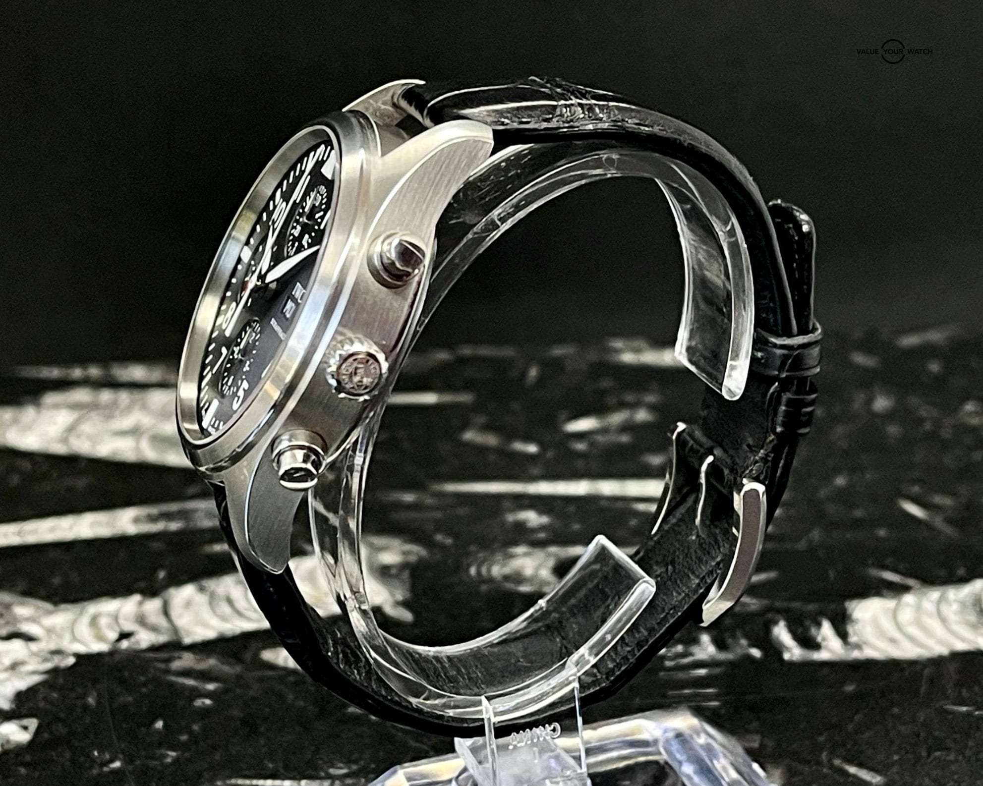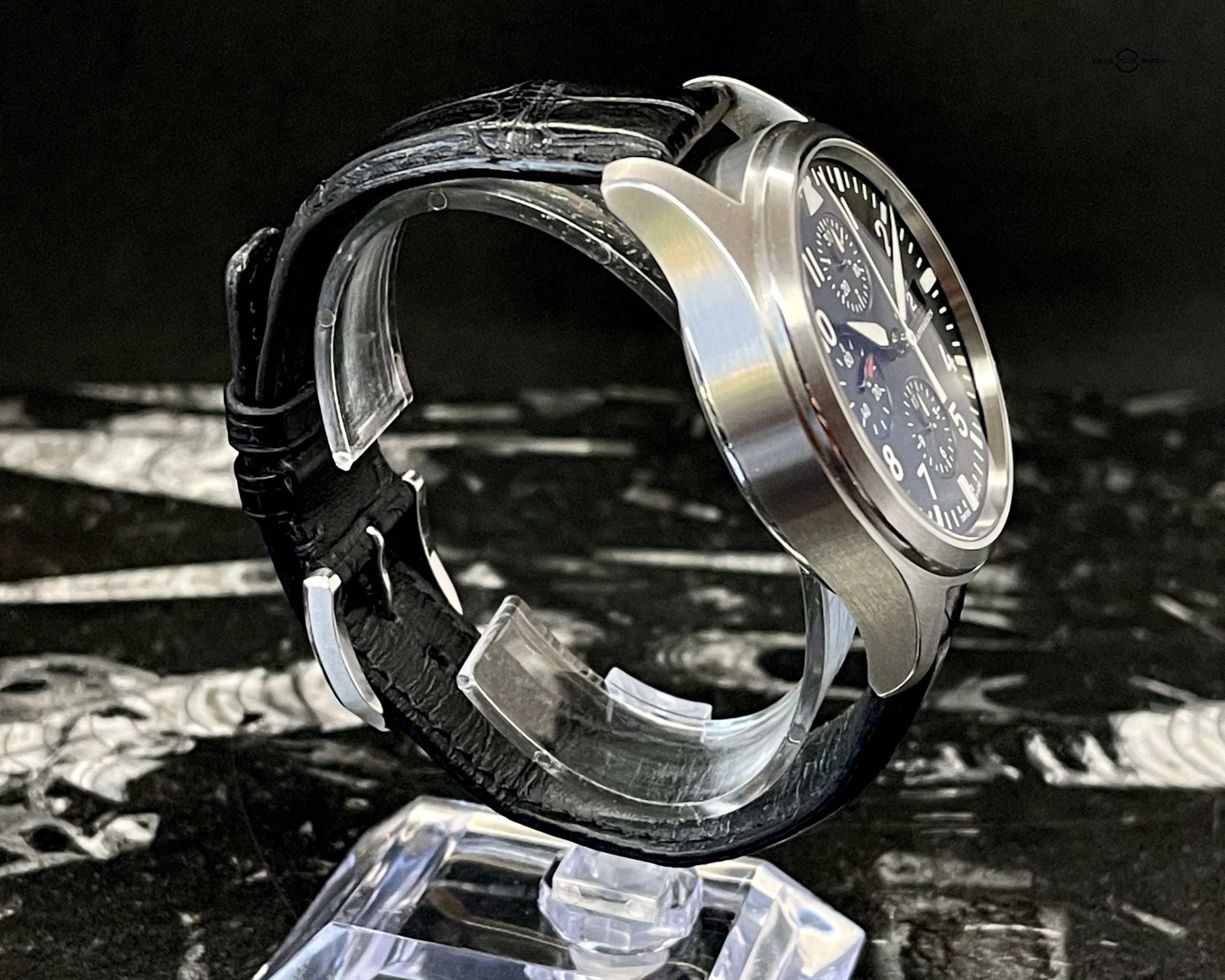 A beautiful, classically designed pilots watch with oversized hands, ar coating on the crystal, and matte finishes throughout for the best viewing experience. Keeping true to its pilots heritage, this IWC has the ability to retain crystal and seals should it be involved in explosive decompression of a cockpit environment. This watch comes with box, manuals, and blank warranty card. The leather band is in great condition, the case only has two light blemishes, the buckle has very minimal scratching, and the sapphire is flawless. Get this beautiful pre-owned time piece before it’s gone!