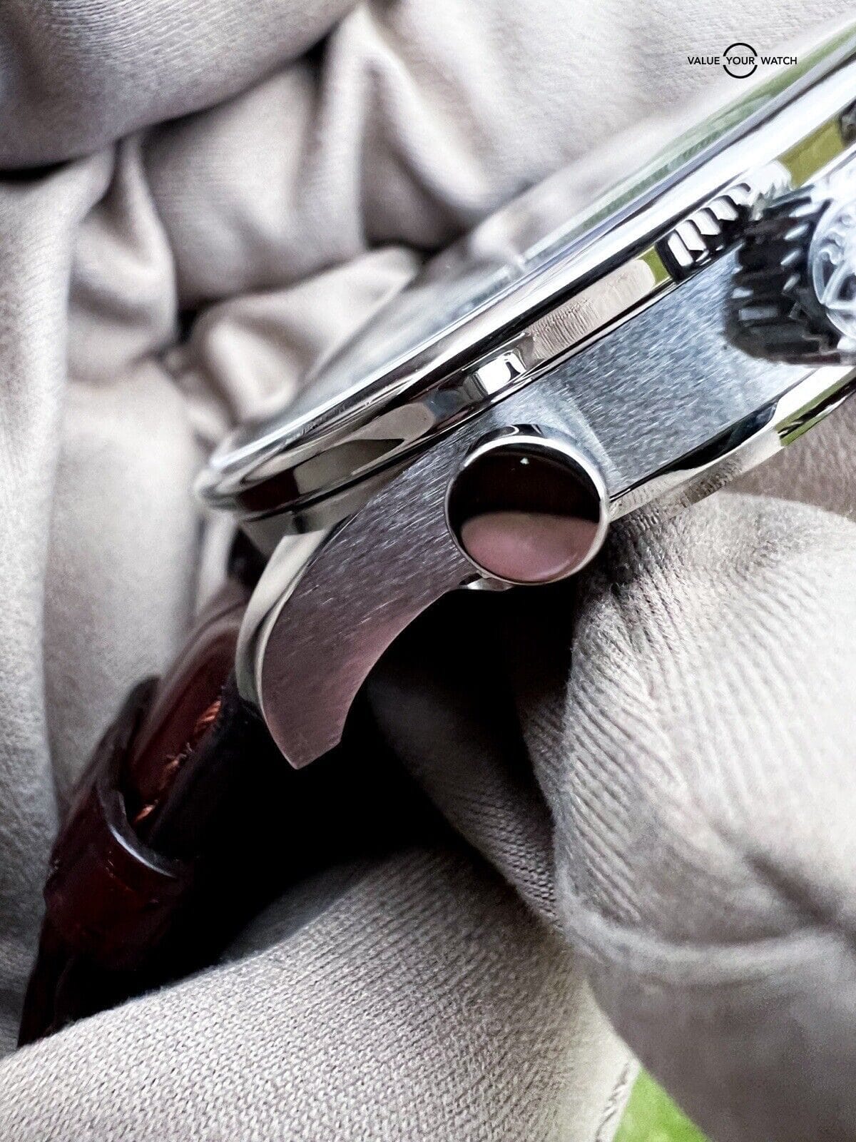 This IWC Portuguese Chrono Automatic watch is a stylish and functional timepiece that is perfect for any modern man. It features a 41mm stainless steel case with a see-through caseback, which allows you to admire the Swiss automatic movement. The black dial has day/date display, chronograph function, and a GMT complication. The watch is water-resistant up to 30m (3ATM) and comes with a black leather strap, in addition to two other two-piece straps.