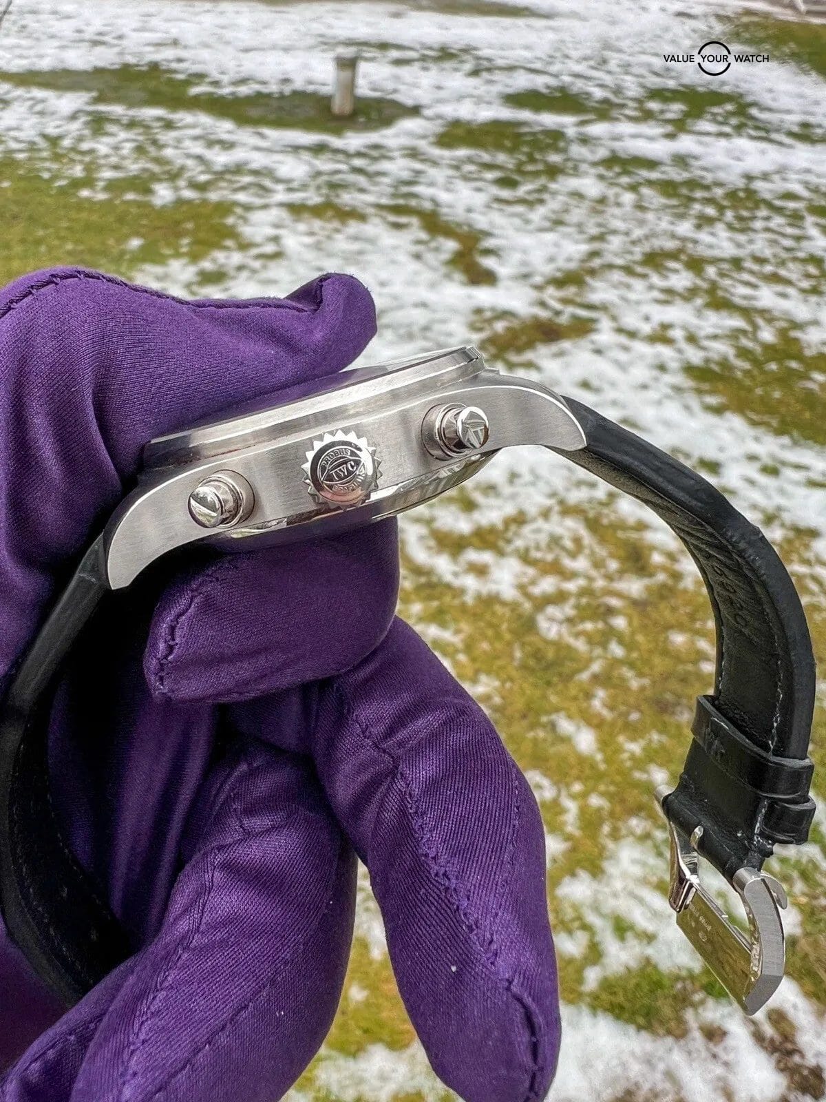 Experience the ultimate in aviation-inspired style with this IWC Pilot’s Watch. Made of durable stainless steel, this watch features a black dial with arrow markers, Arabic numerals, and baton indexes. The luminous hands make it easy to tell time even in low-light conditions, and the multi-dial display includes a day/date function and chronograph for added convenience.