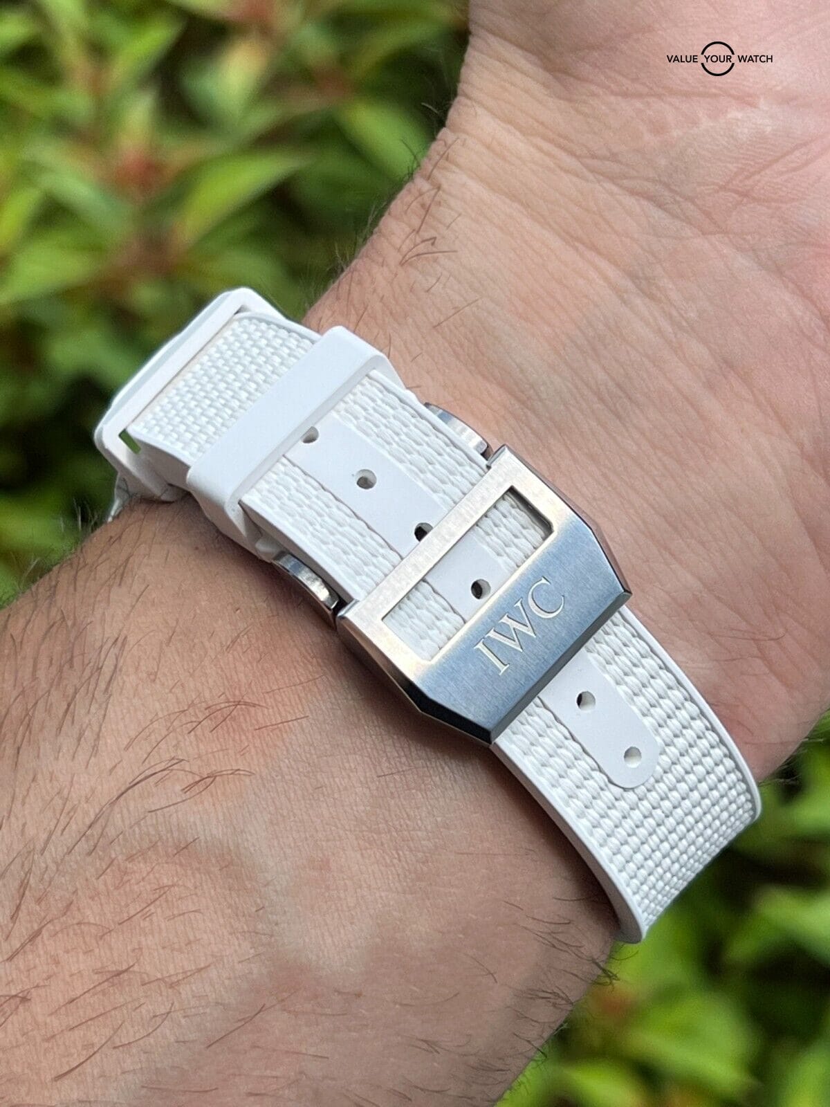 A subdued white with a mysterious shimmer: the ceramic color “Lake Tahoe” is inspired by the “Service Dress White” uniform of the US Navy, but also by the contrasting winter landscape with the snow-covered peaks around the largest freshwater lake in the Sierra Nevada. The elite pilots from the TOP GUN flight school often fly over this mountainous landscape. White ceramic is emblematic of IWC’s comprehensive ceramic expertise. The brand experimented with this colour as early as during the 1980s. The striking white ceramic case of the Pilot’s Watch Chronograph TOP GUN Edition “Lake Tahoe” is combined with a black dial and black hands, as well as white print and luminescence. The case back featuring the TOP GUN logo is made of titanium, while the pushers and crown are made of stainless steel. Inside the ceramic case with a diameter of 44 millimetres, the IWC-manufacture 69380 calibre is at work. Featuring a classic column-wheel design, the chronograph also features a day and date display at 3 o’clock. A soft-iron inner case shields the movement from the effects of magnetic fields. This TOP GUN chronograph is fitted on a white rubber strap with a distinctive embossing, whose color has been perfectly matched to the “Lake Tahoe” case.