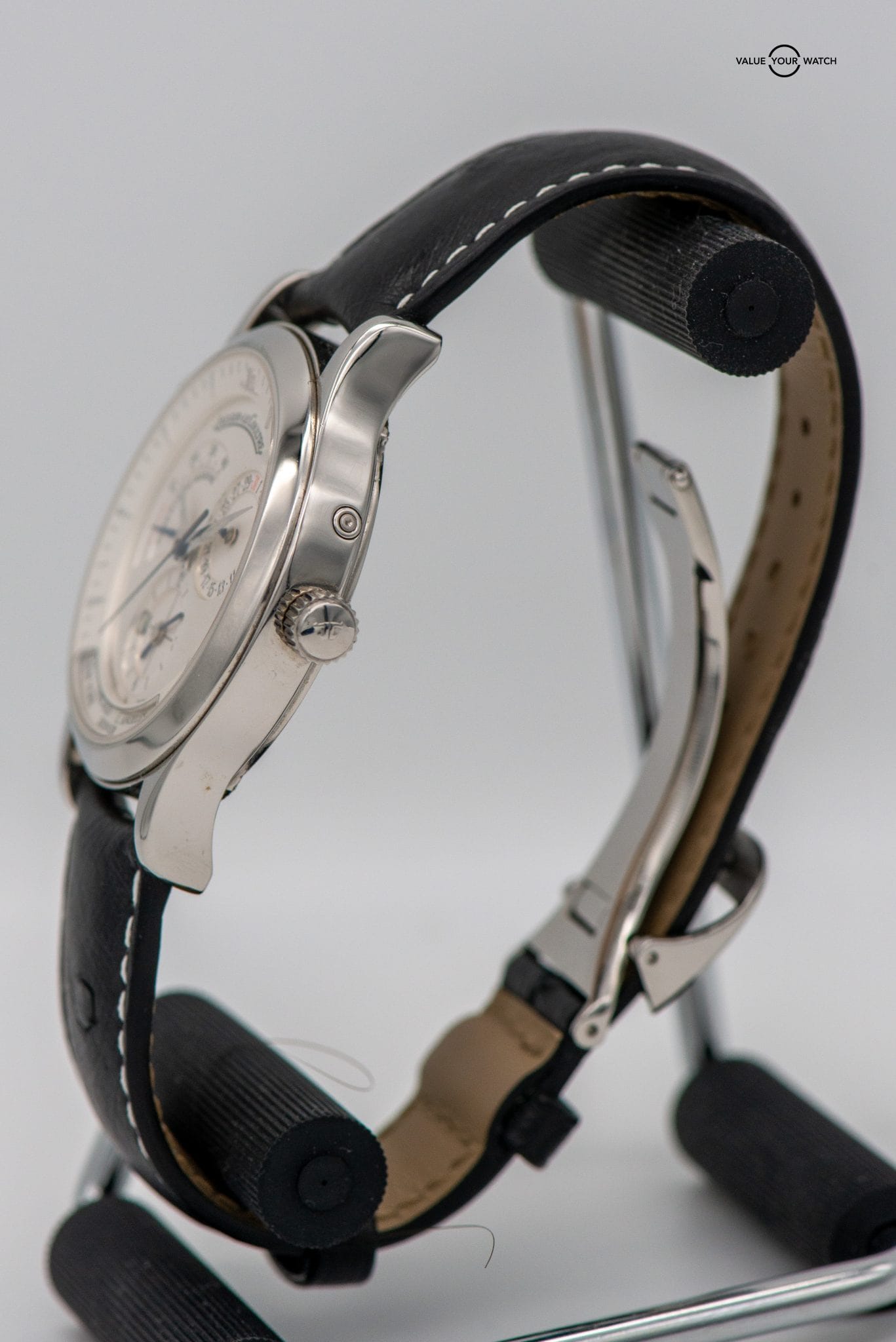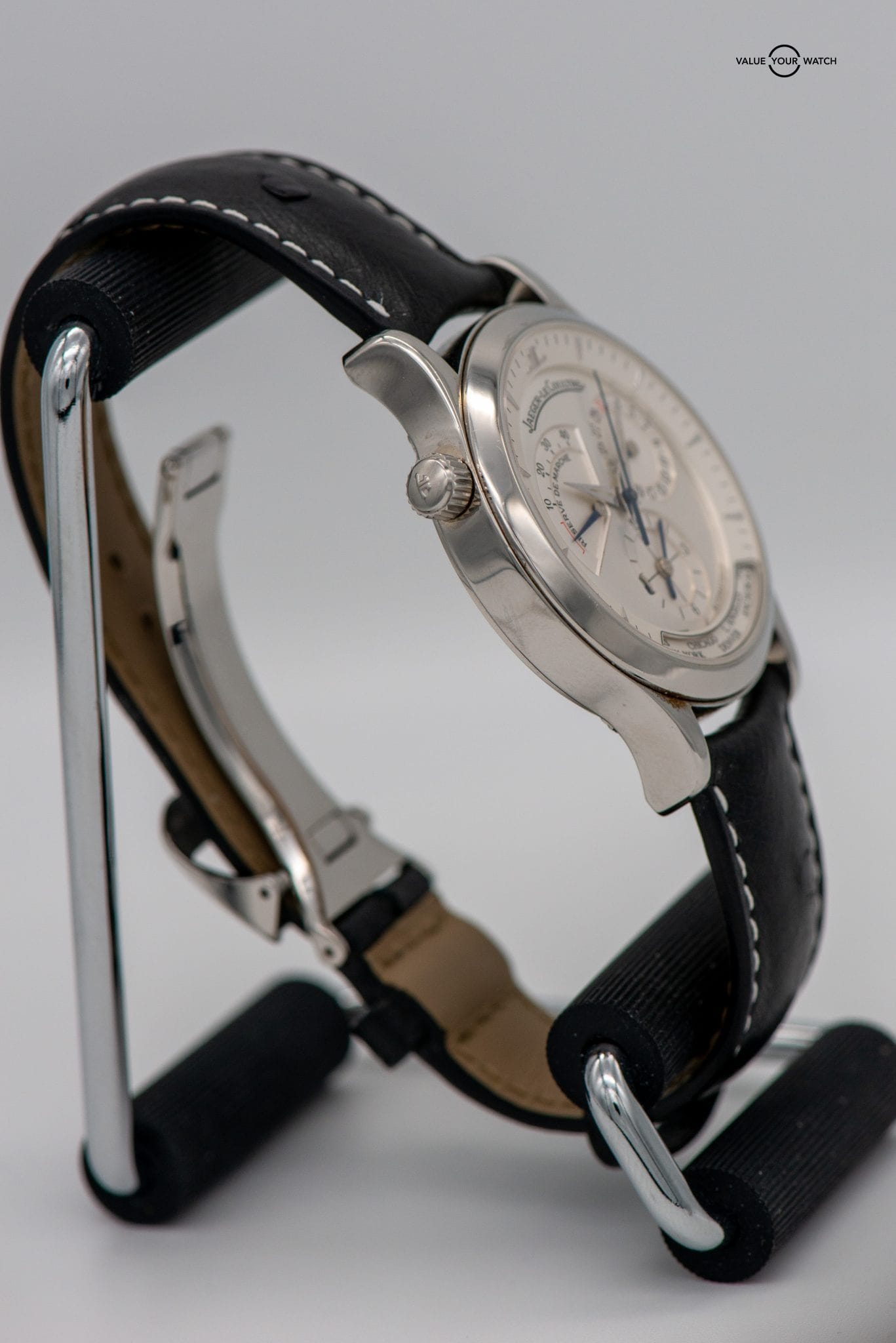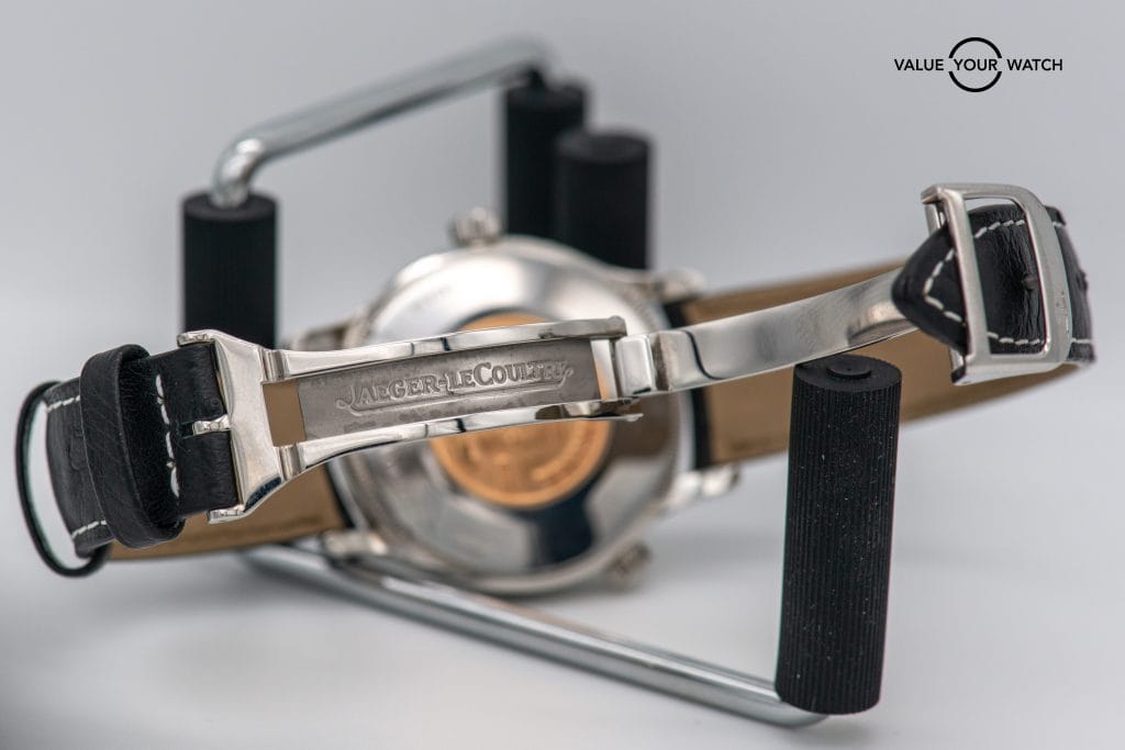 38mm SS GMT with dual time display, date and power reserve complications Newer black leather OEM strap on JLC SS deployant “Naked” = no box – no papers