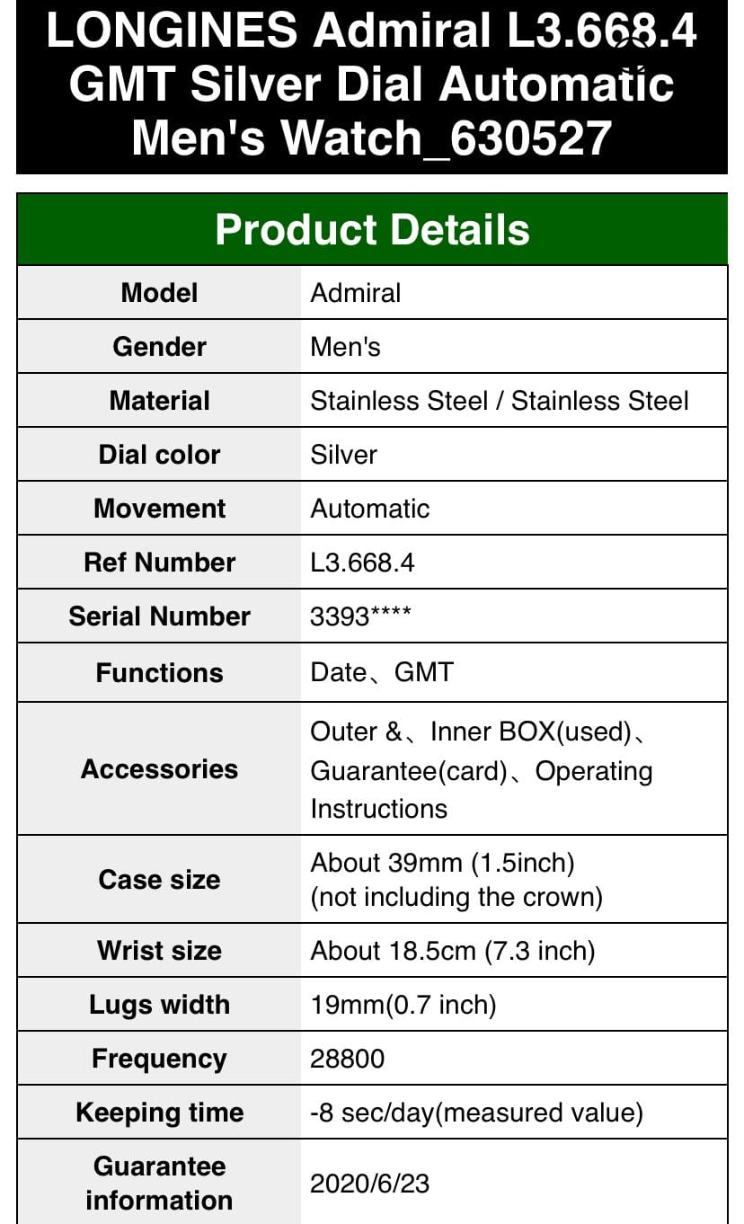 LONGINES Admiral L3.668.4 GMT Silver Dial Automatic, Mint, Full-Set