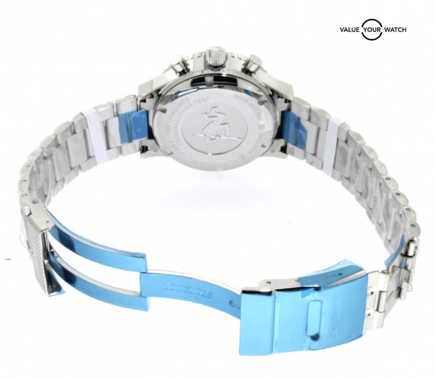 This Heritage Diver Chronograph is an automatic chronograph, fitted on a bracelet with folding clasp. Reversed panda dail with tachymeter, date-function. luminous markers and hands. The case is 42mm made in stainless steel with red bezel and screw-down crown. This watch is powered by Longines Caliber L688, a chronograph movement with column wheel, 28.800 vph and a power reserve of +/- 50 hours.
