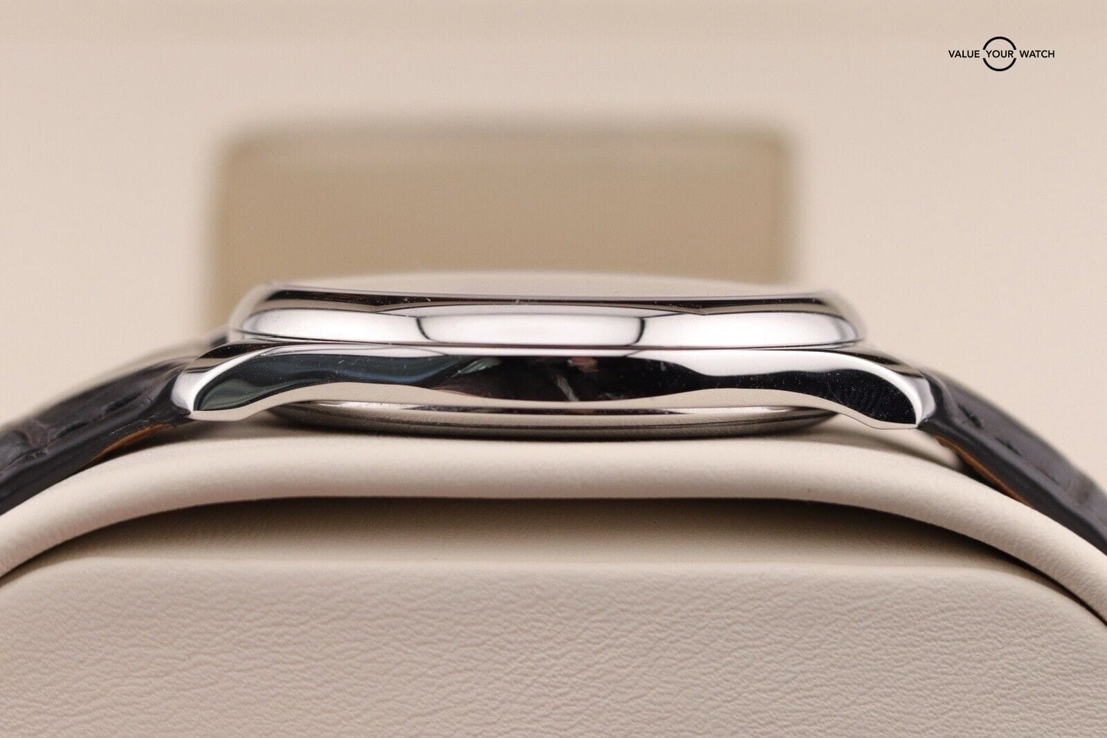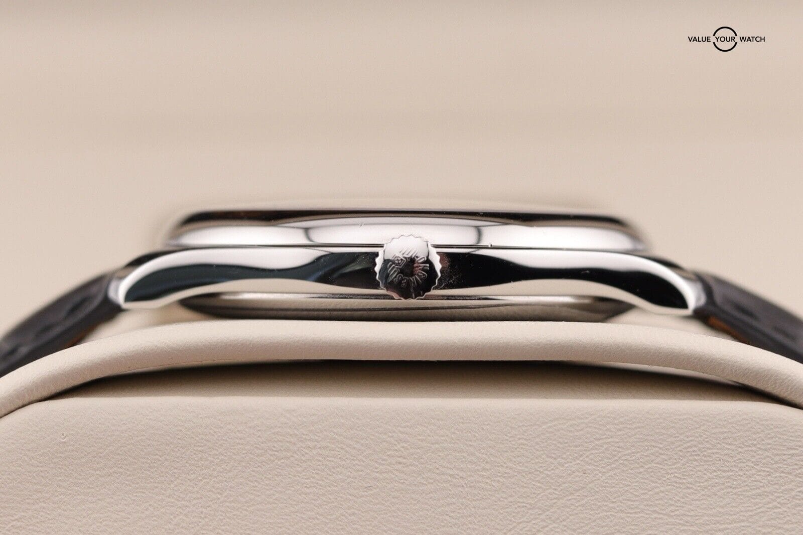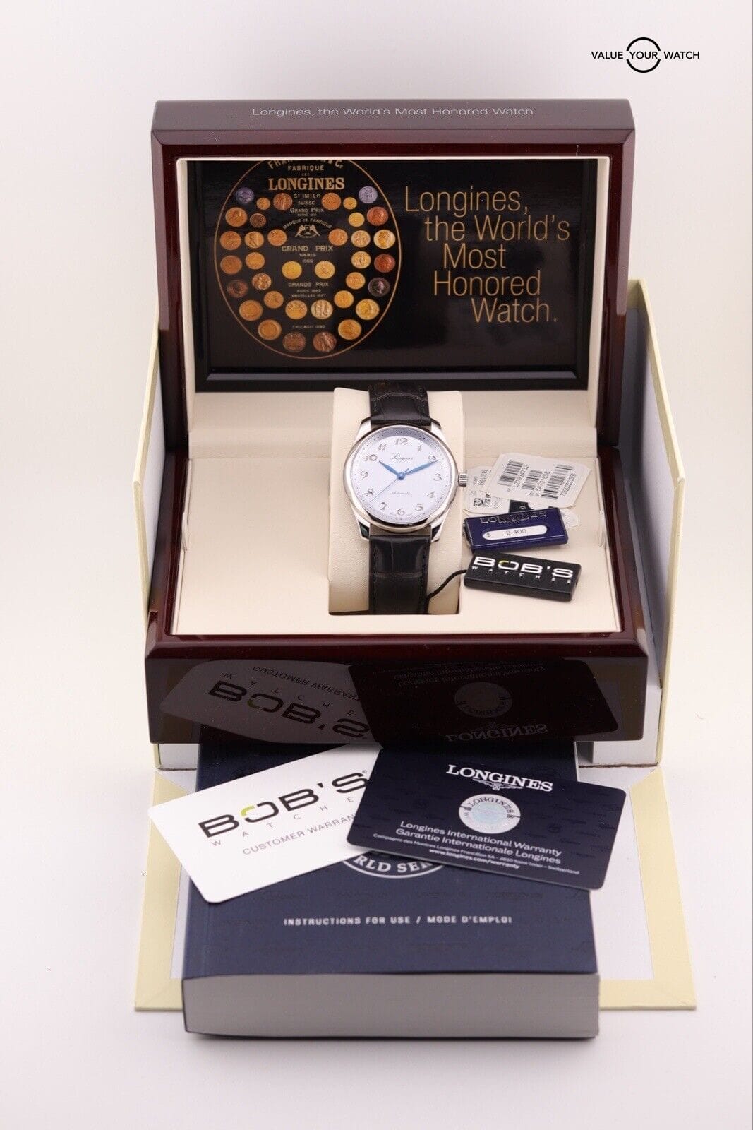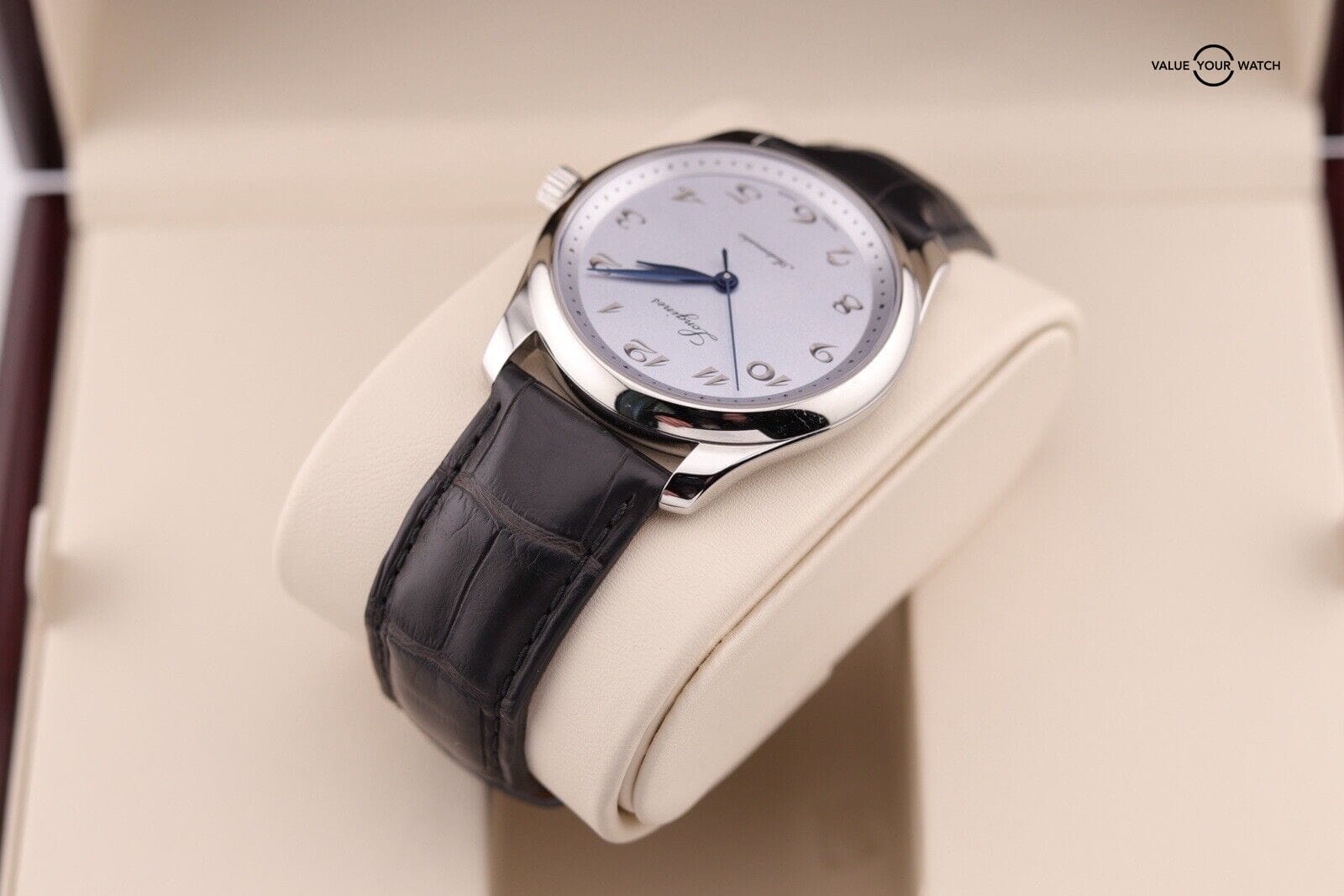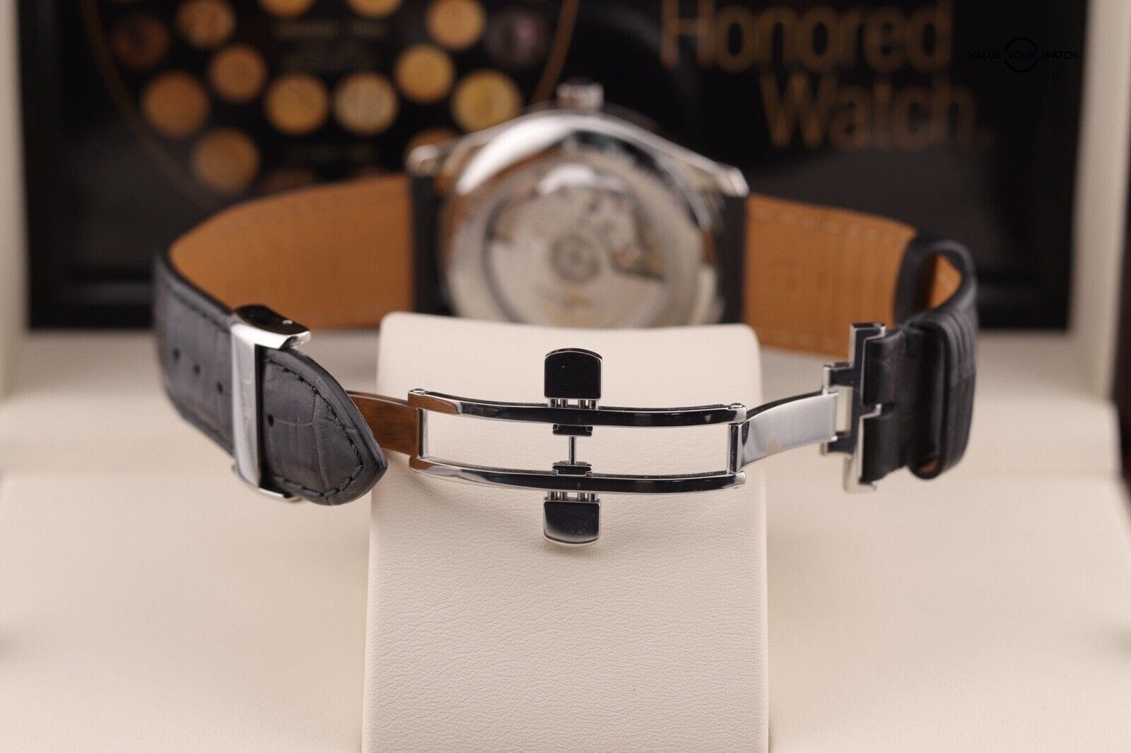 This Longines Master Collection watch comes with a two-piece gray leather strap, which is secured by a deployant closure. The watch has a case thickness of 9mm, a case size of 40mm, and a lug width of 21mm. It also features an exhibition caseback, which allows you to admire the inner workings of the mechanical (automatic) movement. The watch is accompanied by its original box and papers, making it a valuable addition to any collection.