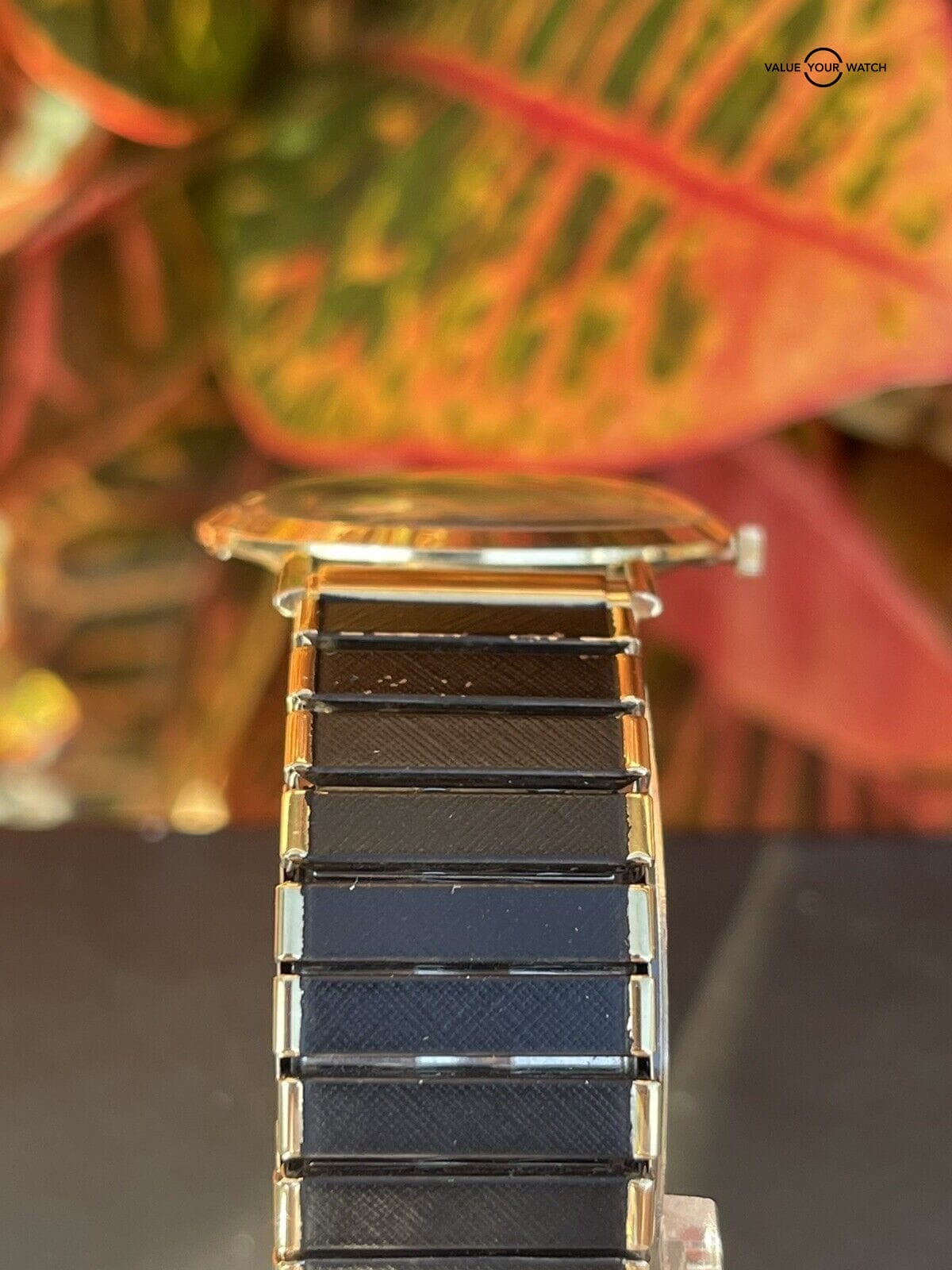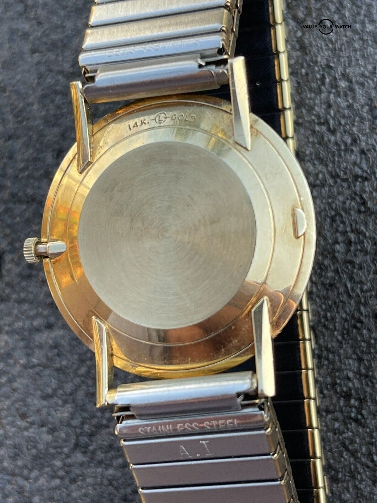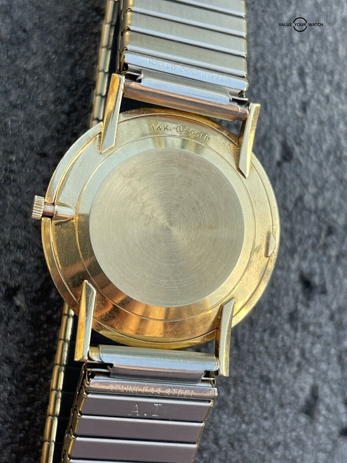 Stretch band is NOT gold. It is used and shows wear. Not original to the watch.