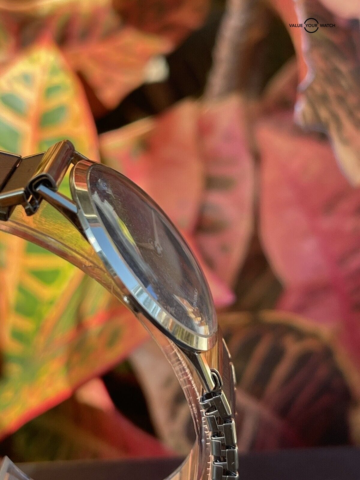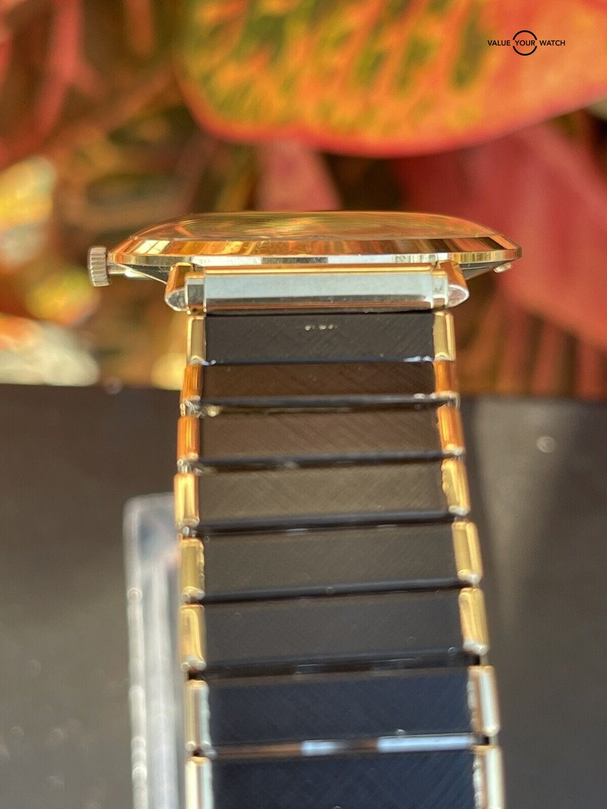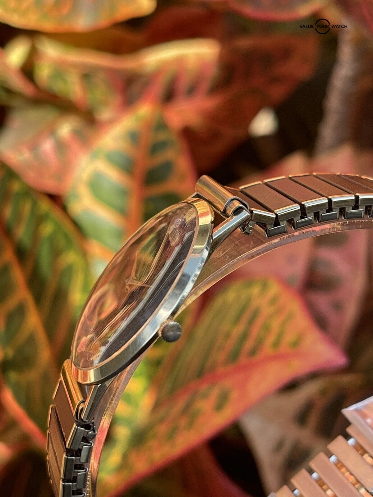 Stretch band is NOT gold. It is used and shows wear. Not original to the watch.