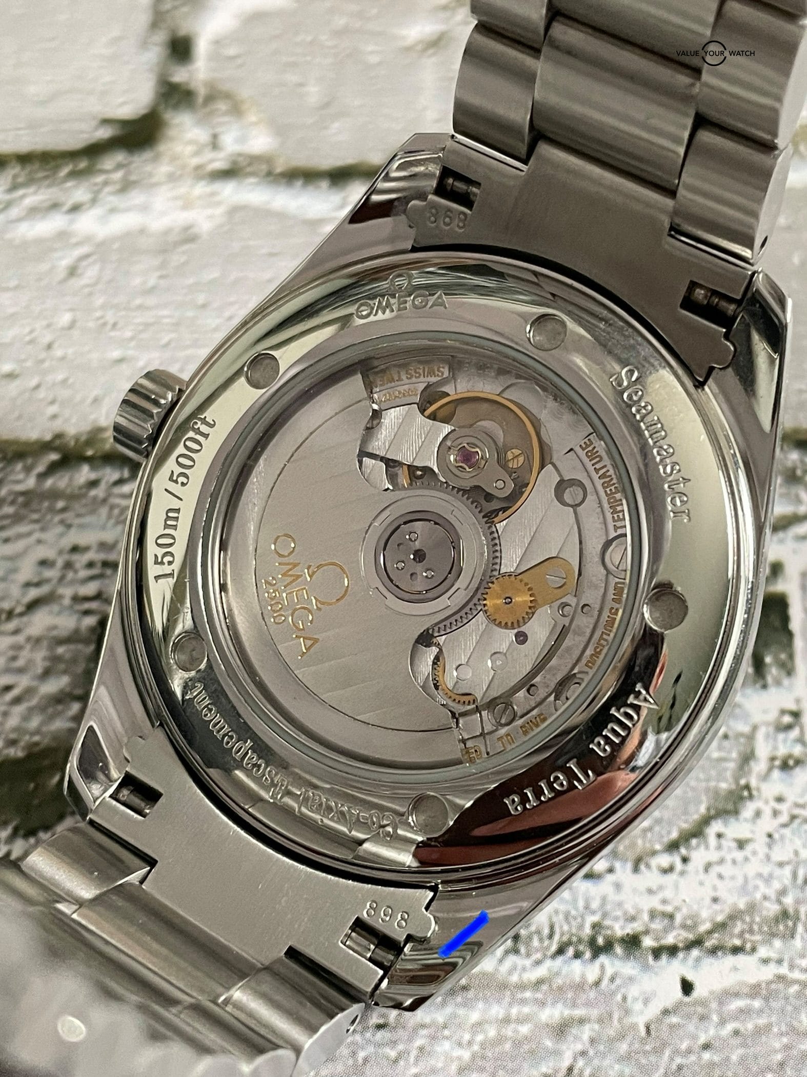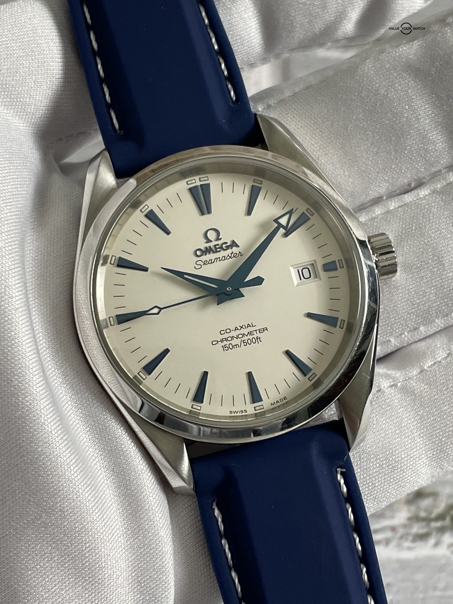 The most sought after of the 39mm Aqua Terra’s of its generation is today one of the hardest to find, and its value just continues to rise. Once you’ve seen this dial in the flesh you won’t forget it. The way the blue hands, raised Omega logo and hour indices come to life against the white dial in the sun is absolutely stunning! It has Omega’s beautifully designed hidden clasp on the bracelet under the Omega logo. This watch epitomizes versatility…an incredibly thin case allows it to tuck under any dress shirt cuff at the office but yet looks just as at home on a sunny day at the pool with the steel bracelet or with the dressed down blue rubber strap or vintage blue leather. As the name implies, this Aqua Terra is at home as much on land as in the water!