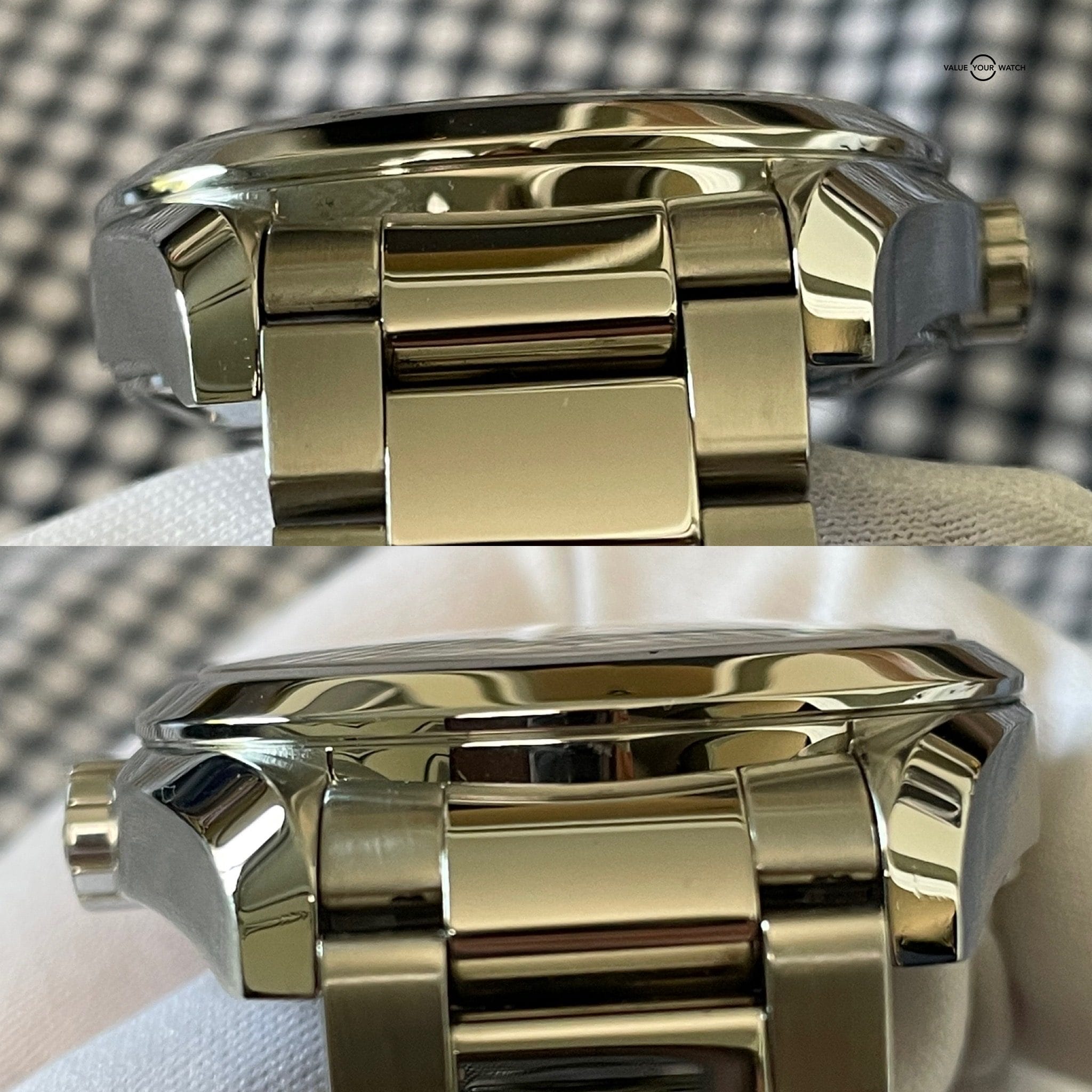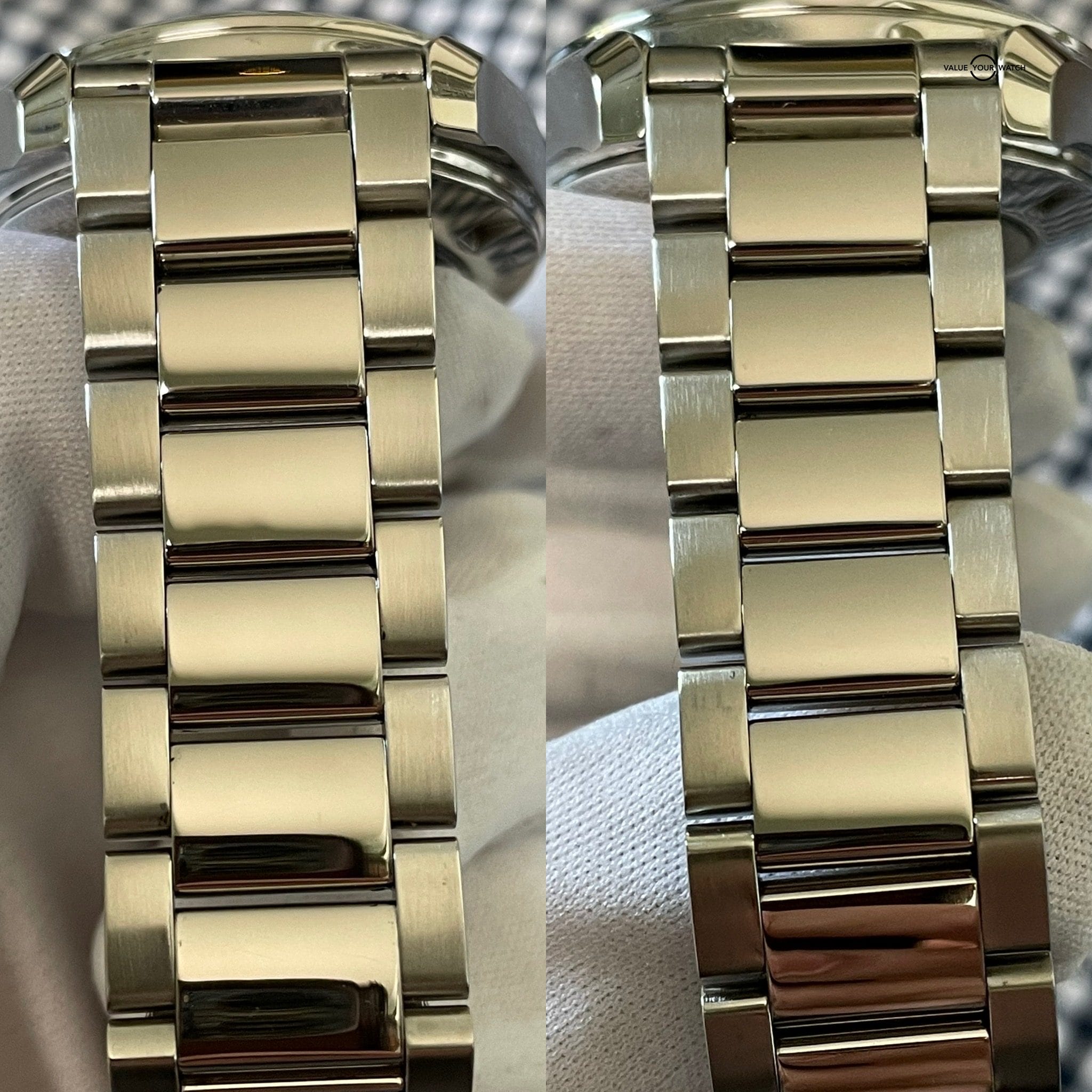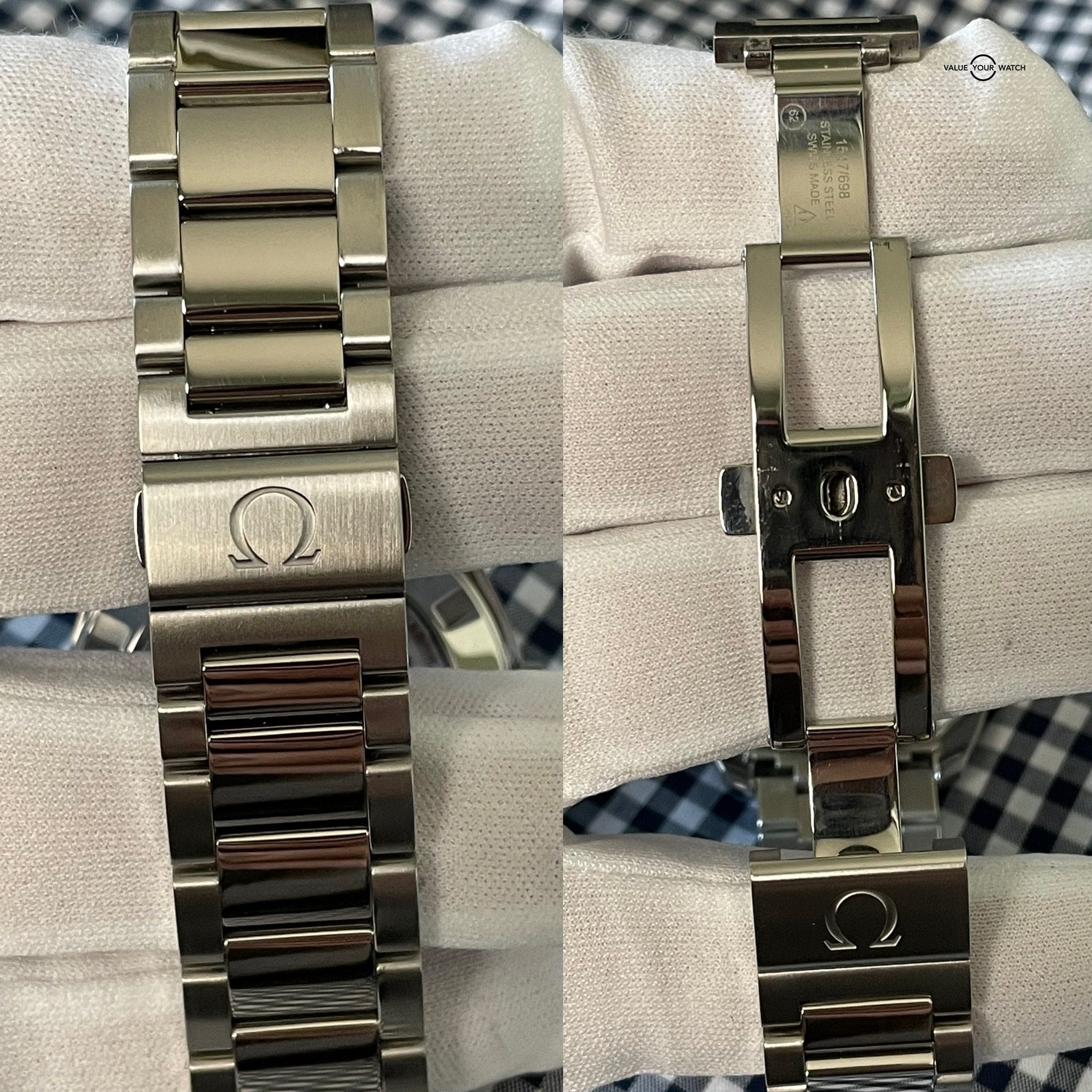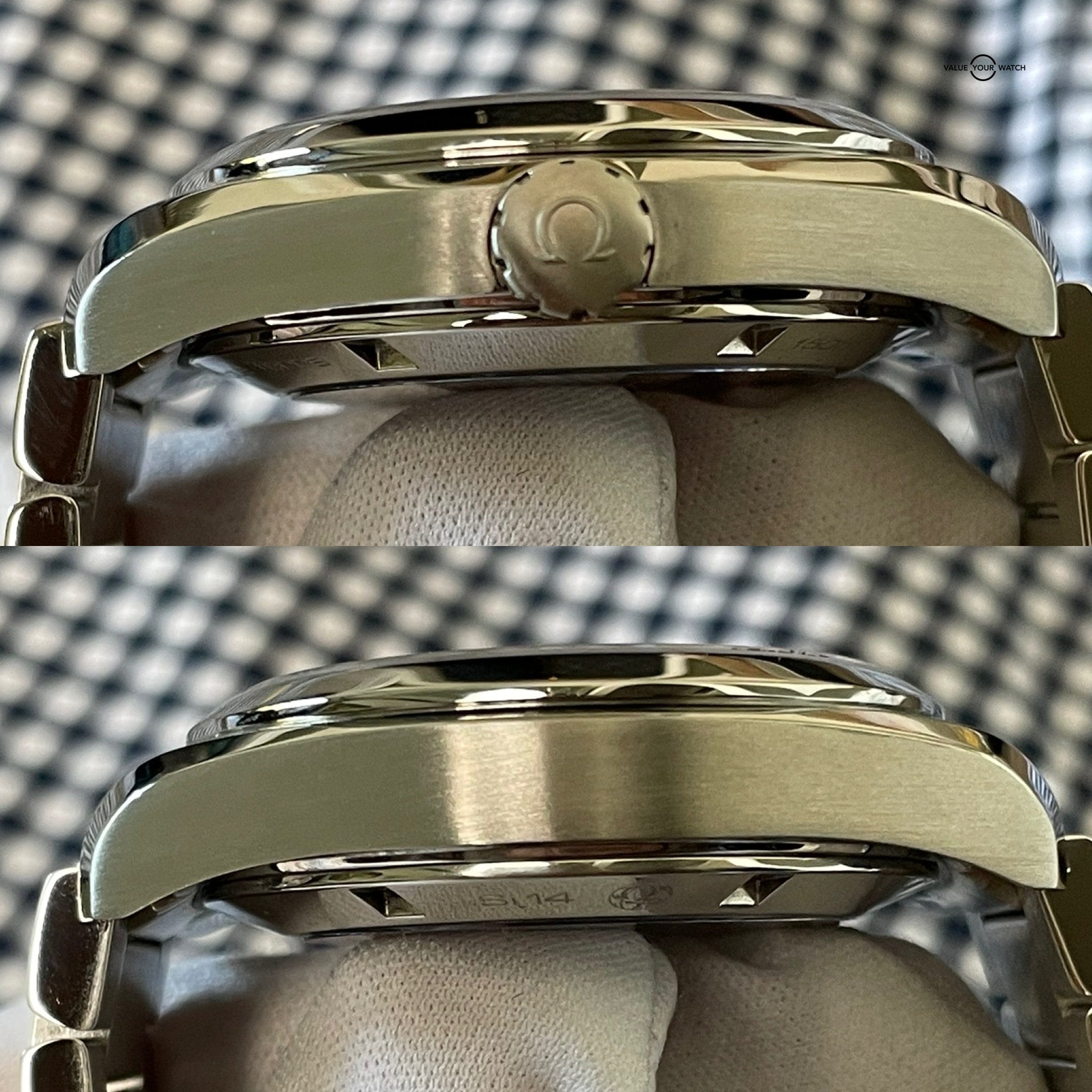 This watch is pre-owned in great shape. Has recently had a fresh polish on the high polish center links so shiny and reflective like you wouldn’t believe. Comes triple boxed with all boxes and papers, including the international warranty card. All bracelet links included as well. This is the best way to buy a pre-owned Omega!