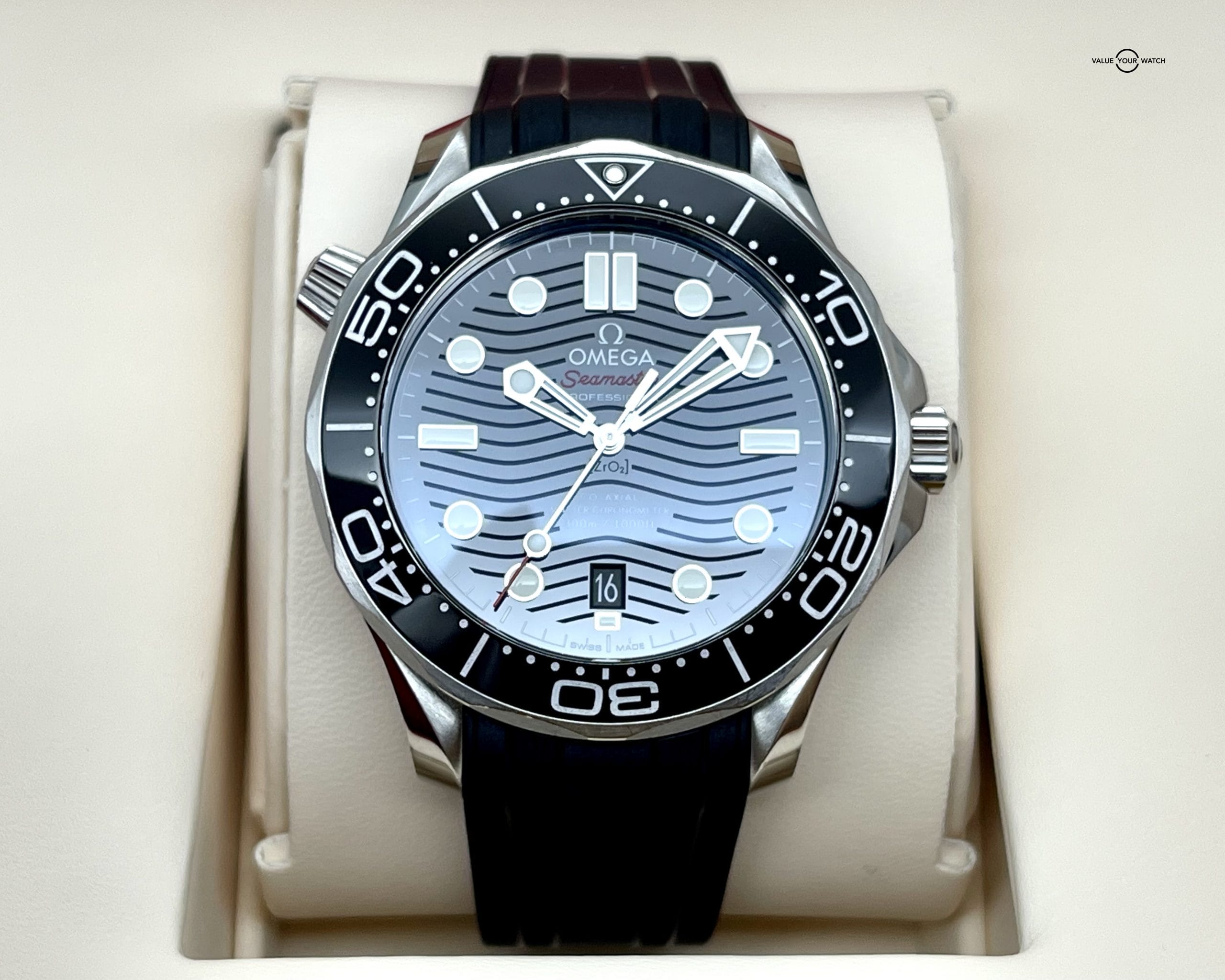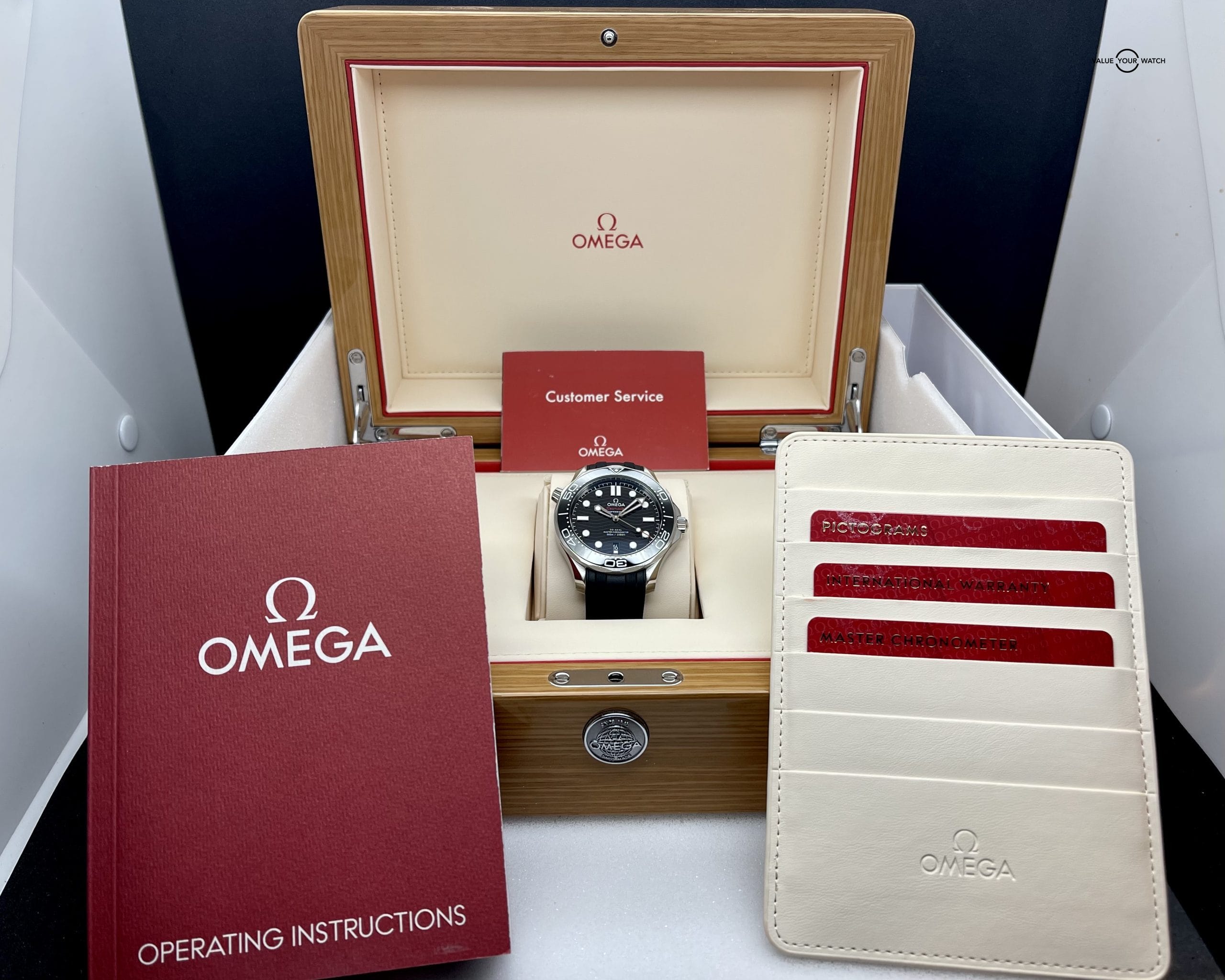 A Seamaster on a rubber dive strap is a classic staple for any collection. This watch comes with putter cardboard box, inner wooden box, operating instructions, customer service booklet, pictogram, internal warranty, and master chronometer cards. The rubber strap is in great shape, the case shows some slight scratching, the buckle has the usual desk wear, and the sapphire and bezel are flawless. The original retail price of this watch was $5,100. Get this beautiful pre-owned time piece before it’s gone!