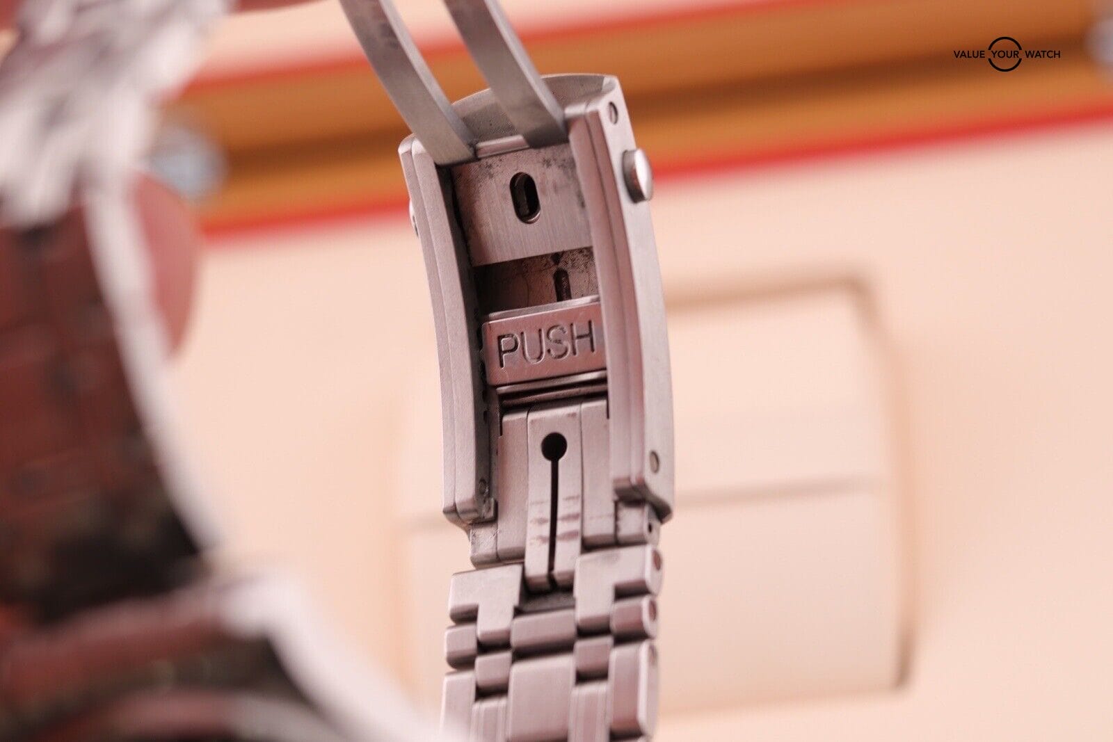 – Watch shows wear throughout via mostly hairline scratches, and handful of deeper scratches and a few flea bites scattered around. Crystal’s are both clean and movement is healthy. 7.5/10. A polish would freshin this one up well. See pics.