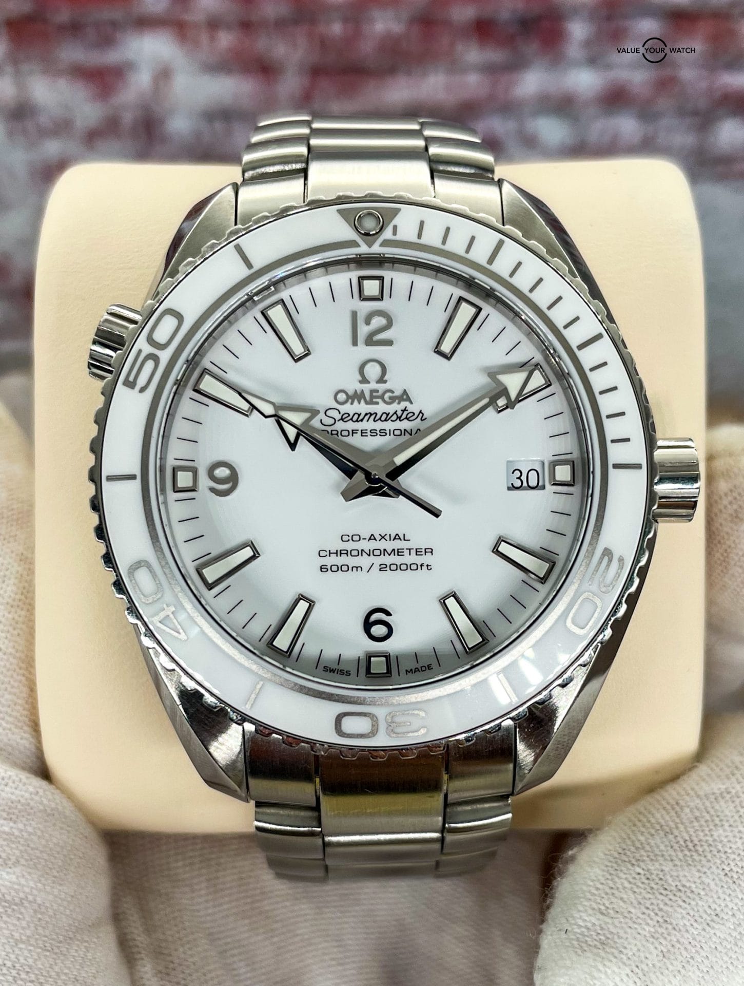 Offered by NoVA Watch Supply of Fairfax, VA: A good condition Omega Seamaster Planet Ocean 600M Co-Axial 42mm watch REF. 232.30.42.21.04.001, Circa 2014. This is a classic Omega design, but with the numerous color variations available in the Planet Ocean line up, this white dial with matching white ceramic bezel is a fun way to add a little pop of color, or should I say lack of color, to any Omega collection. This color combo, often referred to as the “The Great White” due to its all white dial and bezel, but possibly also because it’s also the perfect summer beach watch that loves swimming deep in the ocean with a 600M tolerance. This piece comes with the following: