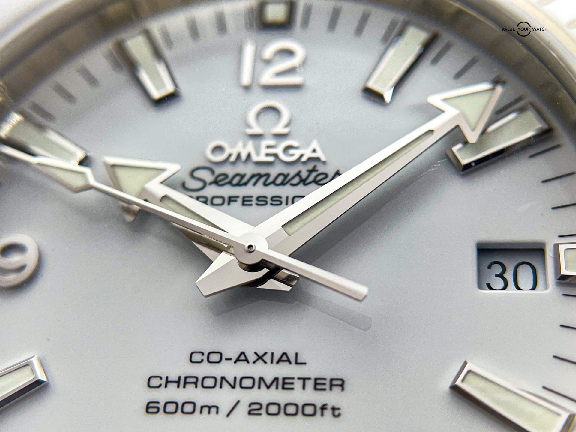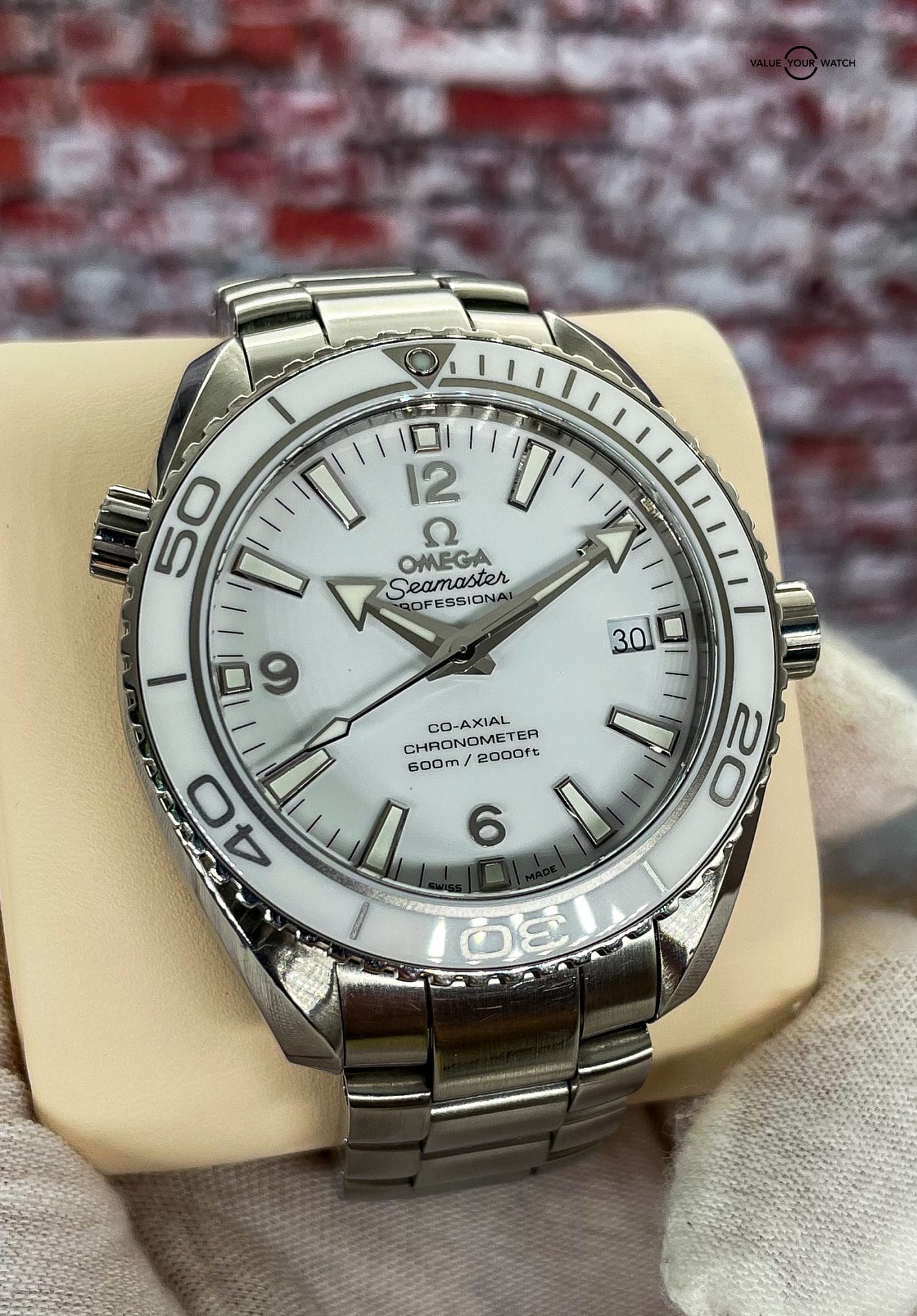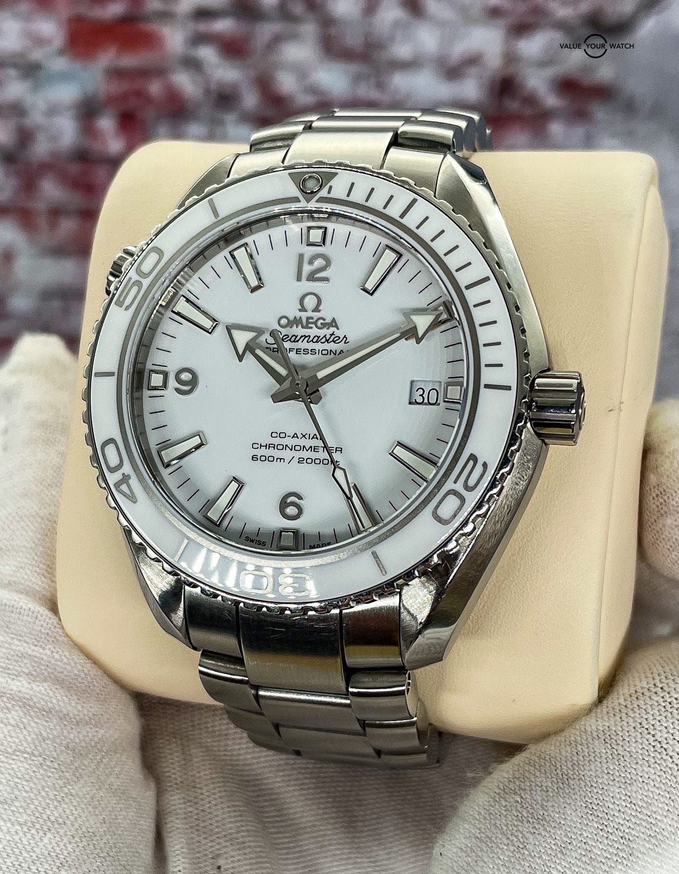 Offered by NoVA Watch Supply of Fairfax, VA: A good condition Omega Seamaster Planet Ocean 600M Co-Axial 42mm watch REF. 232.30.42.21.04.001, Circa 2014. This is a classic Omega design, but with the numerous color variations available in the Planet Ocean line up, this white dial with matching white ceramic bezel is a fun way to add a little pop of color, or should I say lack of color, to any Omega collection. This color combo, often referred to as the “The Great White” due to its all white dial and bezel, but possibly also because it’s also the perfect summer beach watch that loves swimming deep in the ocean with a 600M tolerance. This piece comes with the following: