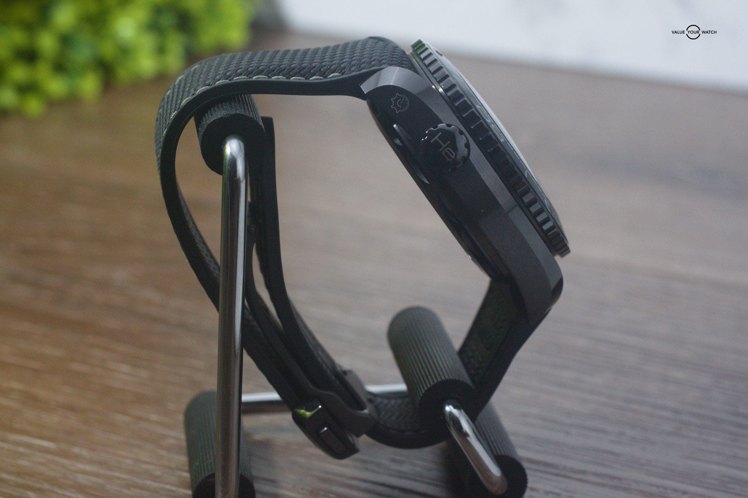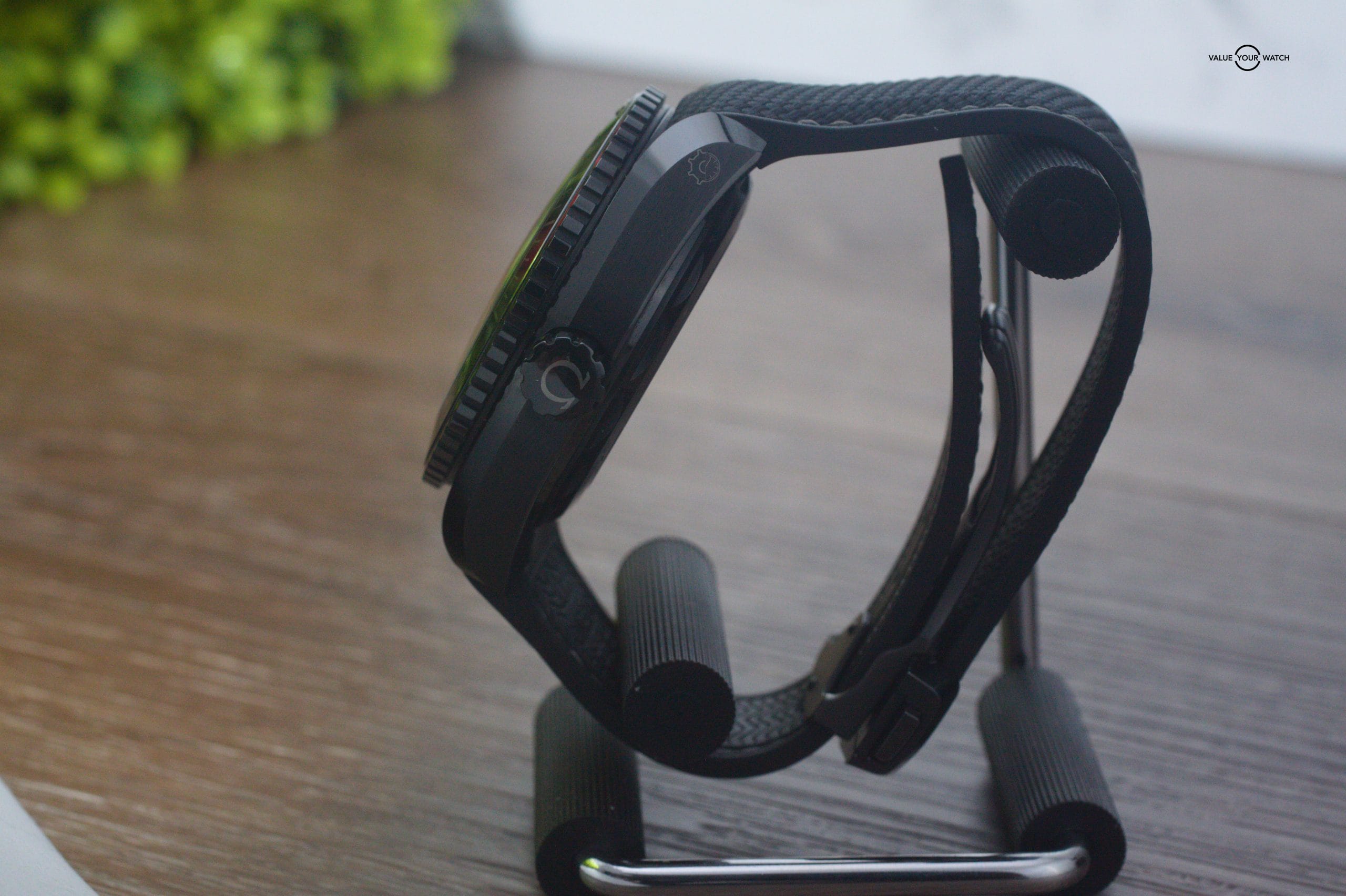 Reference number 215.92.46.22.01.001 originally came on a rubber strap with white stitching & a black titanium ceramic deployant buckle.