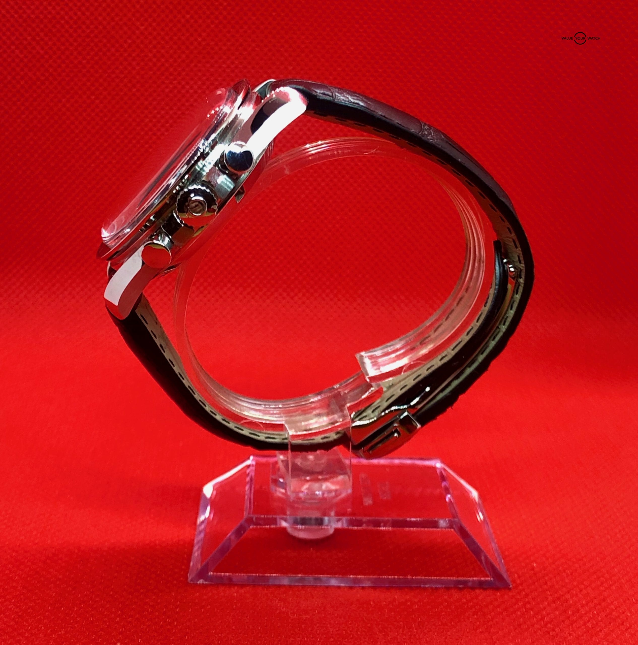 This watch has a beautiful black dial with the seconds subdial at the 3 o’clock position & the chronograph subdials at the 6 & 9 o’clock positions.The bezel with Tachymetre is flawless. The case is in exceptional cosmetic condition, with virtually no signs of use. The front crystal is clear & free of scratches.