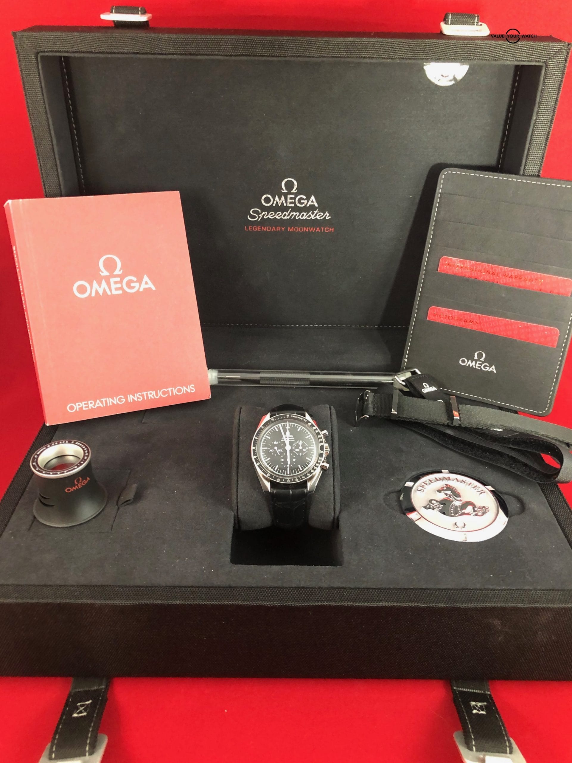 This watch comes “triple boxed” with the big cardboard presentation box & the canvas inner box, but also with the original Omega shipping box. This complete kit also includes the following: Omega loupe, Omega strap tool, Speedmaster Coin, Omega NATO strap, Omega Velcro strap, pictogram card, international warranty card, suede card holder, Operating Instructions Manual, Speedmaster books & original hang tags.