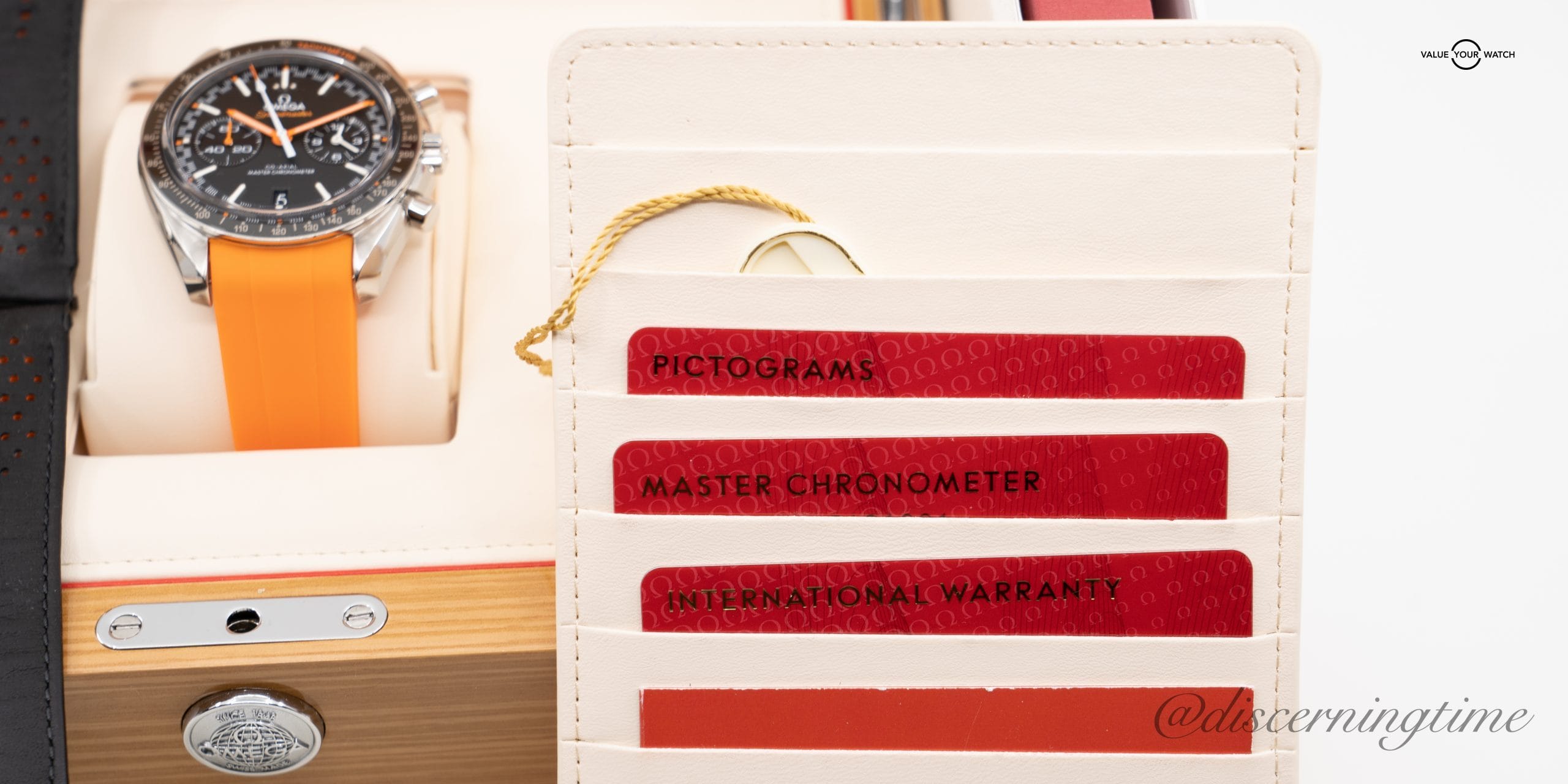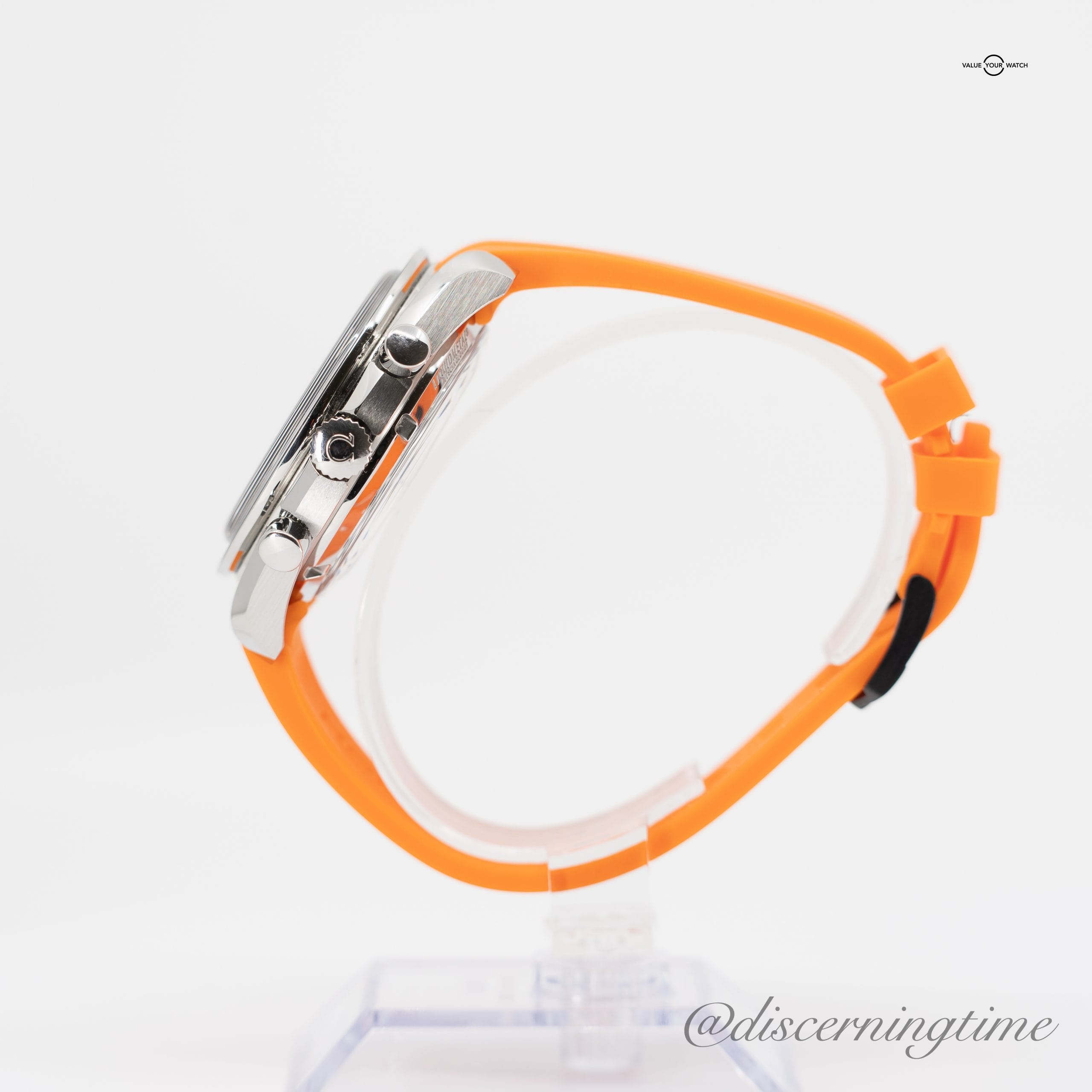 Packaging: Includes original box and all papers. Also includes perforated black leather strap with orange core and an additional black leather strap with steel Omega deployant buckle.