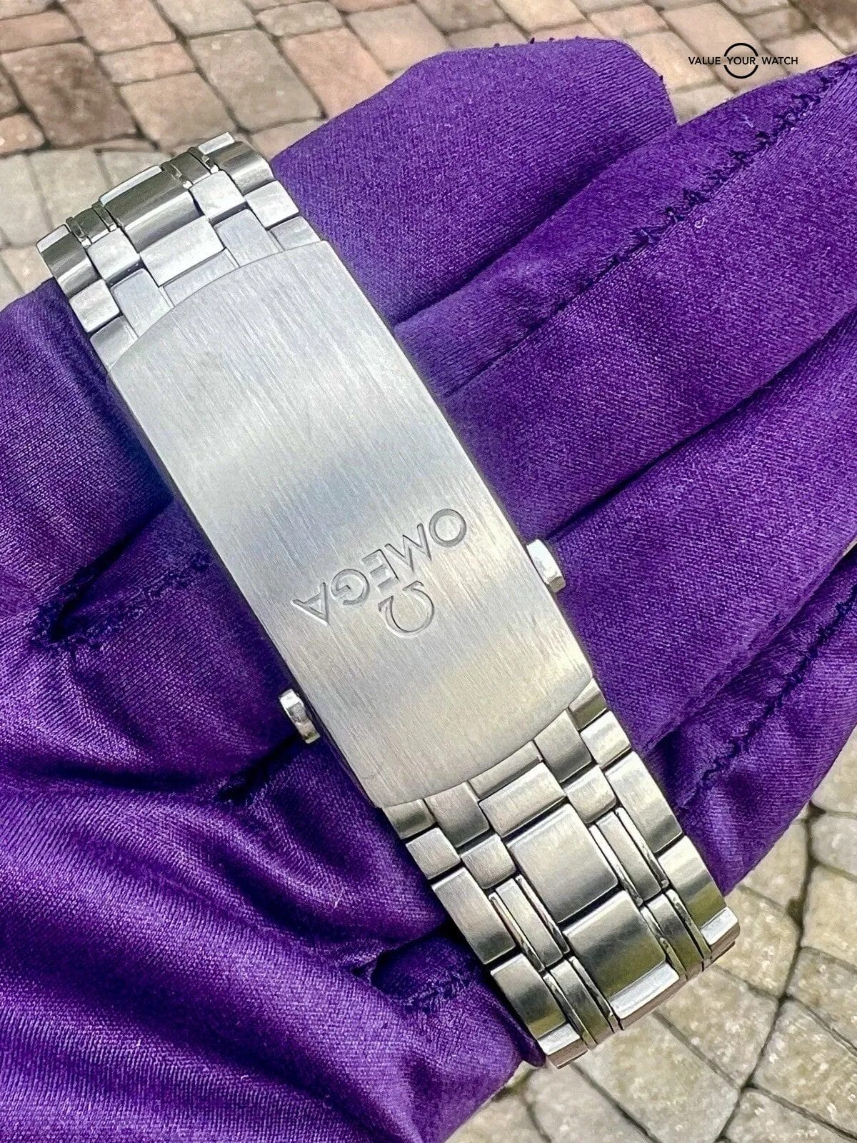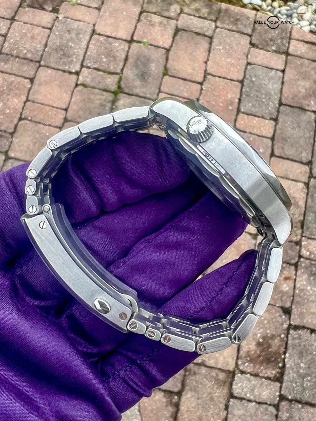 This watch comes as a complete set with the original box/cards and all of the links (removed are in a bag and were never worn). There are some minor hairline scratches that could easily be polished out if desired for $100, but I would wear as is. They are not really noticeable on your wrist.