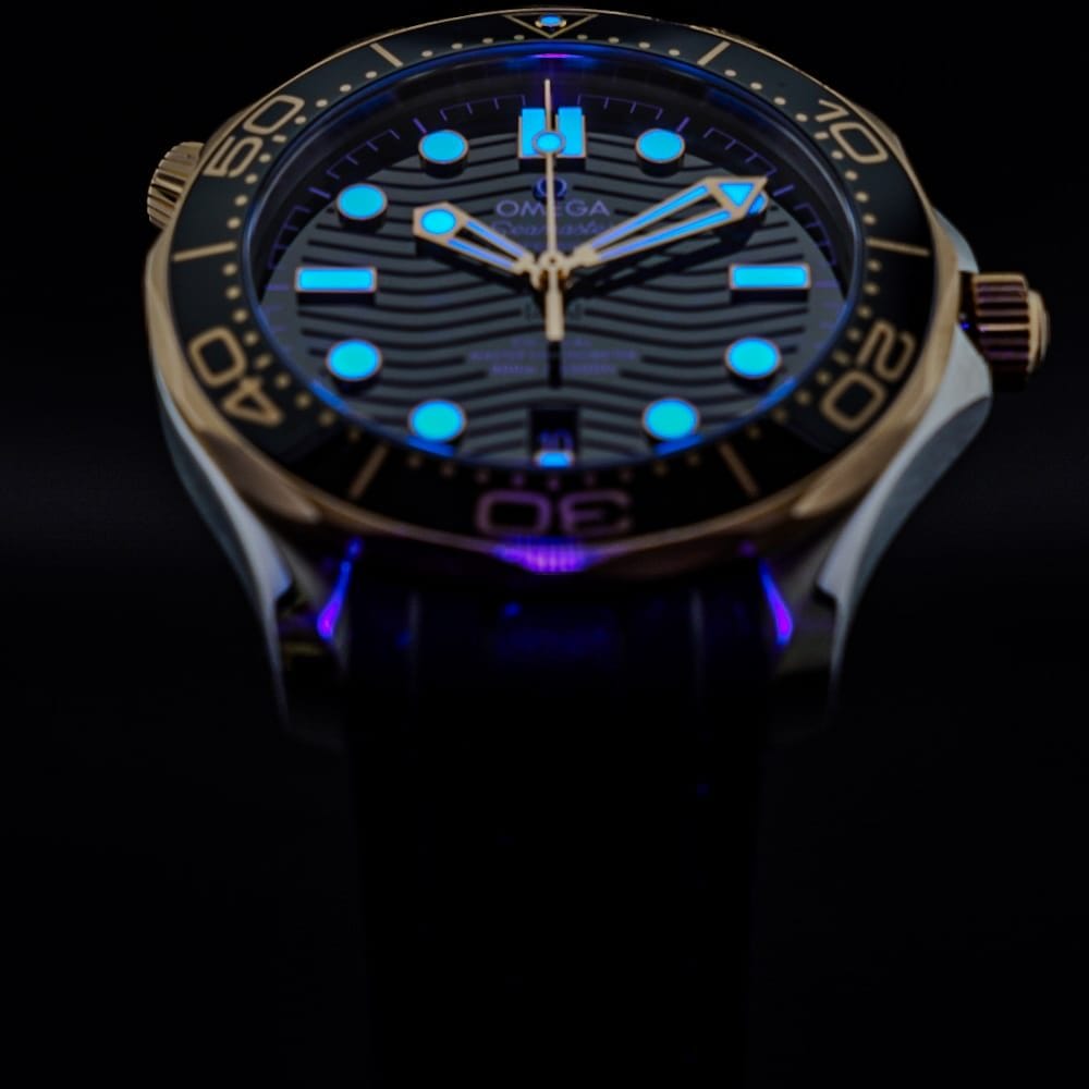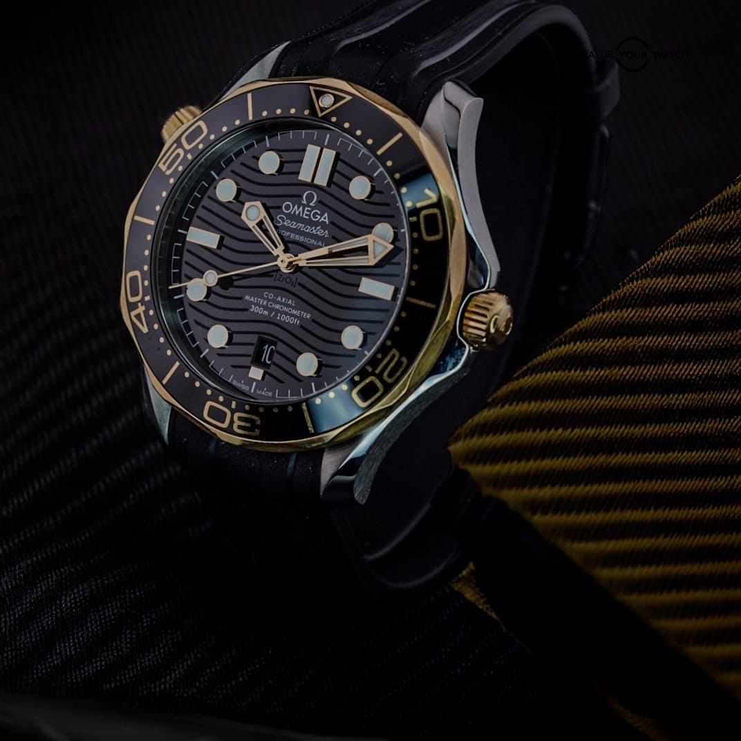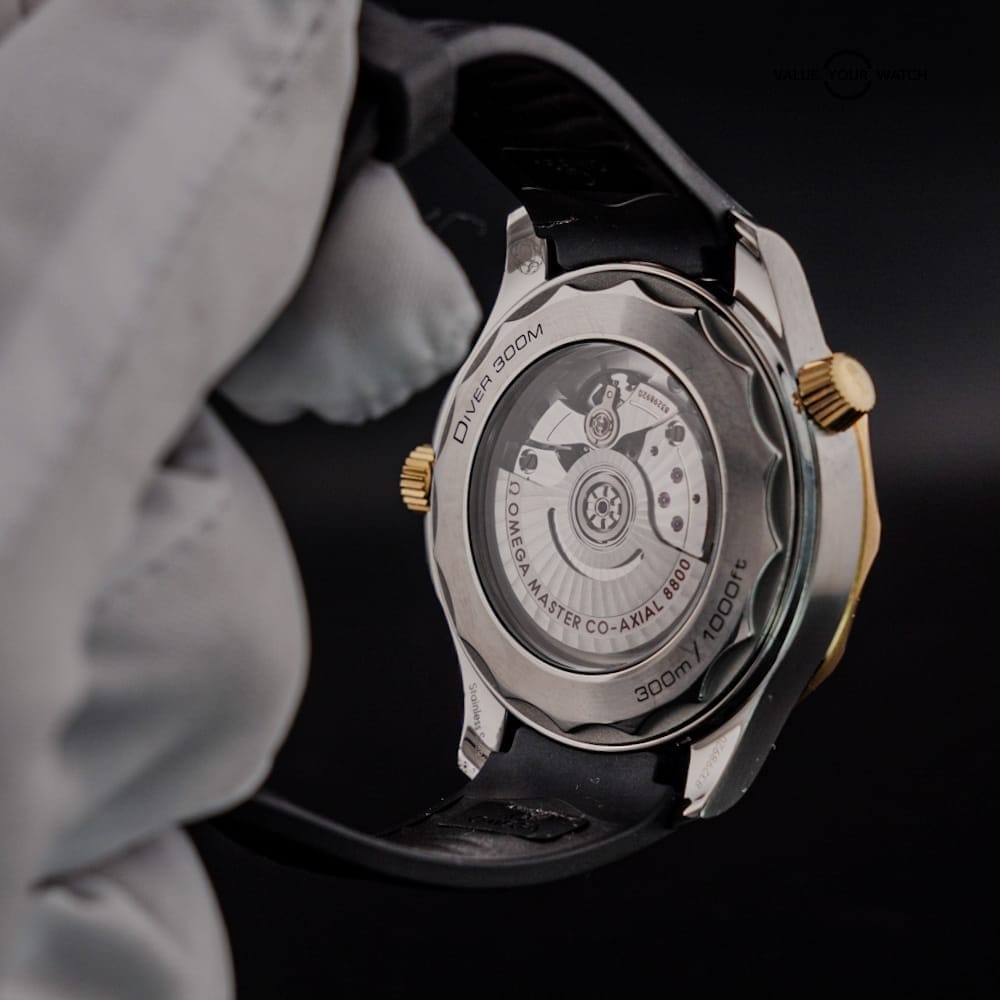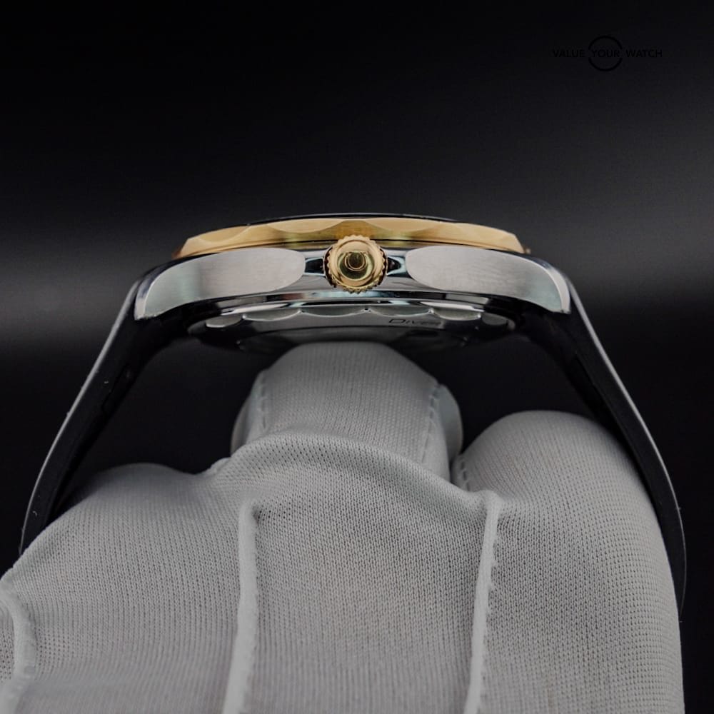 Stainless steel case with a black rubber strap. Uni-directional rotating 18kt yellow gold bezel with a black ceramic ring. Black dial with 18kt yellow gold skeleton hands and dot hour markers. Minute markers around the outer rim. Dial Type: Analog. Luminescent hands and markers. Date display at the 6 o’clock position. Omega calibre 8800 automatic movement, containing 35 Jewels, bitting at 25200 vph