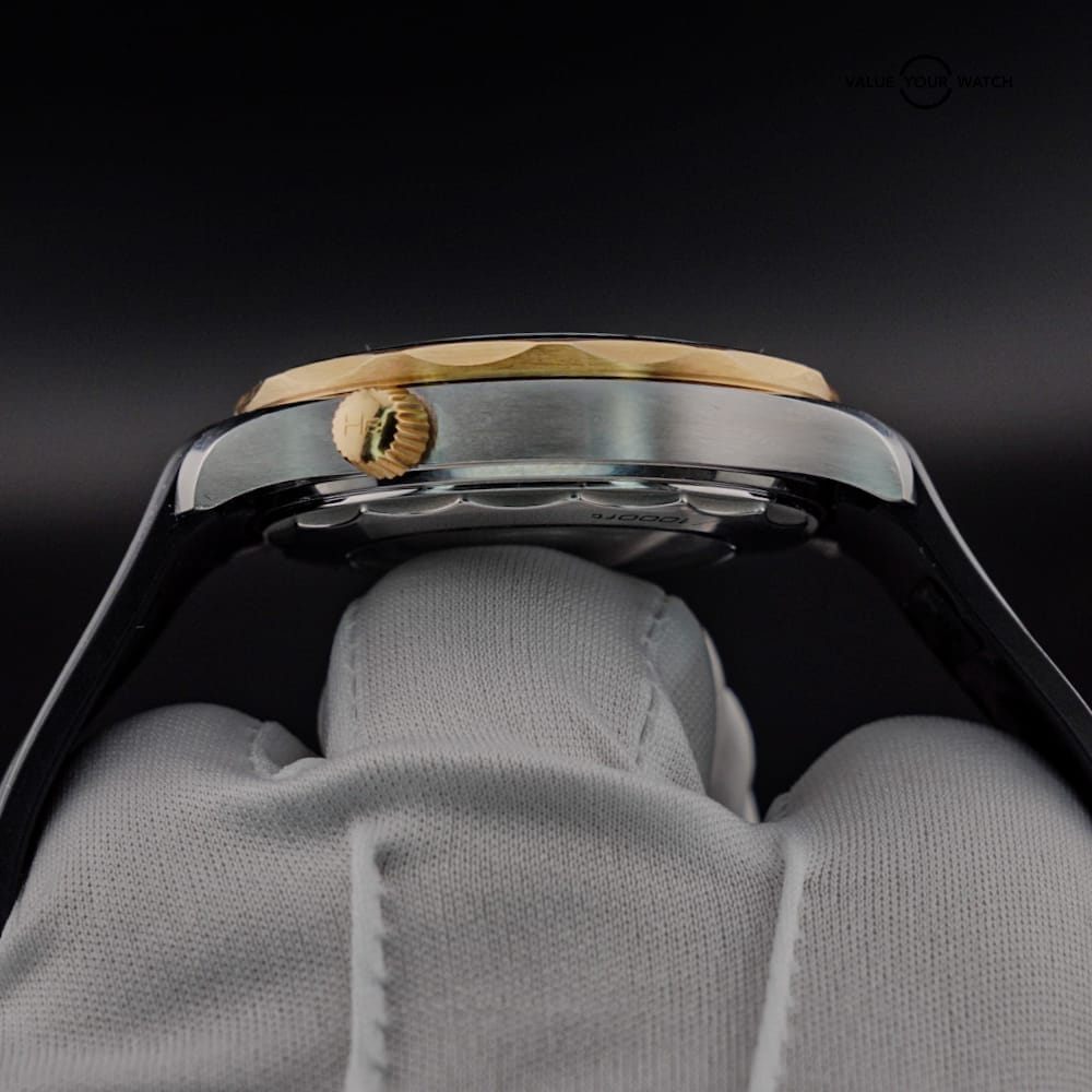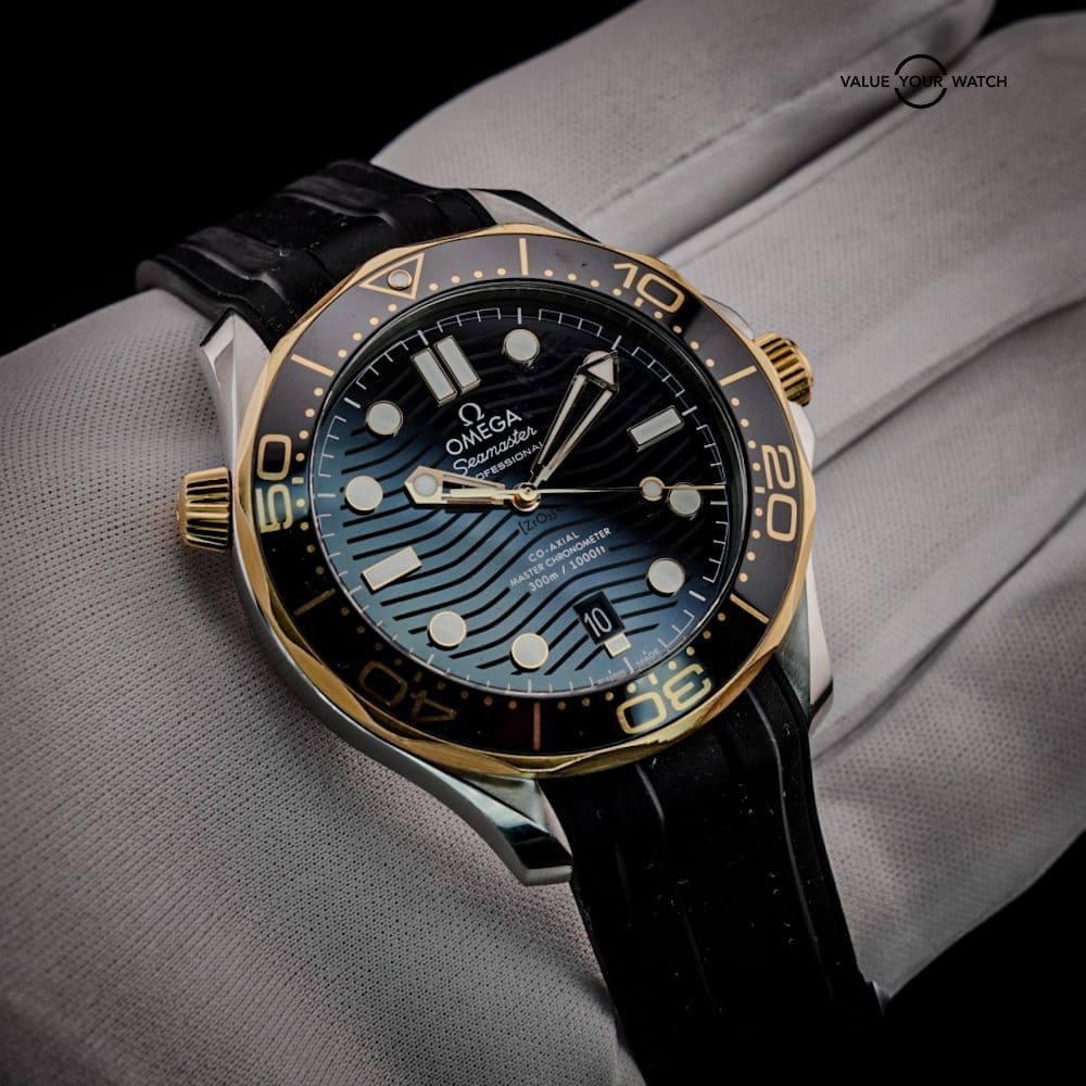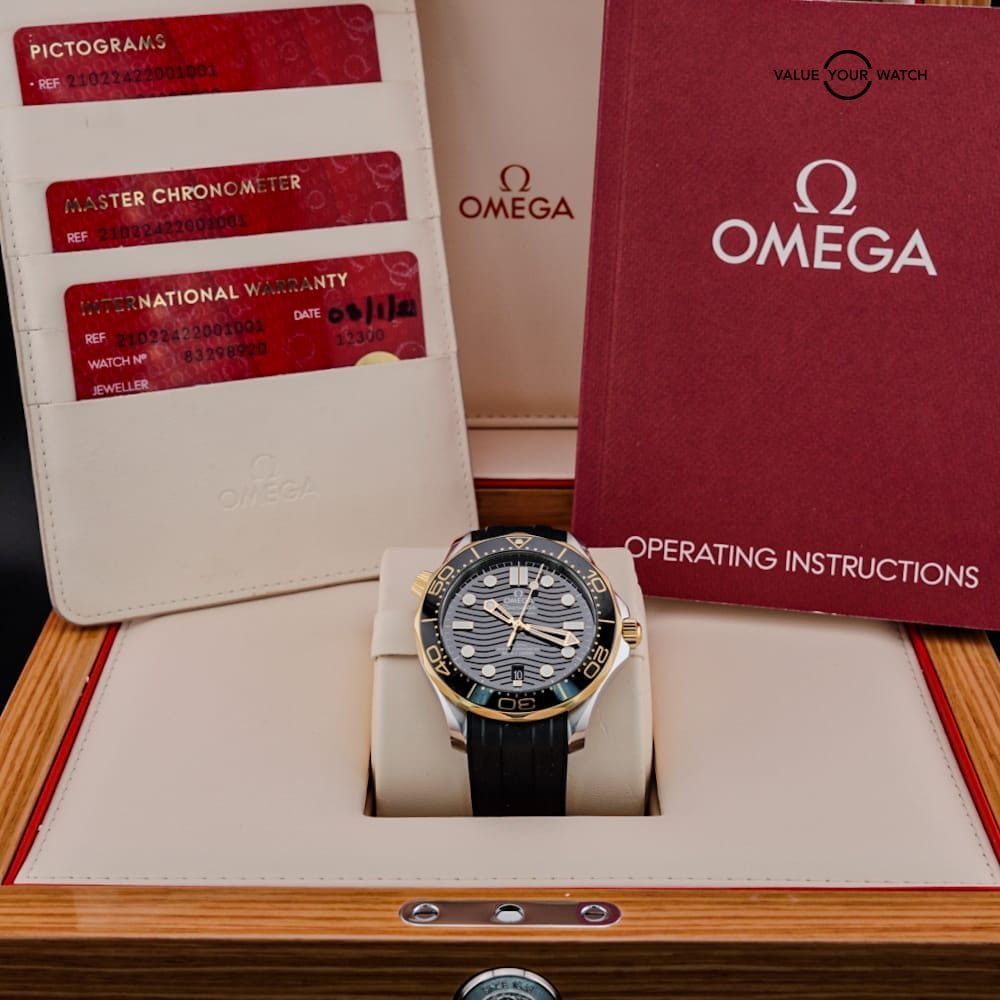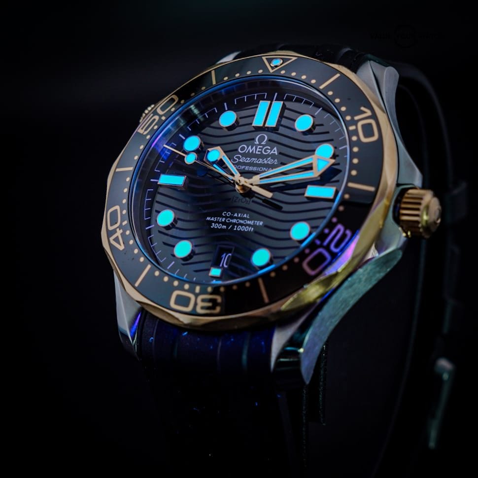 Stainless steel case with a black rubber strap. Uni-directional rotating 18kt yellow gold bezel with a black ceramic ring. Black dial with 18kt yellow gold skeleton hands and dot hour markers. Minute markers around the outer rim. Dial Type: Analog. Luminescent hands and markers. Date display at the 6 o’clock position. Omega calibre 8800 automatic movement, containing 35 Jewels, bitting at 25200 vph