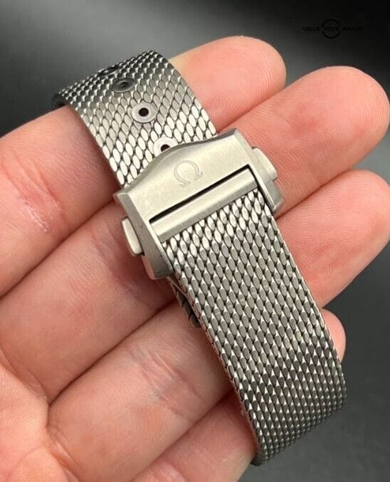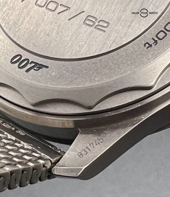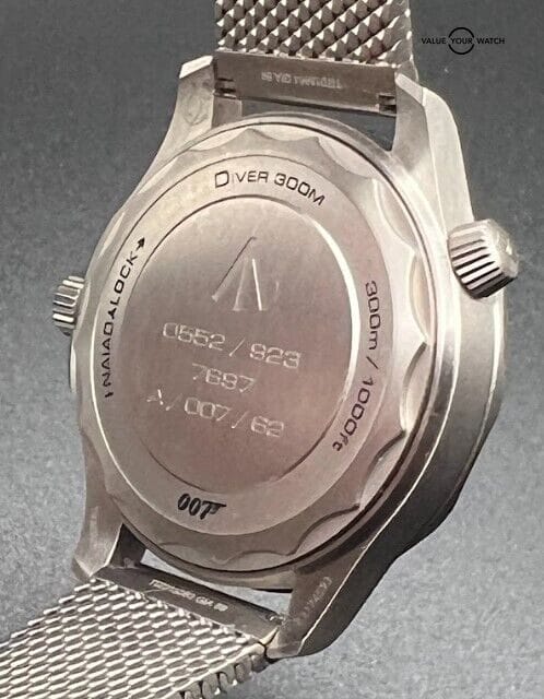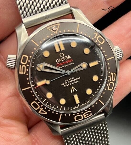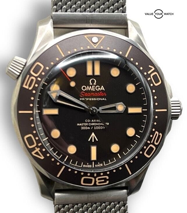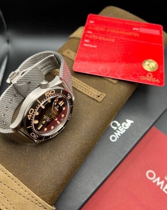 Complete collector set Omega Seamaster 300m James Bond No Time To Die edition. Titanium bracelet is the shorter of the two versions available. Bracelet will fit small wrists up to approximately a 7.25″ wrist.